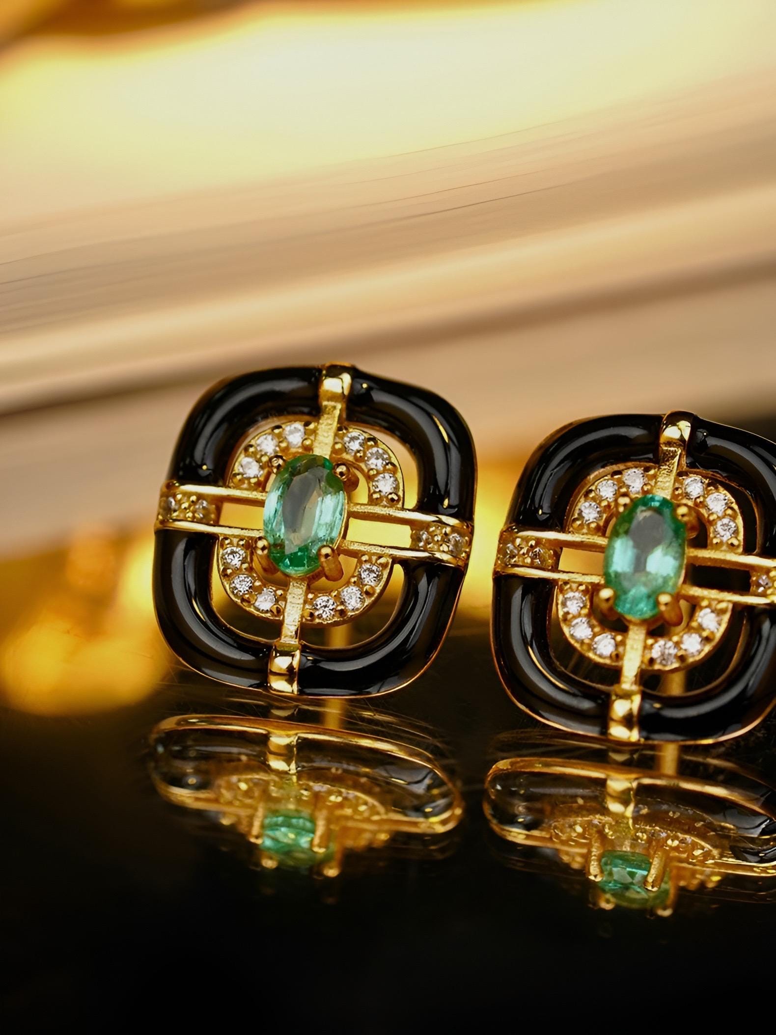 Materials: 18k gold vermeil with pure 92.5 Sterling Silver , natural emerald, natural zircon, Black Enamel
