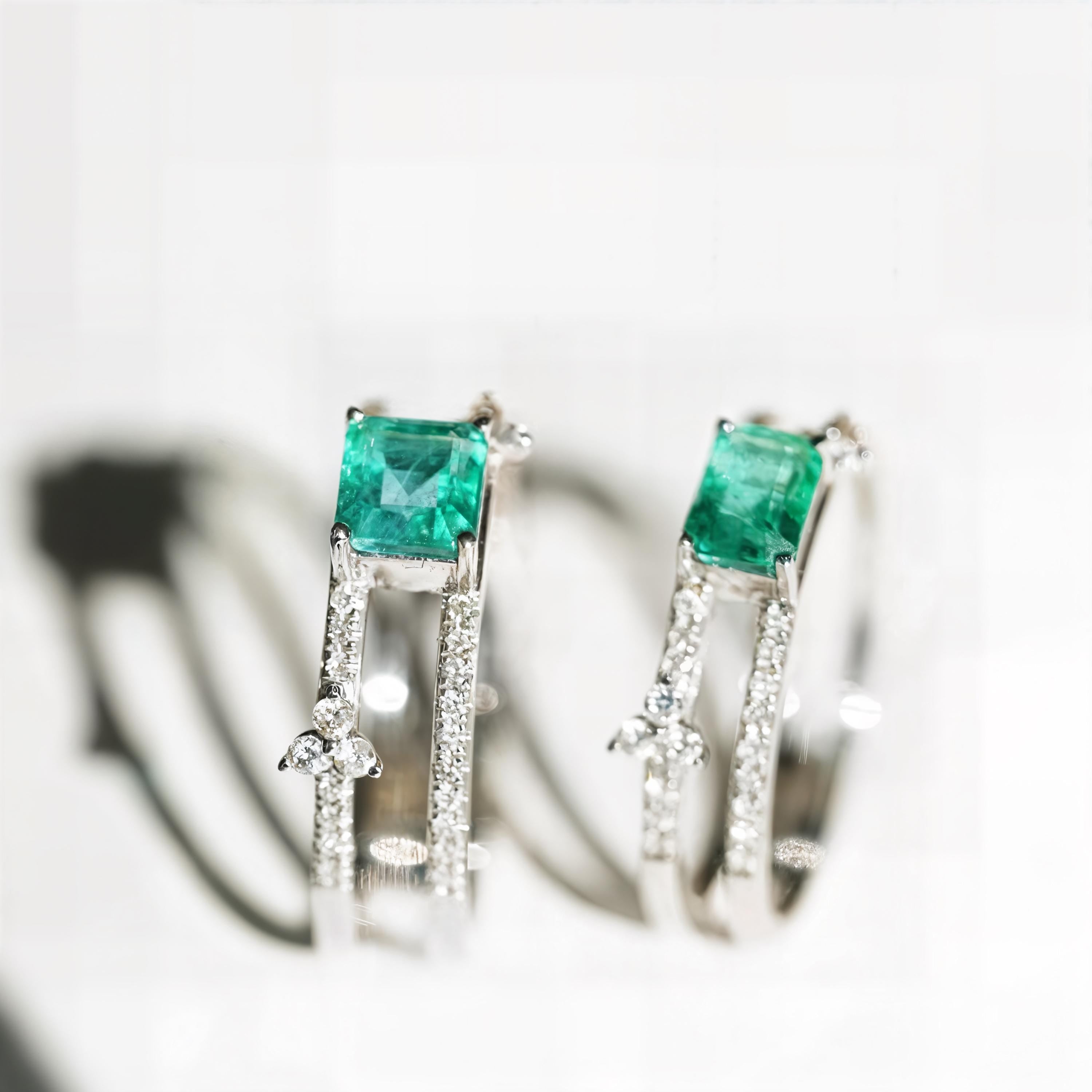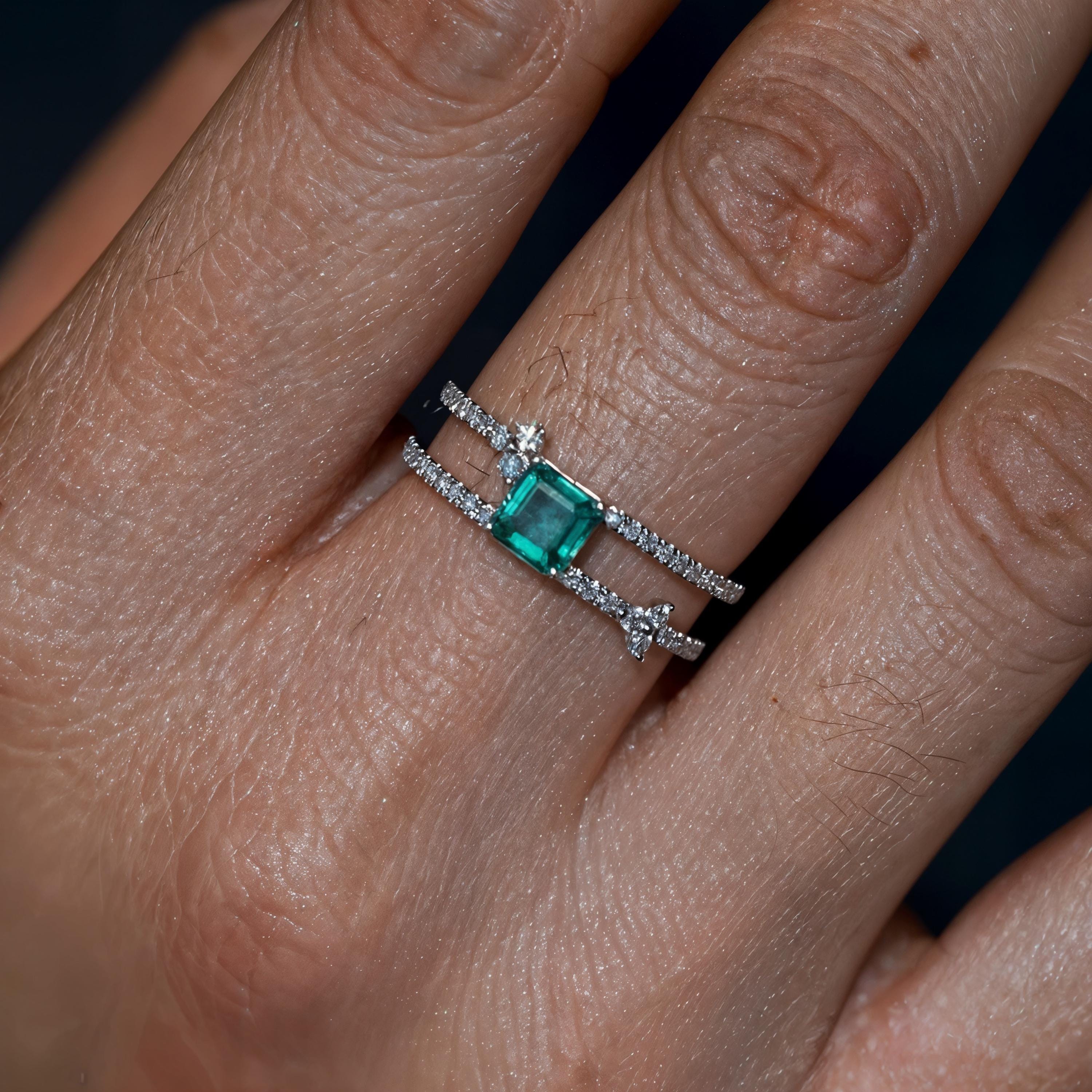 Crafted in solid 18K white gold, this elegant ring features a natural 0.57 carat square-cut emerald, celebrated for its rich color and luminous clarity. Accented with natural diamonds, the design strikes a balance between timeless charm and modern refinement.