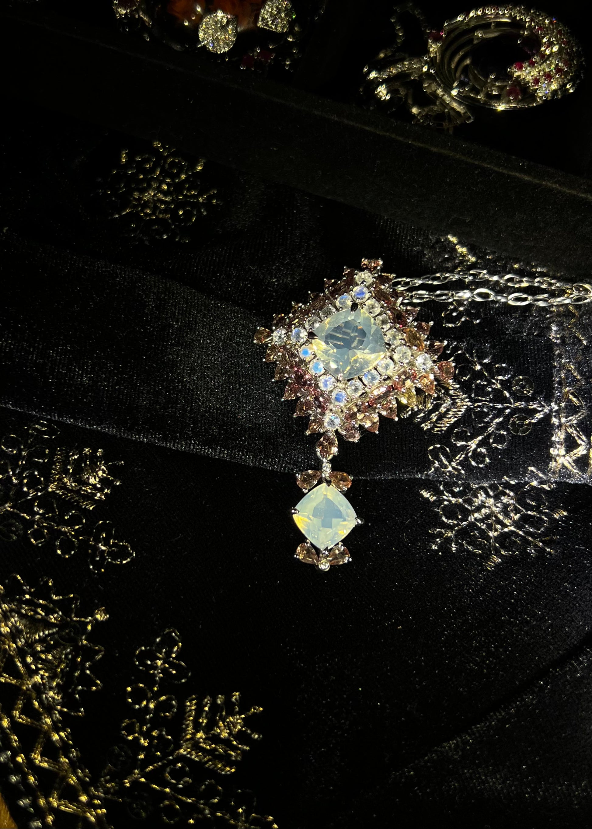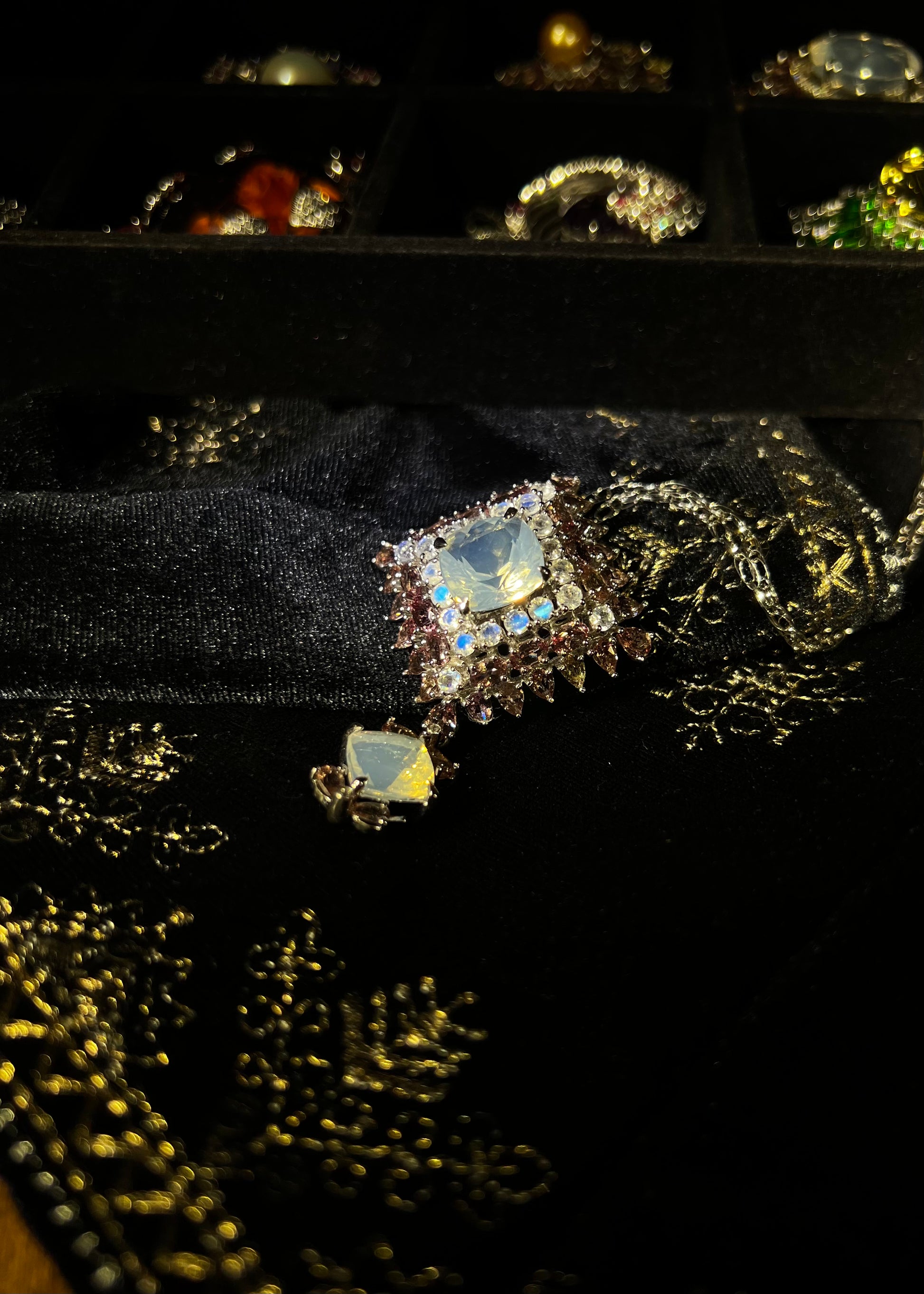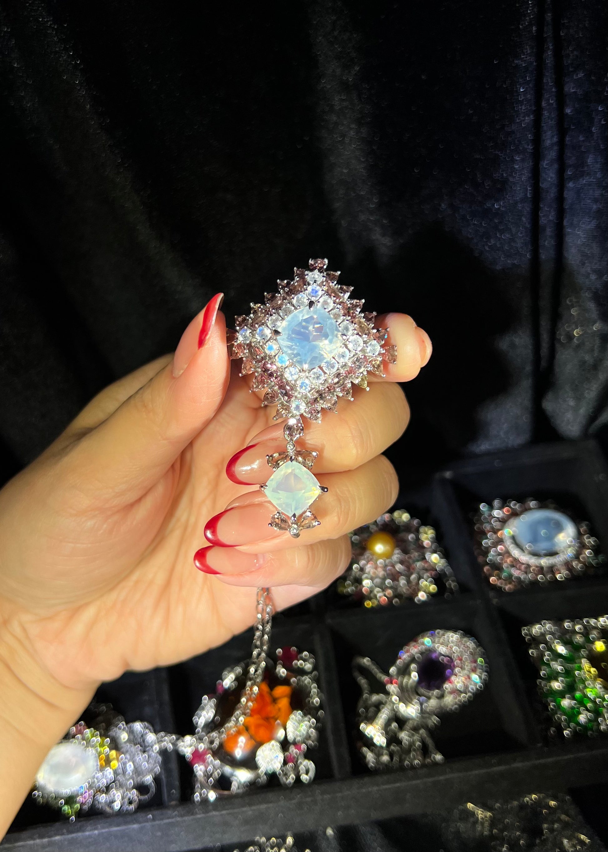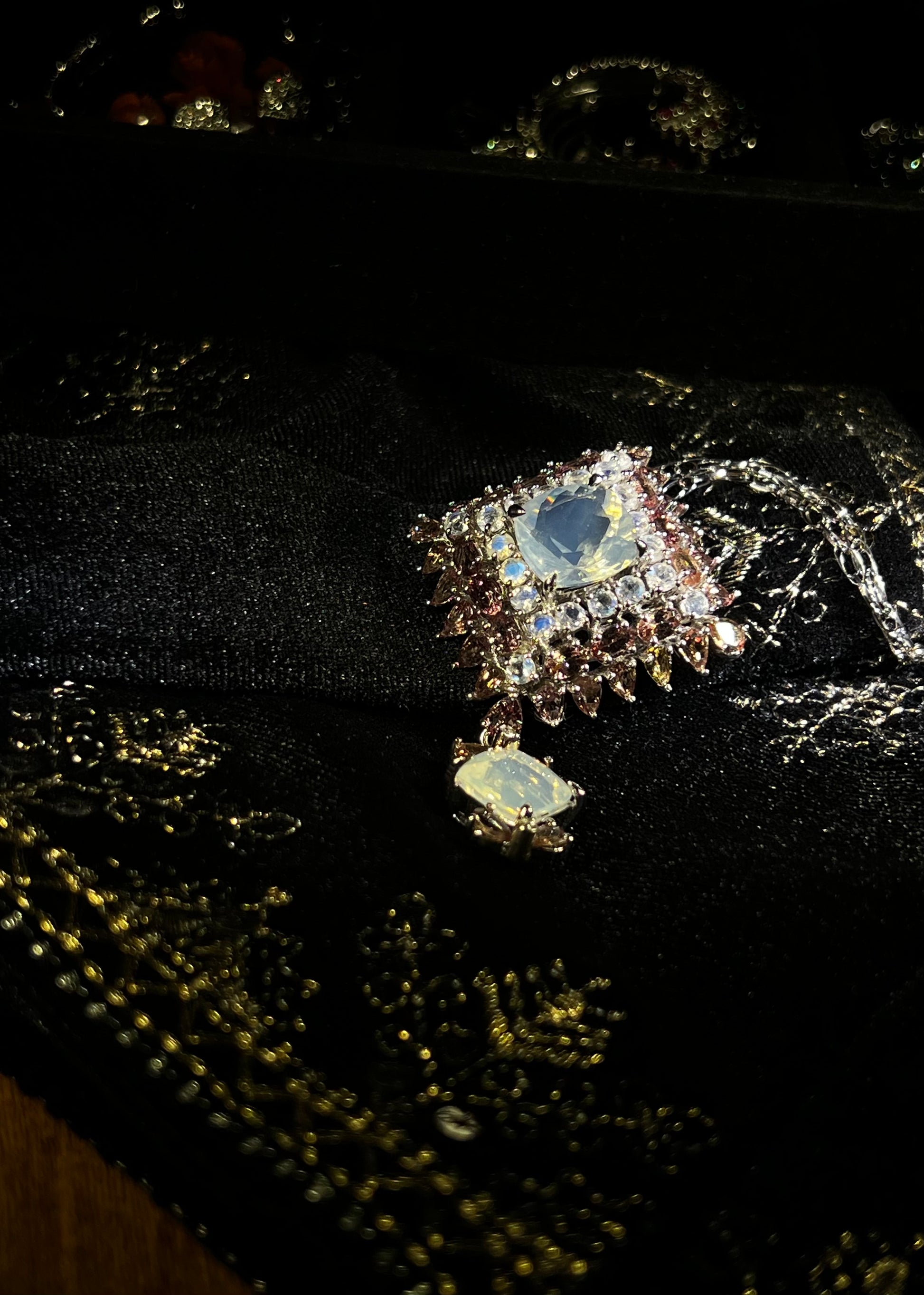 Inspired by the legendary magic carpet from One Thousand and One Nights, this exquisite piece captures the essence of adventure and mystery. At its heart lies a captivating 11.5-carat water opal, glowing like a pool of shimmering light. Surrounding it, 1.25 carats of moonstones bring moonlit skies, while 5.8 carats of color-change garnets mirror the shifting hues of desert sands, transitioning and shimmering.