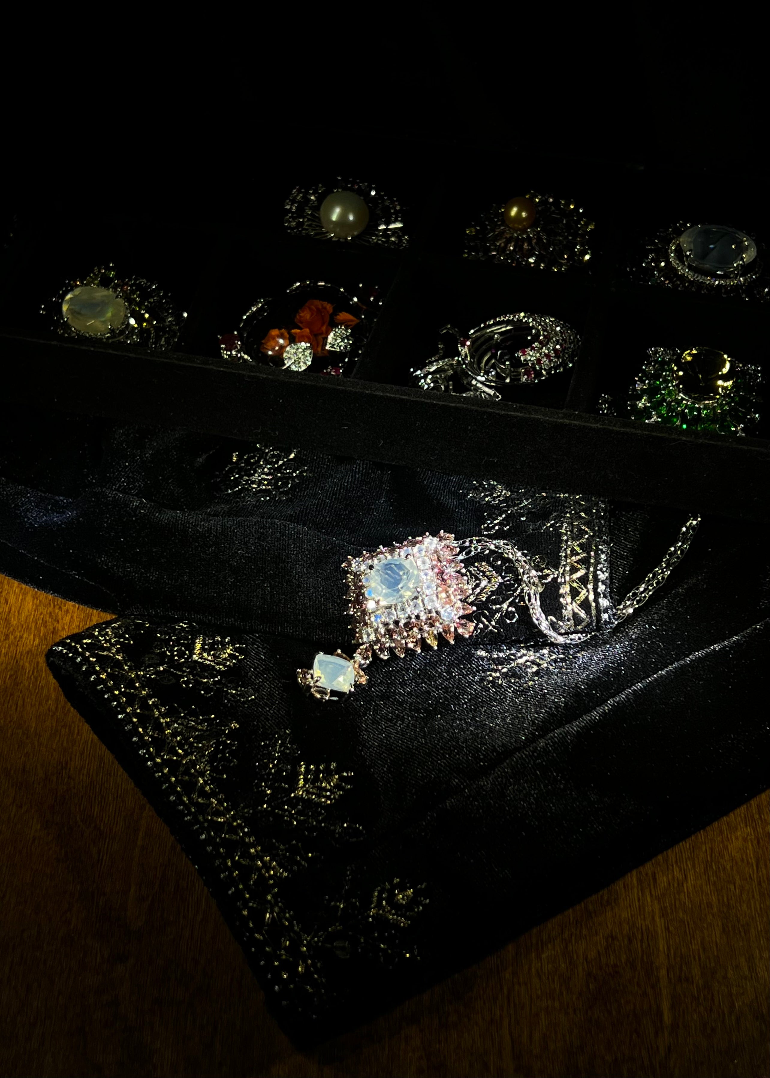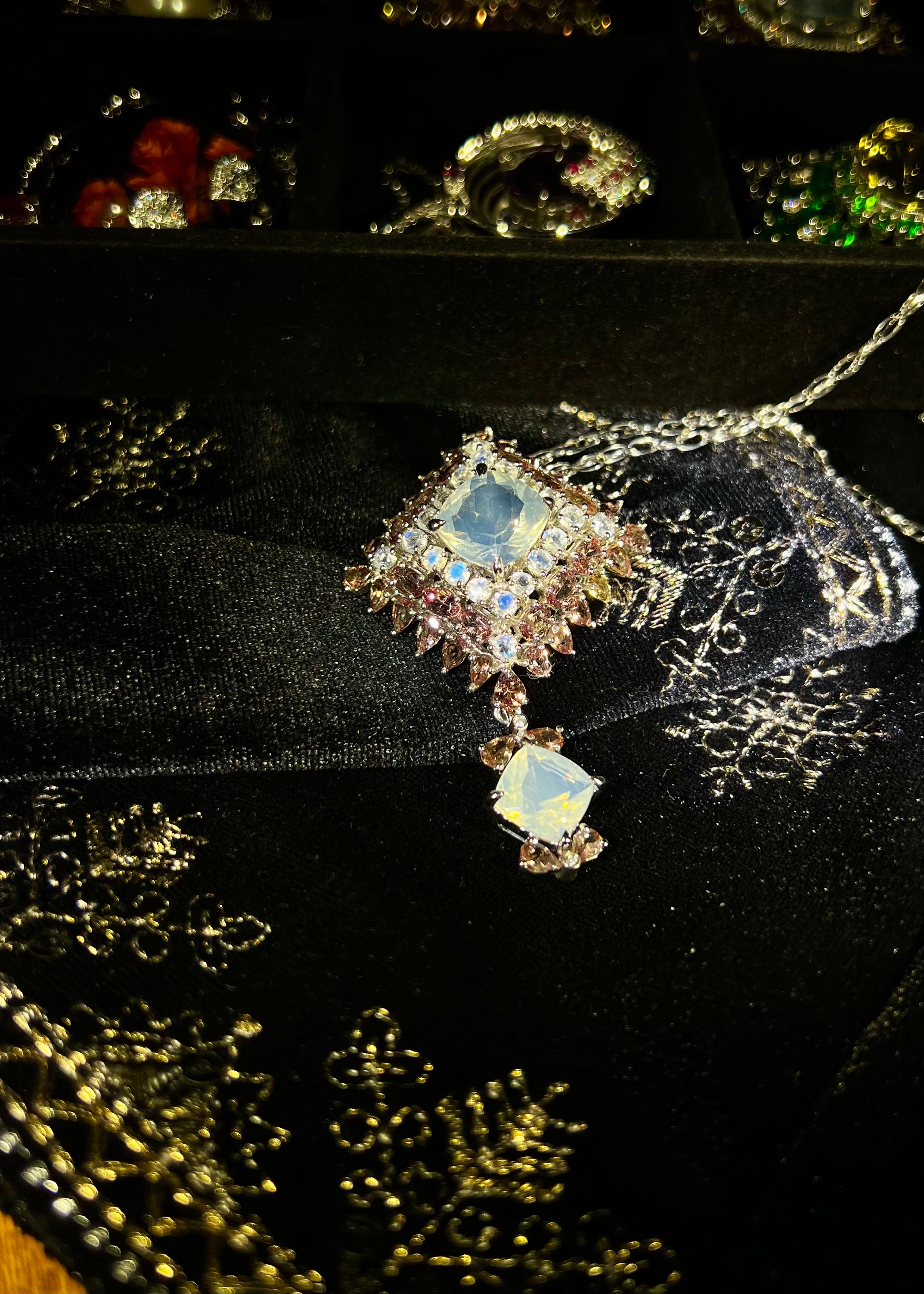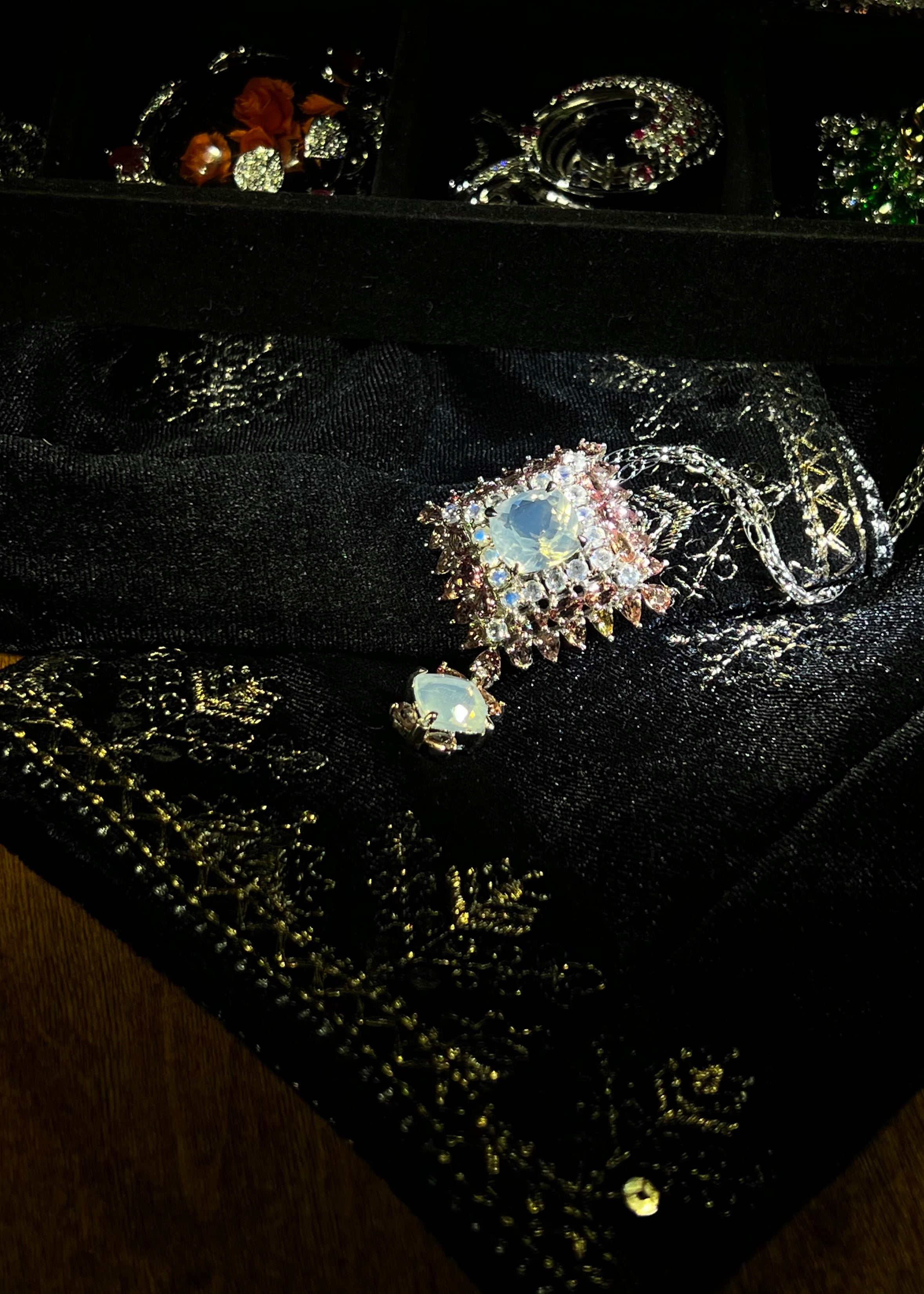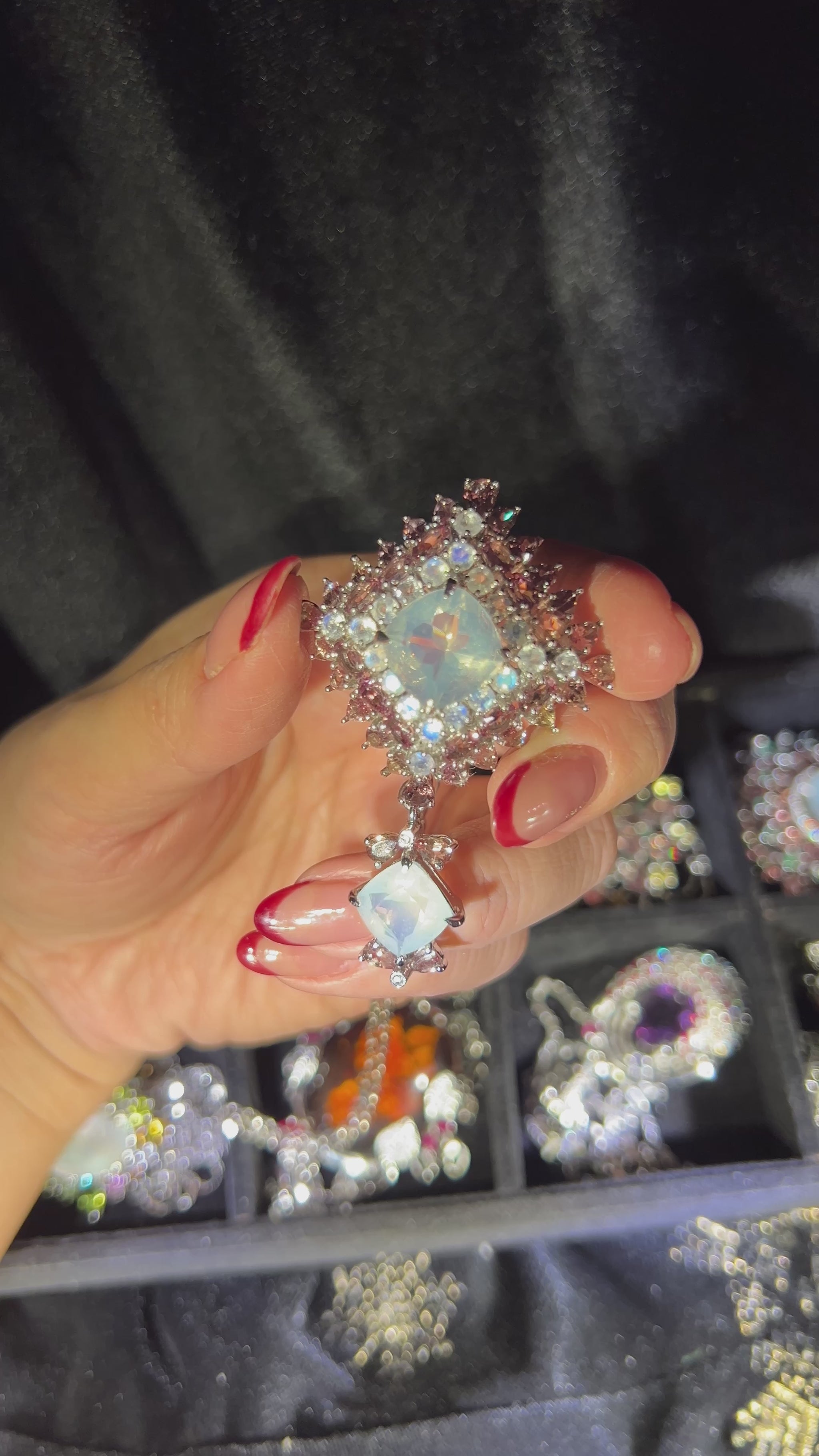 Inspired by the legendary magic carpet from One Thousand and One Nights, this exquisite piece captures the essence of adventure and mystery. At its heart lies a captivating 11.5-carat water opal, glowing like a pool of shimmering light. Surrounding it, 1.25 carats of moonstones bring moonlit skies, while 5.8 carats of color-change garnets mirror the shifting hues of desert sands, transitioning and shimmering.