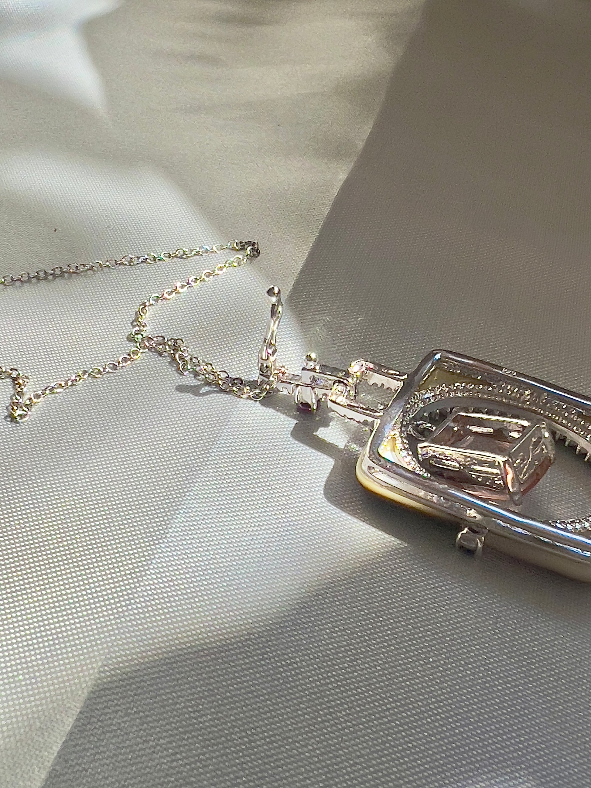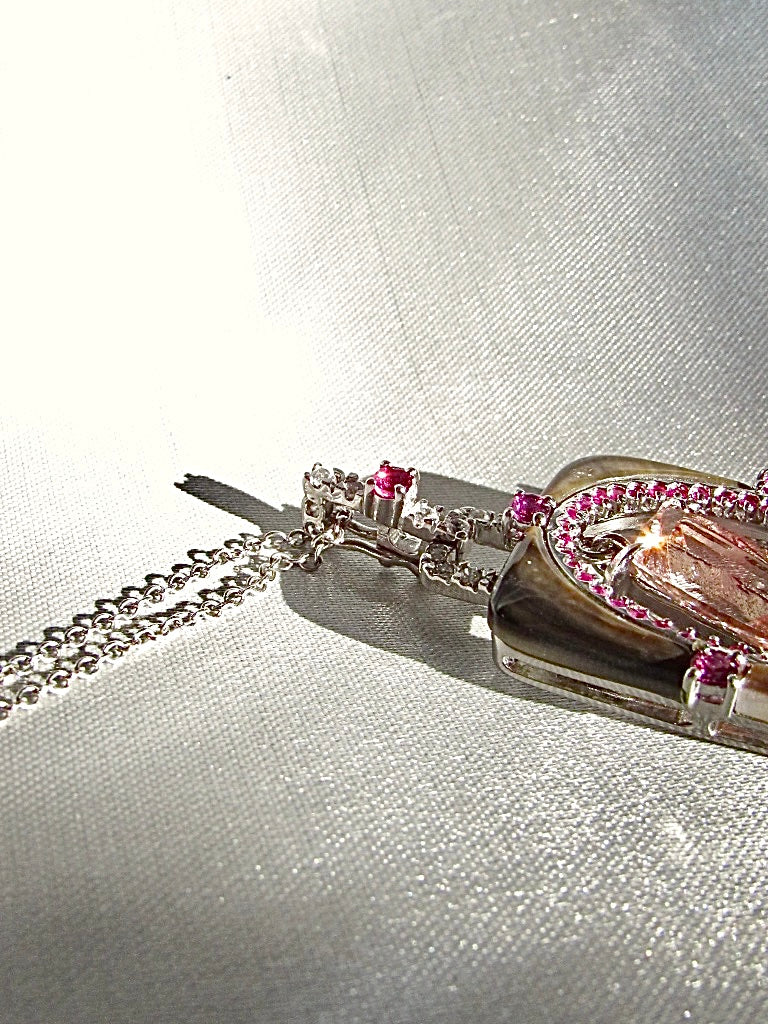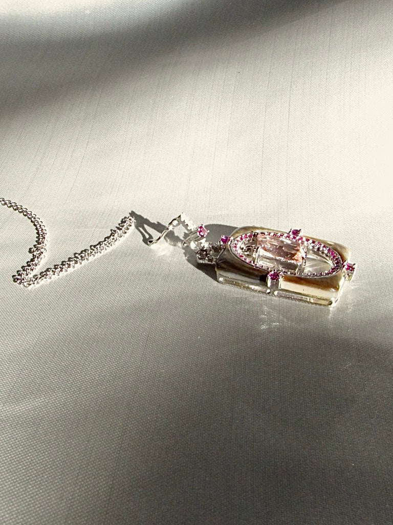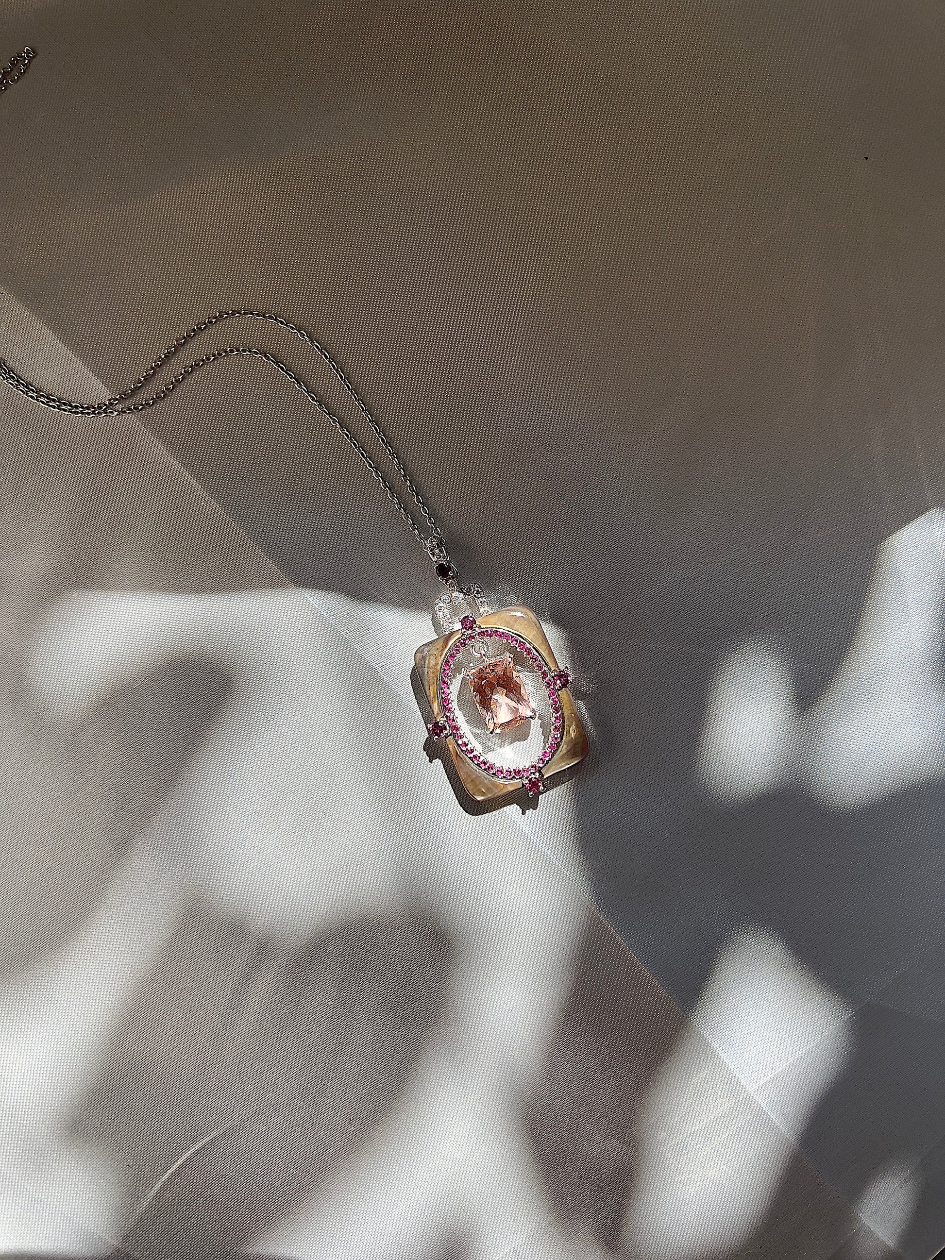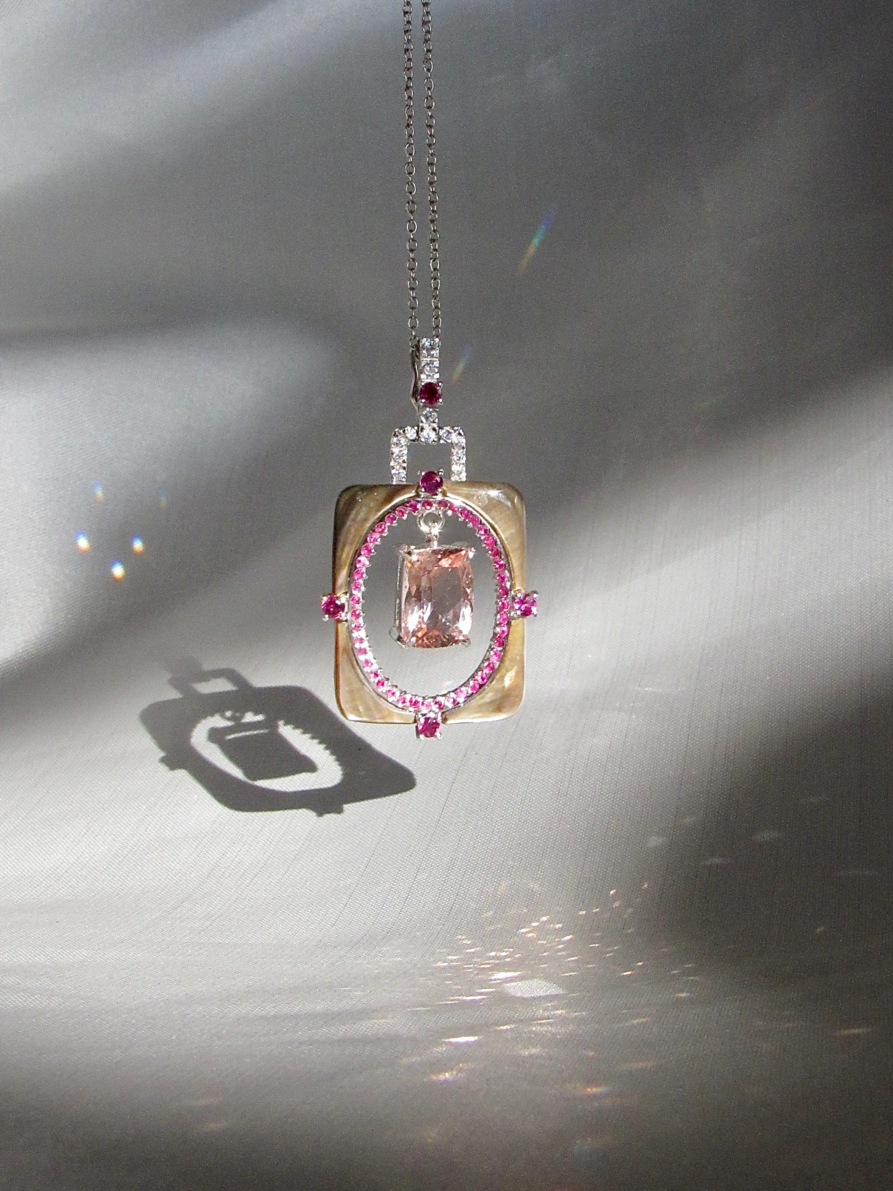- Gemstone: natural morganite, rubies, rhodolite garnet, white sapphires and mother of pearl.