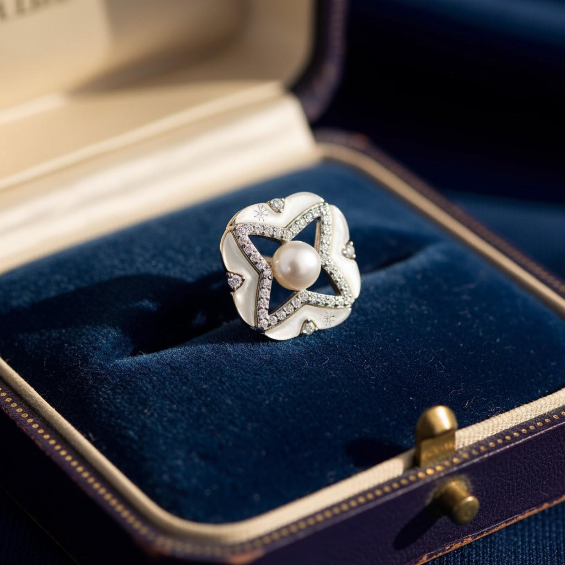 • Natural Akoya pearl at the center (creamy, luminous, timeless)