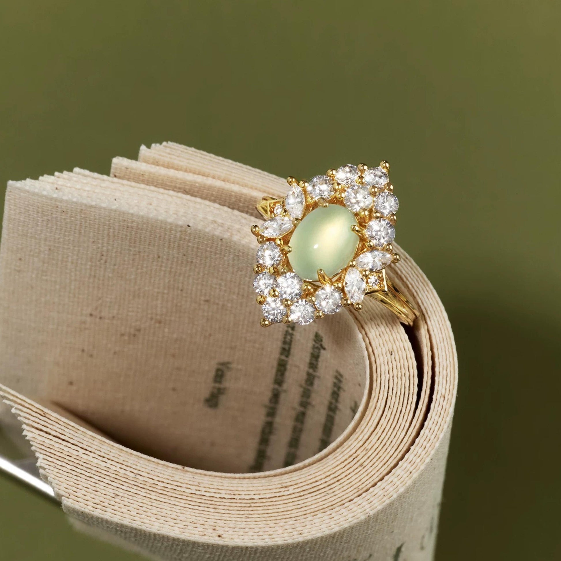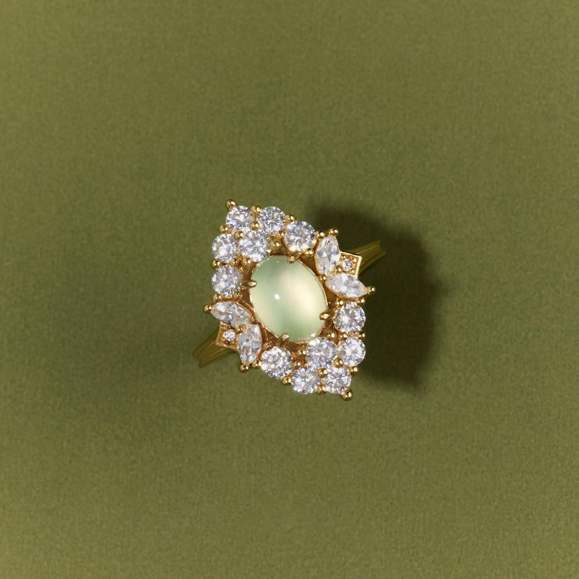 This glowing statement ring is a celebration of softness and elegance — a French-inspired design centered around a serene green prehnite cabochon. Framed by a radiant halo of brilliant-cut shimmer, its silhouette is reminiscent of vintage lace, yet carries a modern charm.