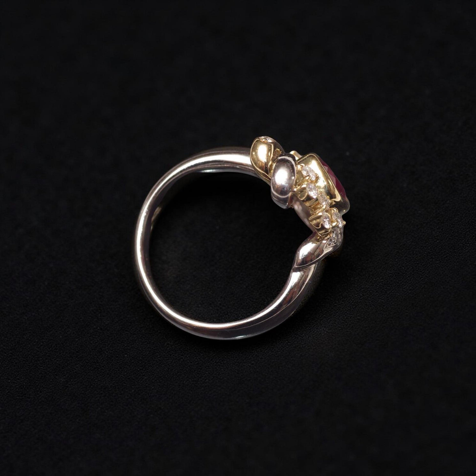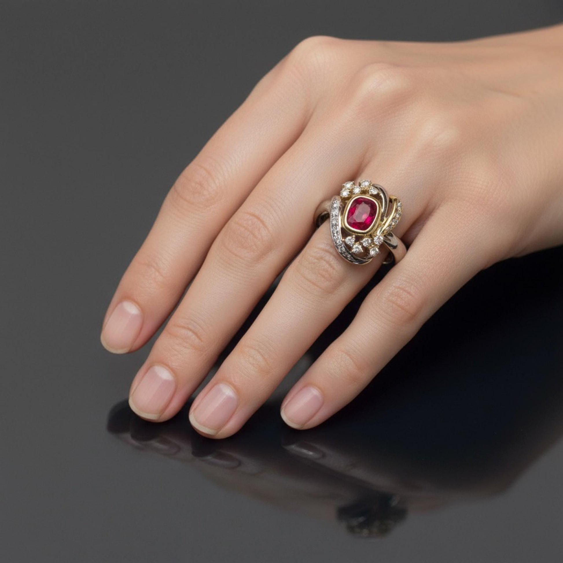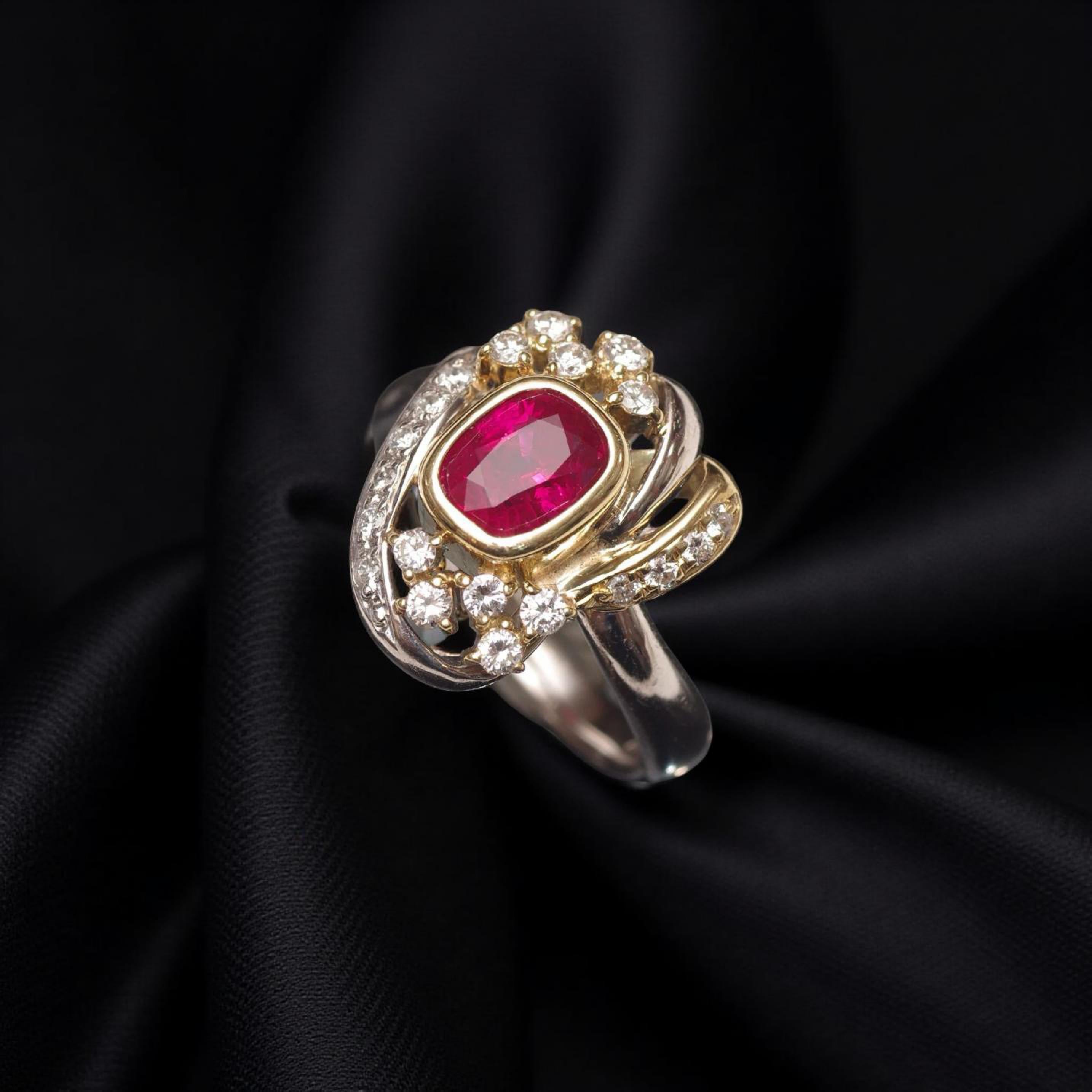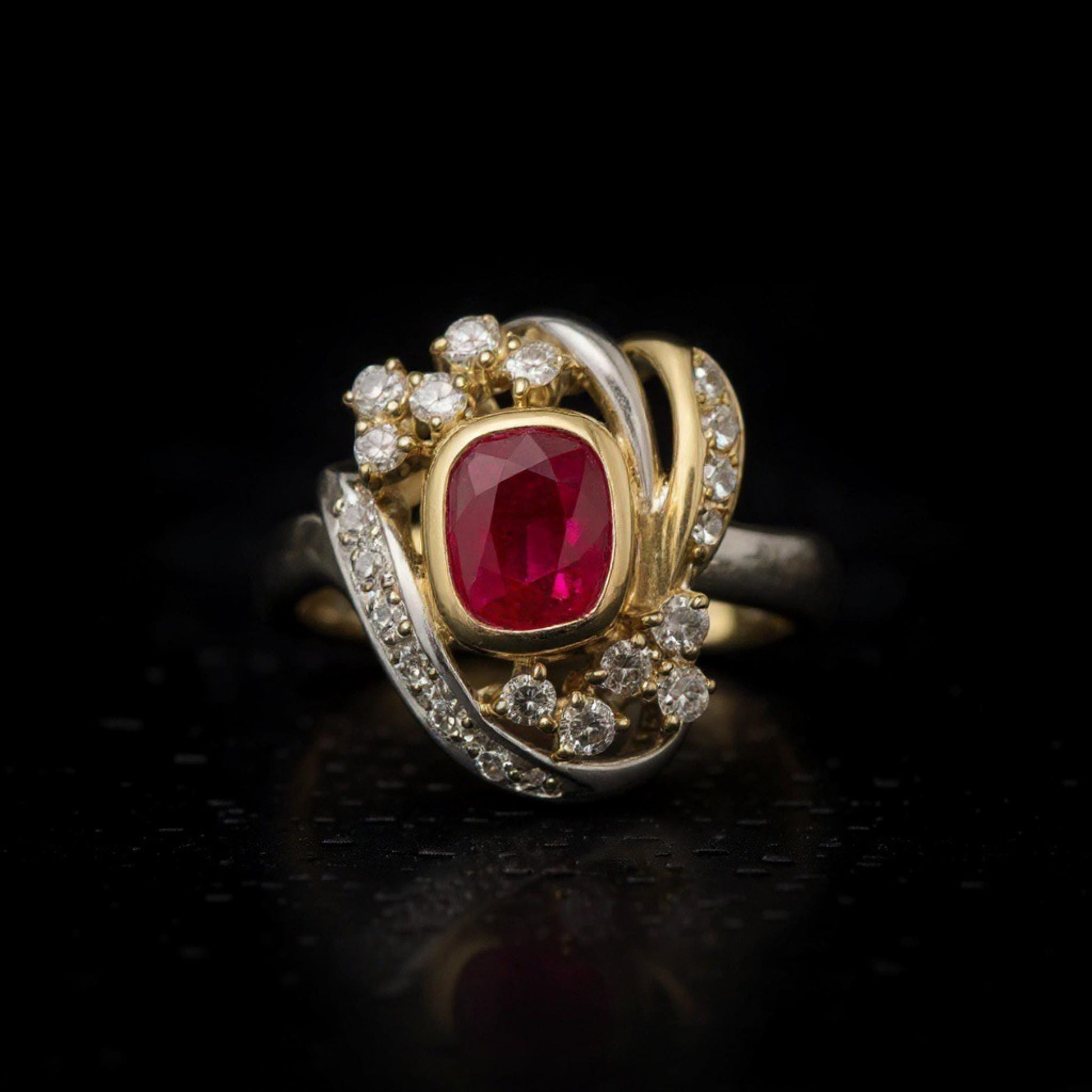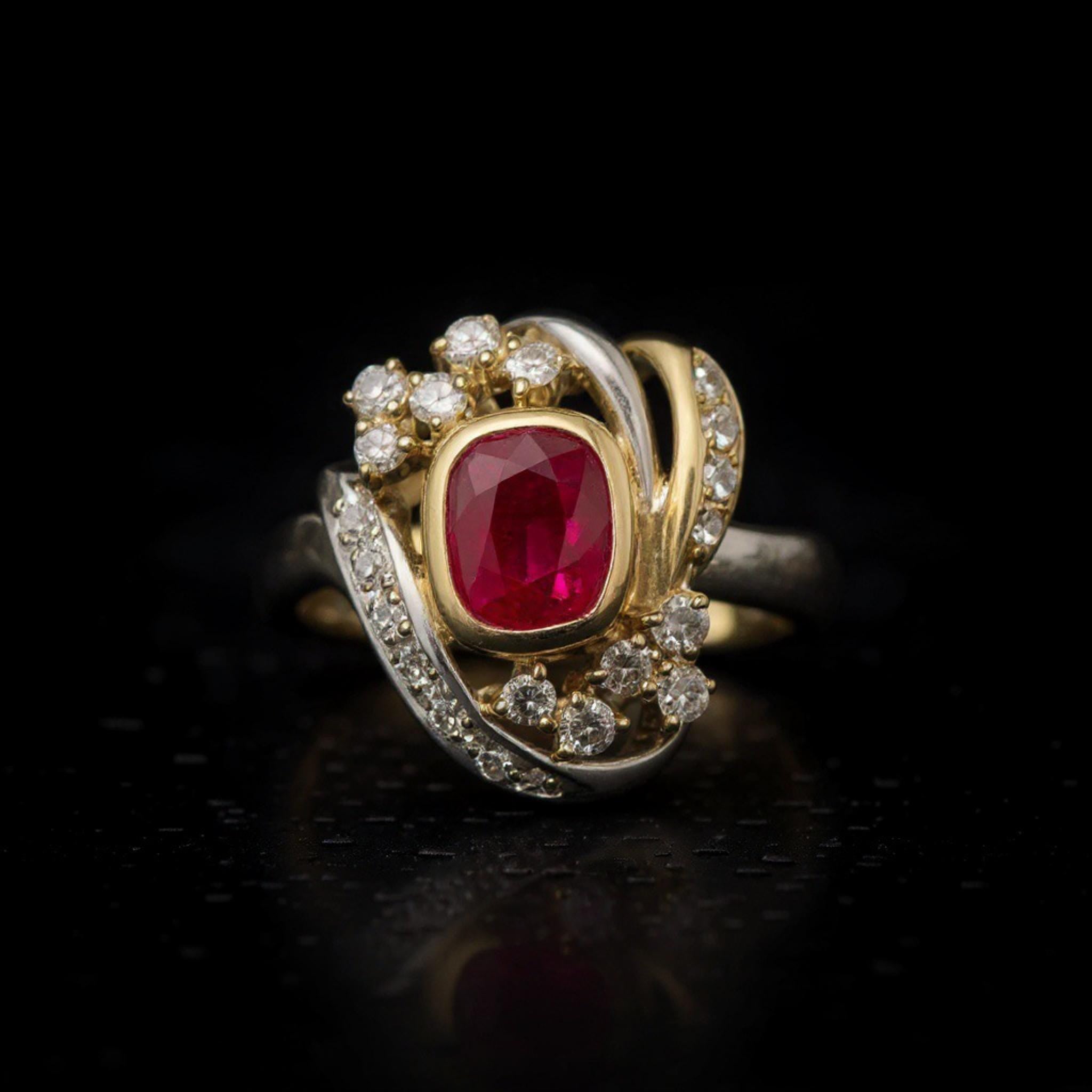 Set in a luxurious platinum and 18K solid yellow gold mounting, the ruby is haloed and accented by 0.40 carats of sparkling diamonds, arranged in an elegant, swirling motif that enhances both brilliance and drama. The intricate craftsmanship ensure a ring that is as bold as it is refined.