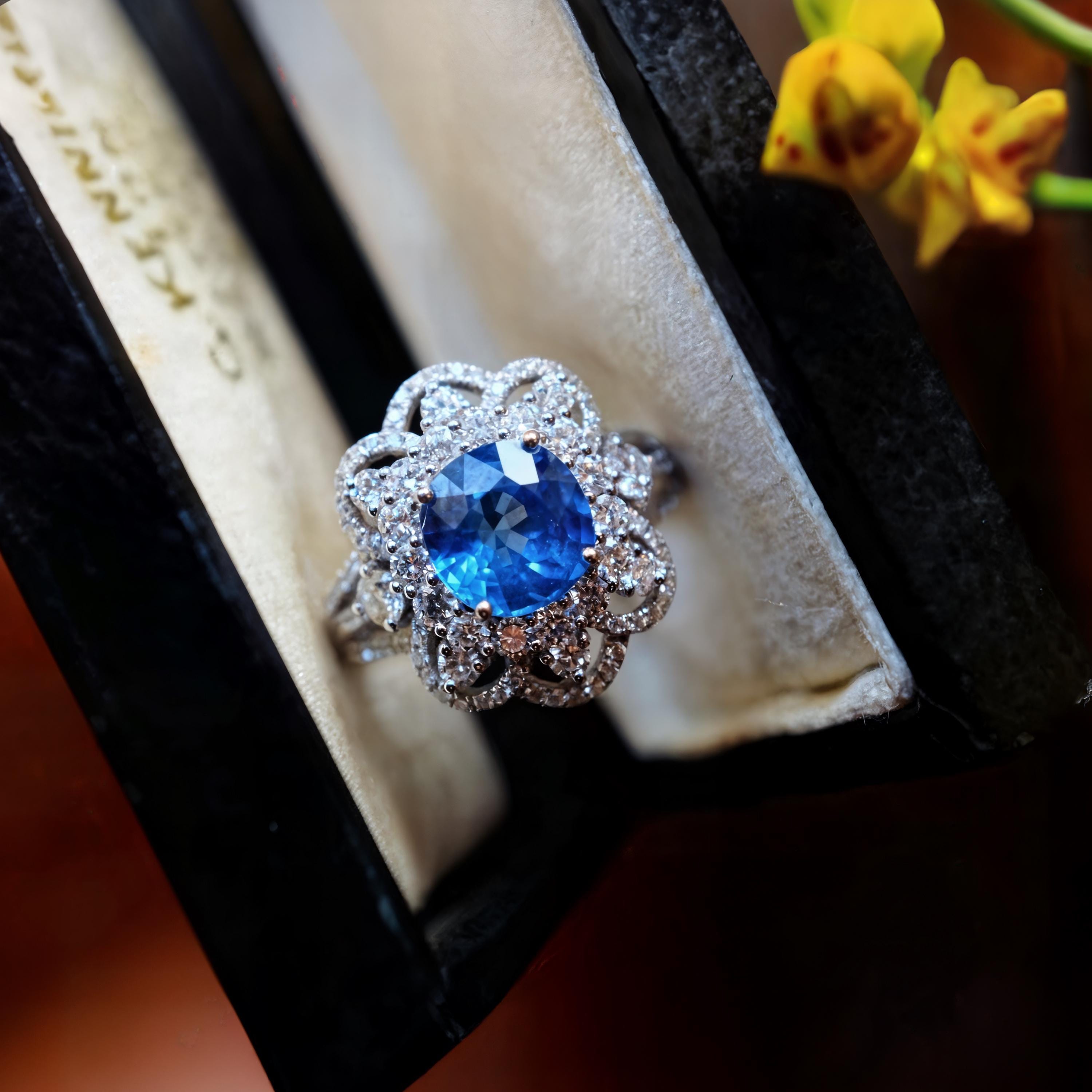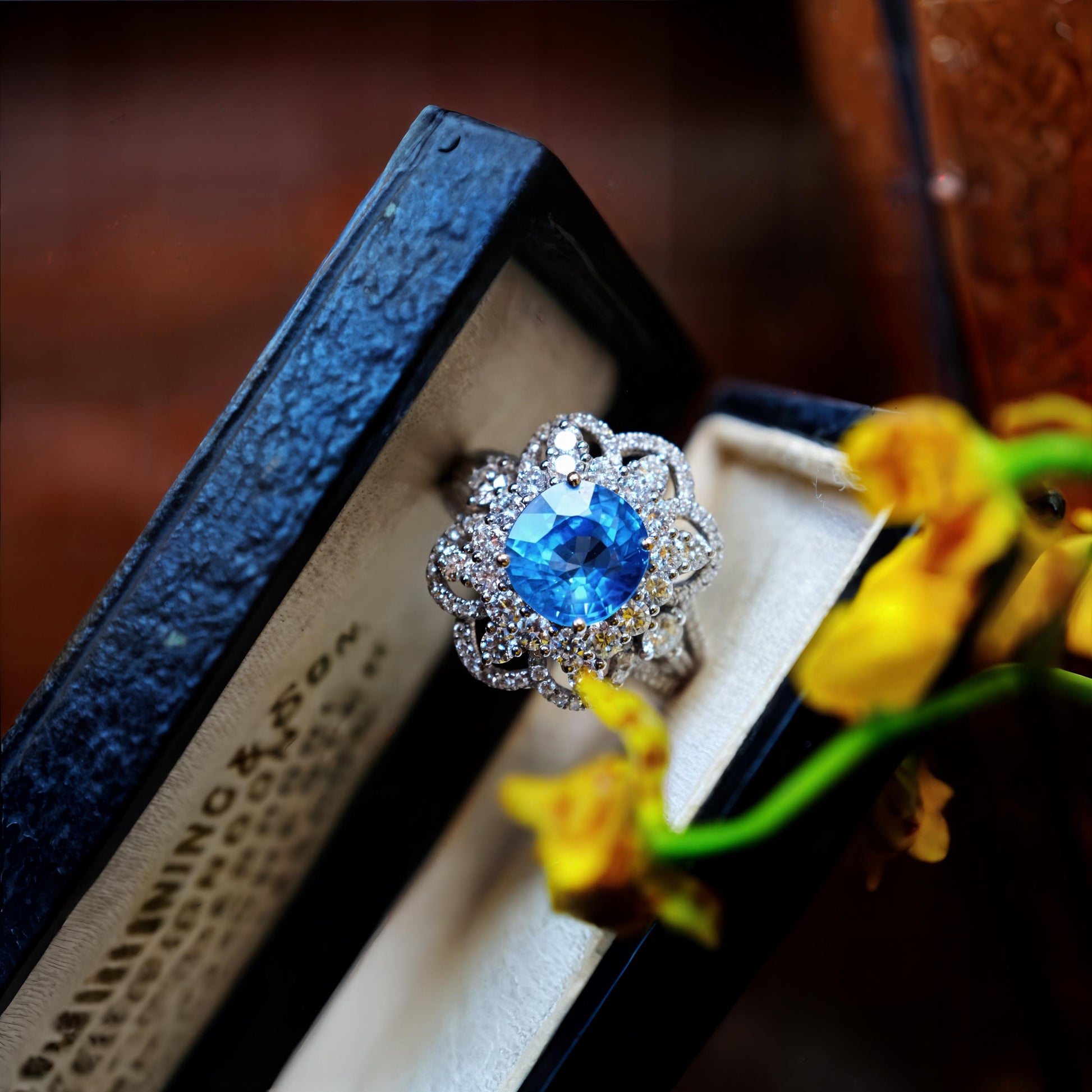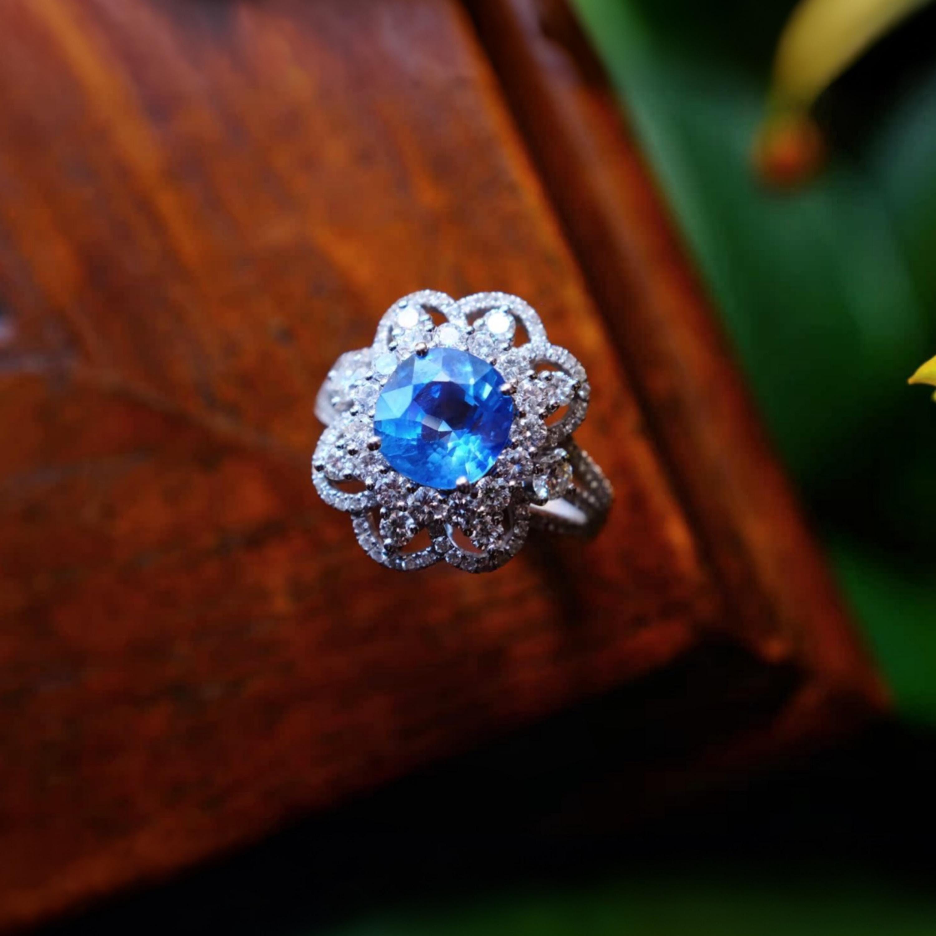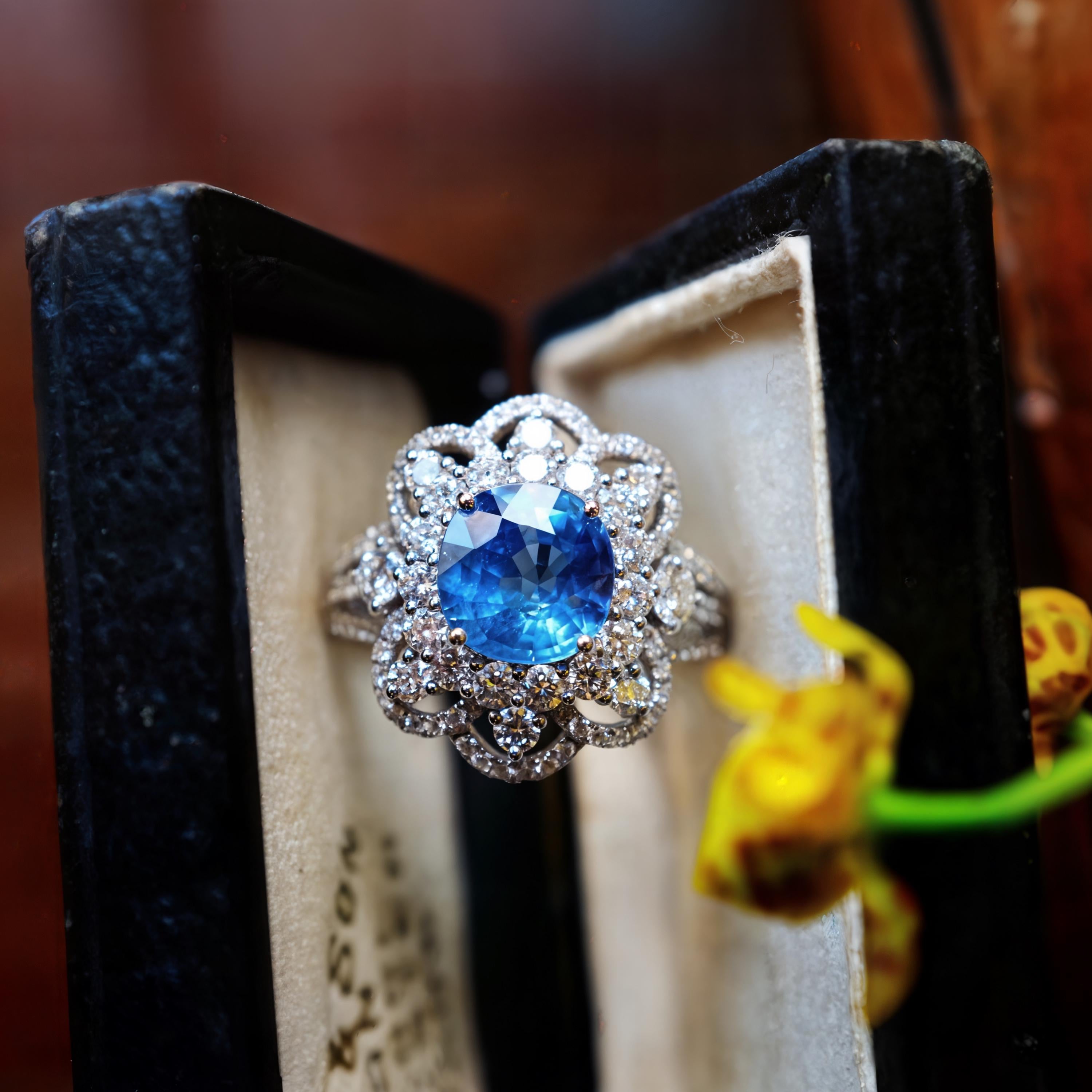 The setting, handcrafted in 18K solid white gold, frames the sapphire within an intricate diamond halo — a floral-inspired design with over 1.17 carats of VS-clarity, G-color diamonds. Every facet and curve was designed to enhance brilliance from every angle, offering both structural grace and effortless glamour.