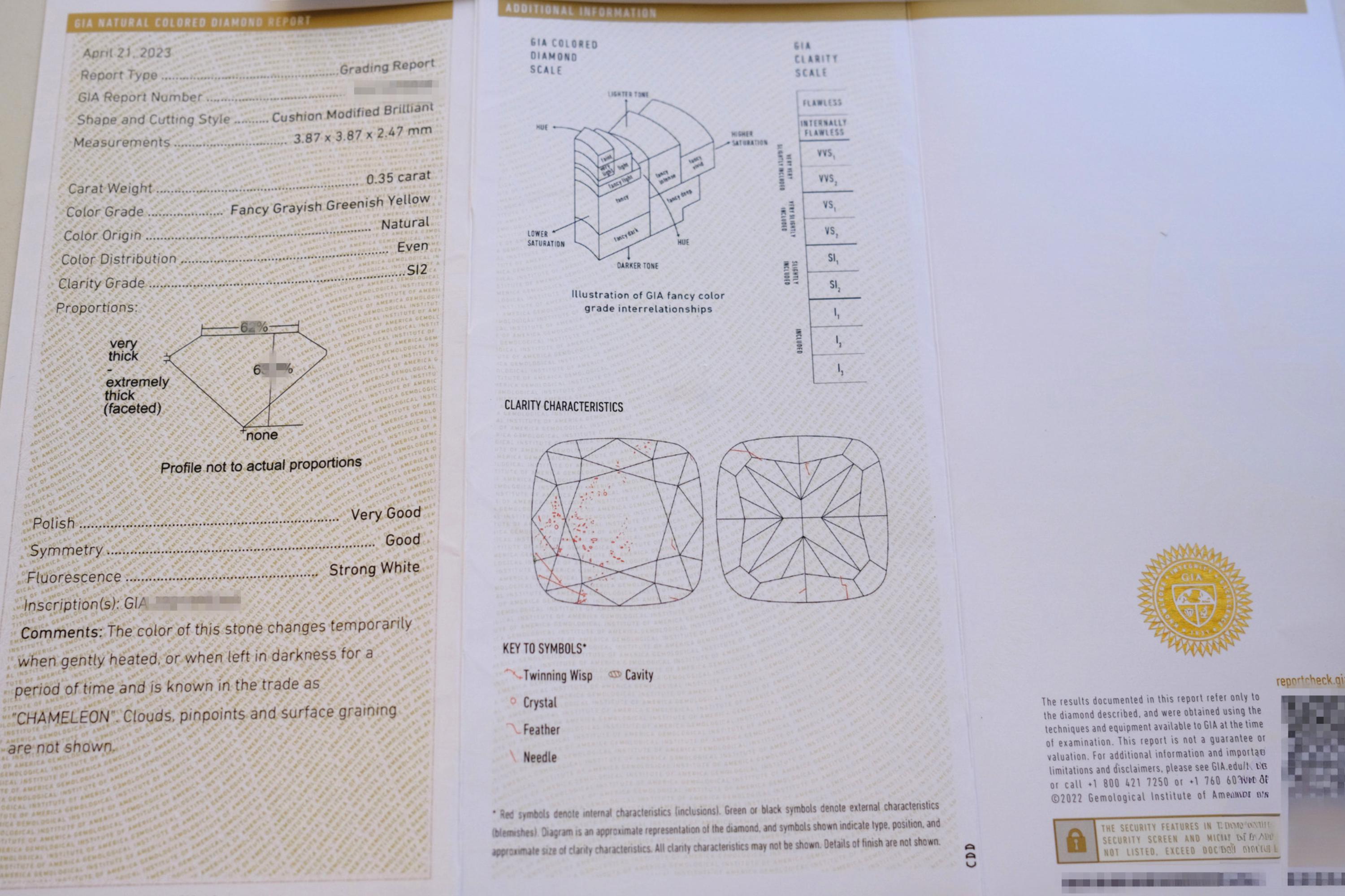 • Color Grade: Fancy Grayish Greenish Yellow (Chameleon)