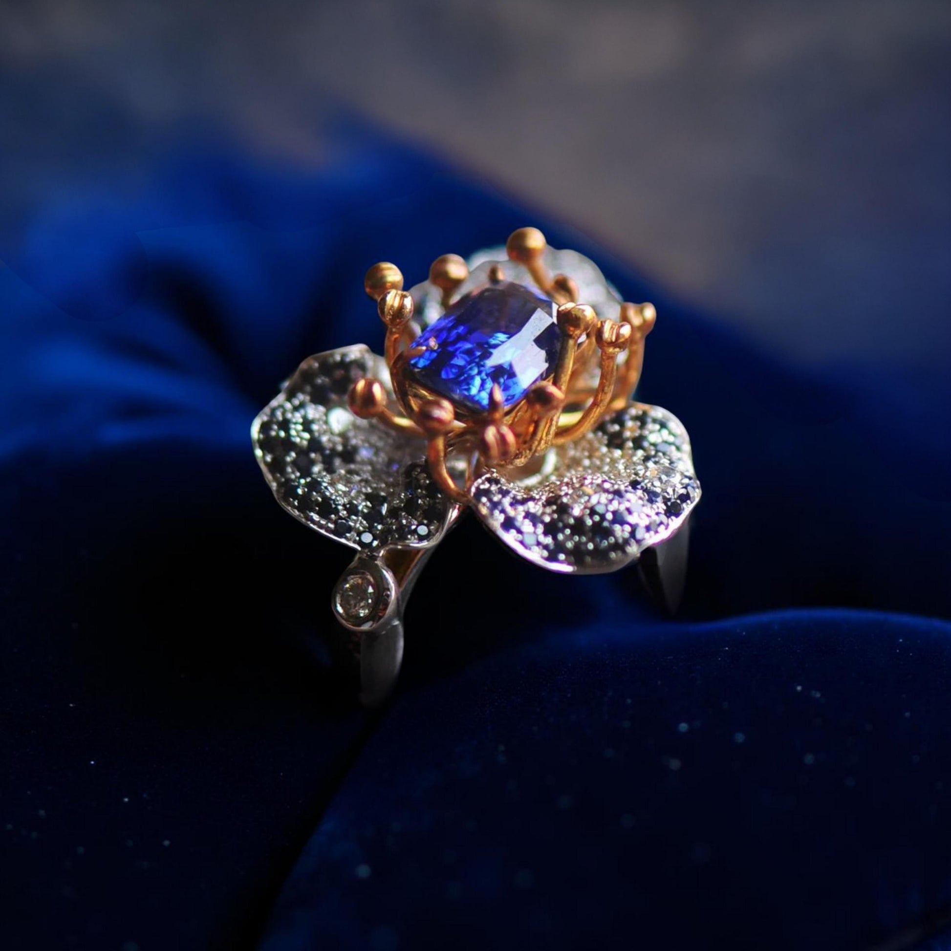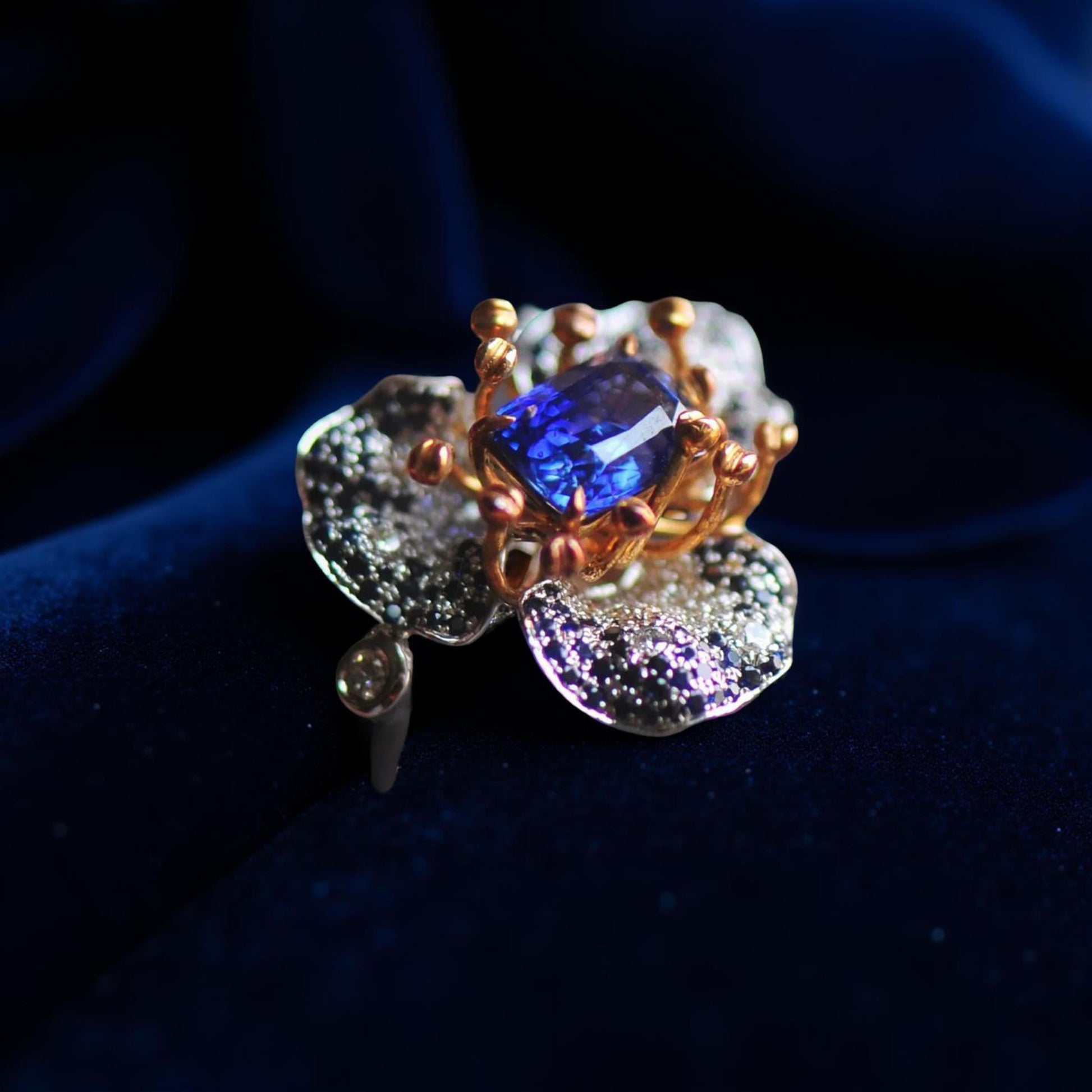 Step into the realm of high jewelry artistry with this exceptional Cornflower Blue Sapphire ring, crafted in 18K gold and accented with diamonds in a breathtaking floral motif.
