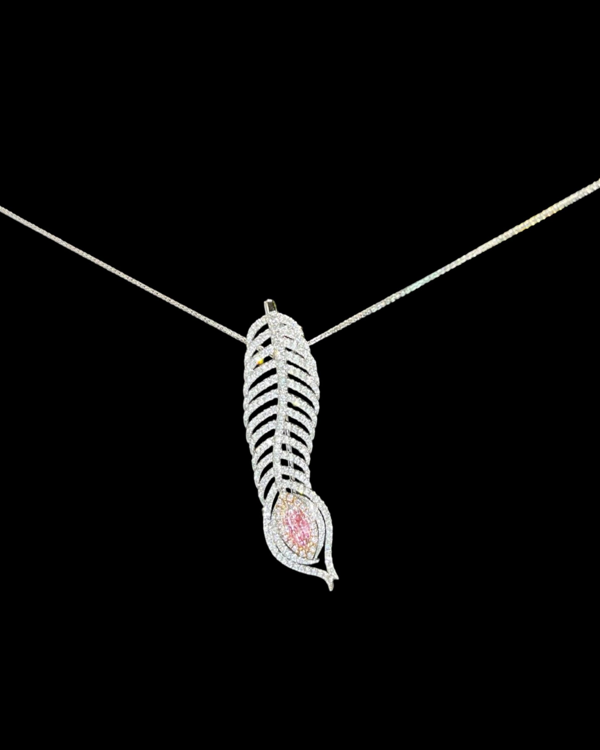 This exquisite feather pendant brooch is a one-of-a-kind piece crafted in shimmering 18K gold and pavé-set diamonds — with a GIA-certified natural light pink marquise diamond at its heart. Designed to be worn as either a pendant or a brooch, this is a statement jewel with true versatility and soul.
