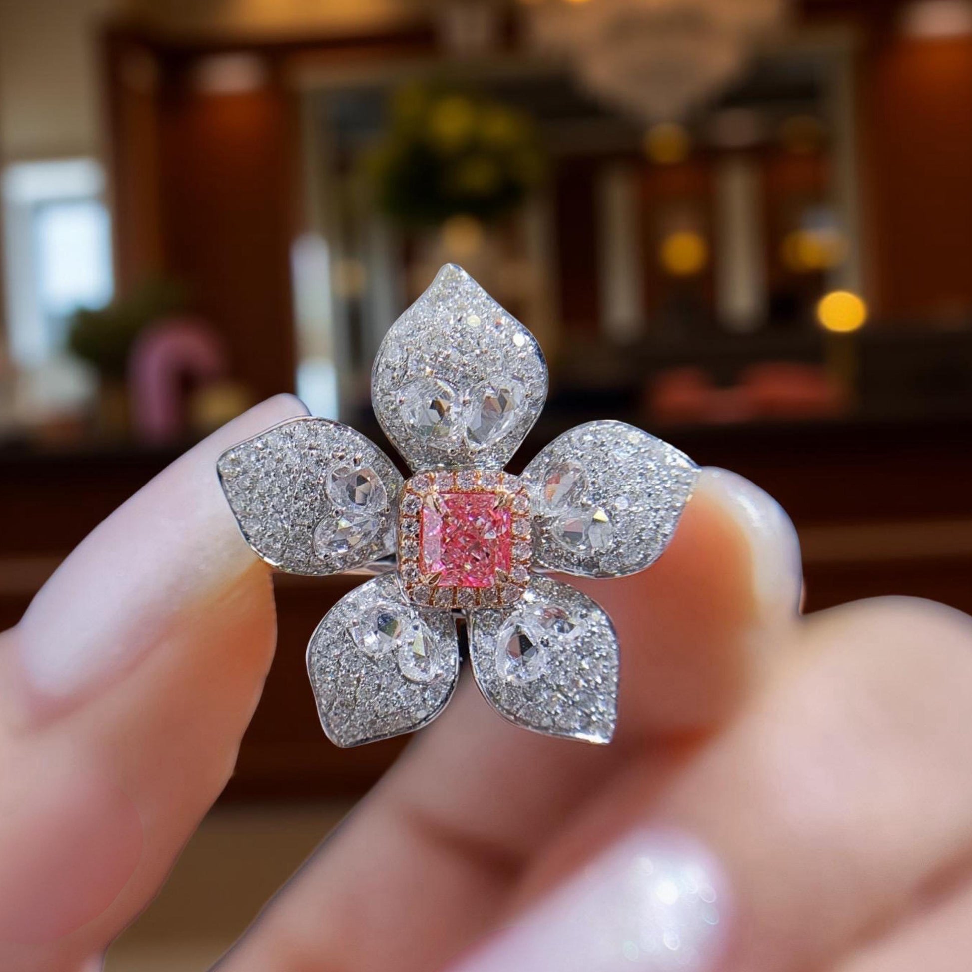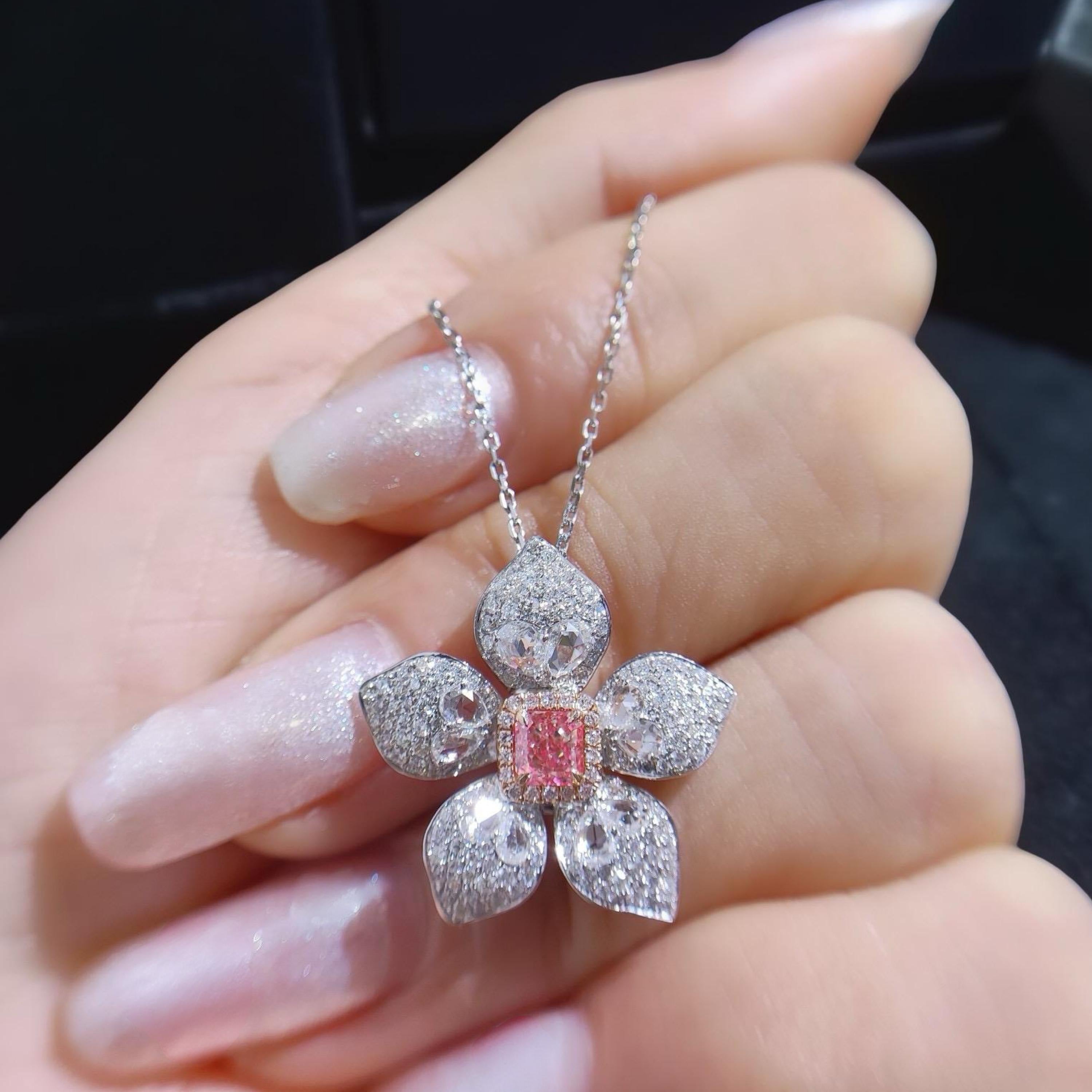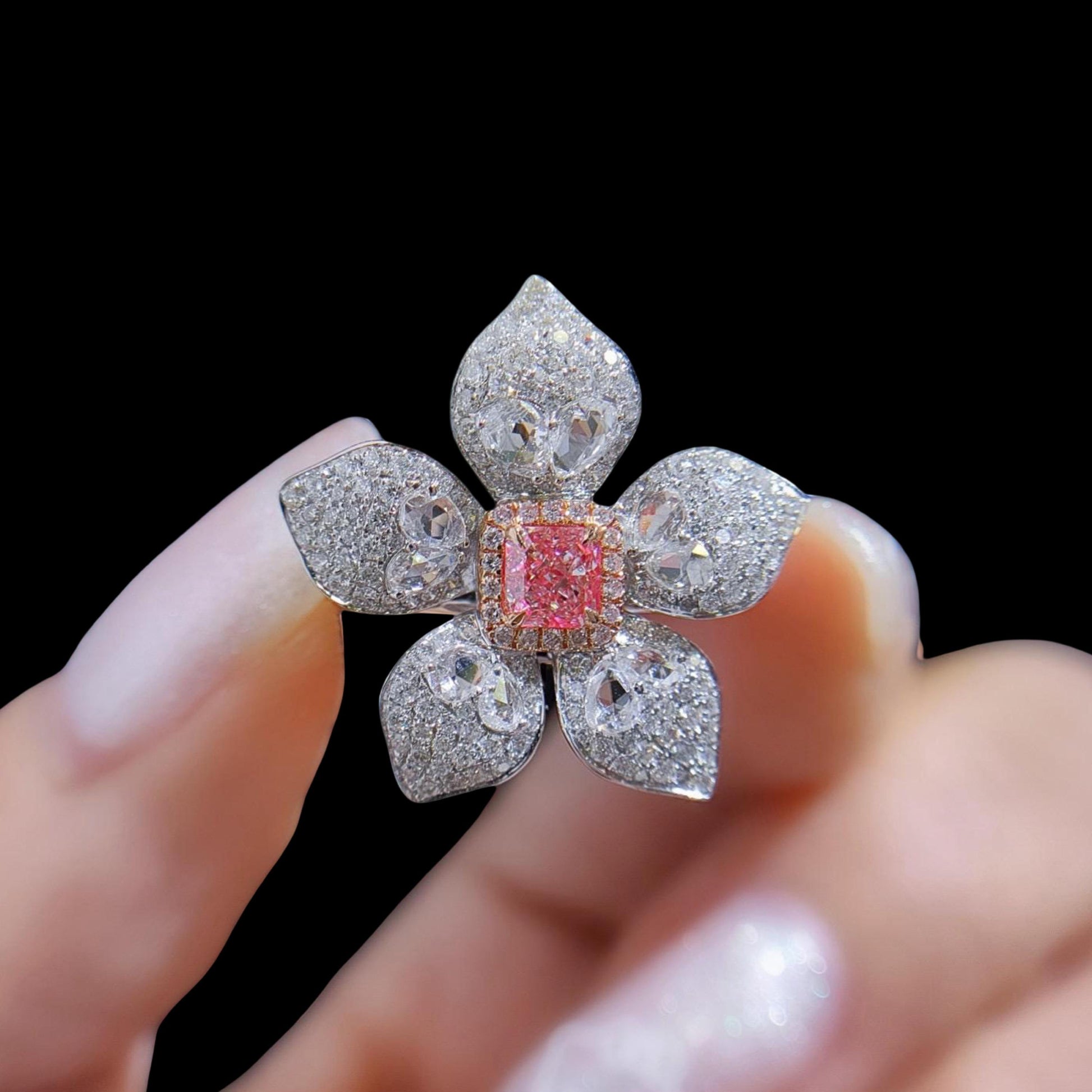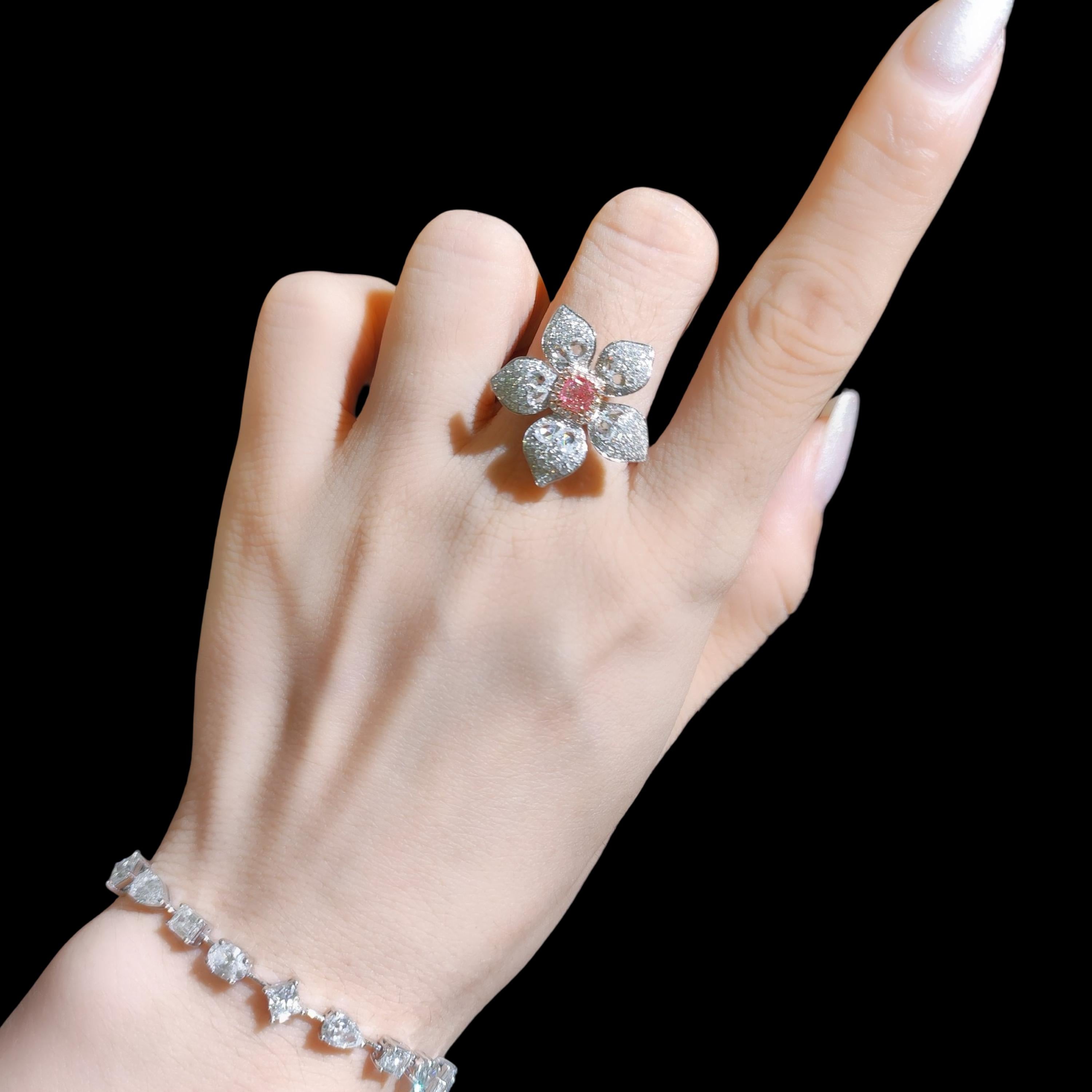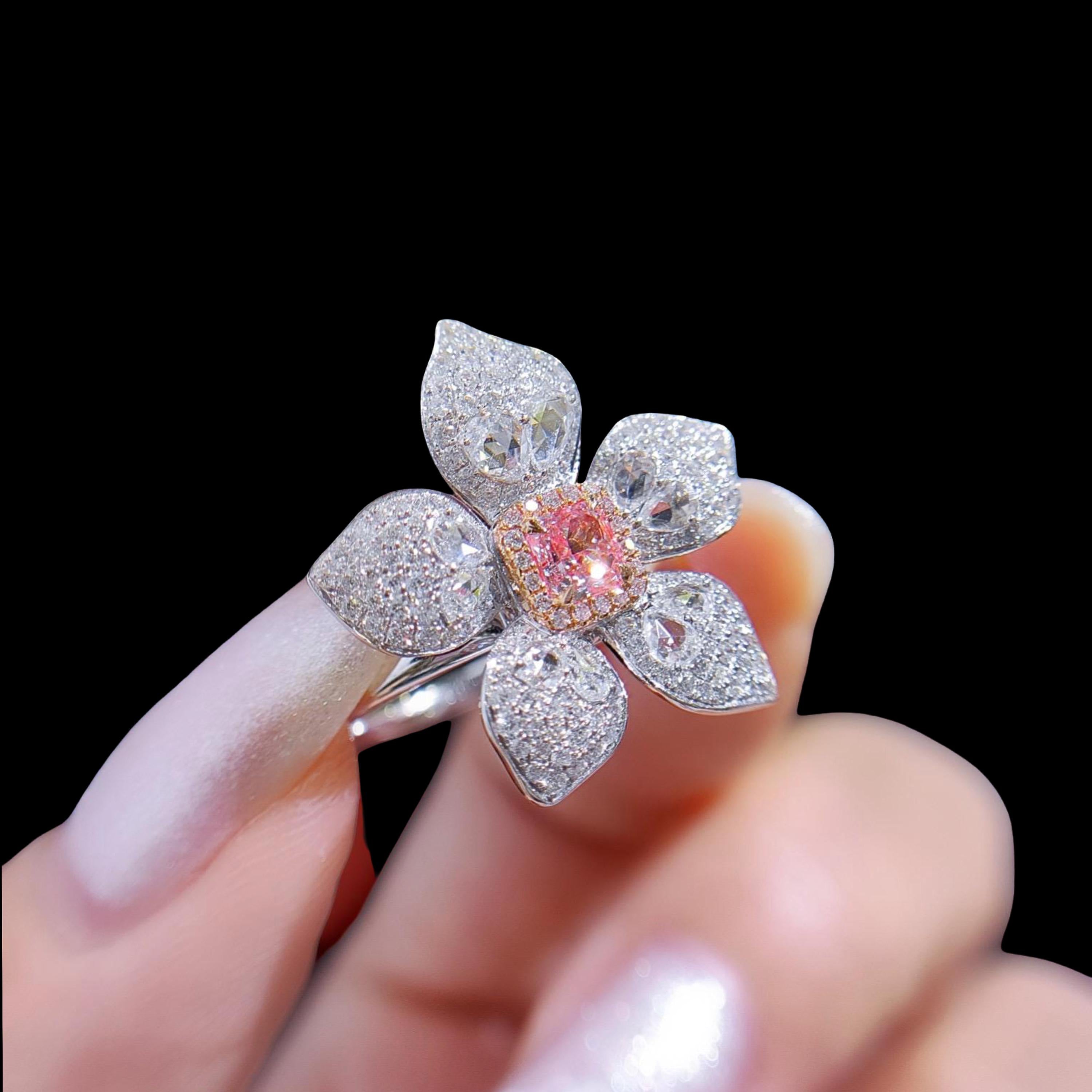 At its heart is a 0.38 carat natural cut-cornered square brilliant diamond, in a rare Light Pinkish hue — VS2 clarity, with strong saturation and internal fire. Set in an intricate five-petal floral design, each “petal” is sculpted from a mix of custom-cut diamonds and shimmering pavé.