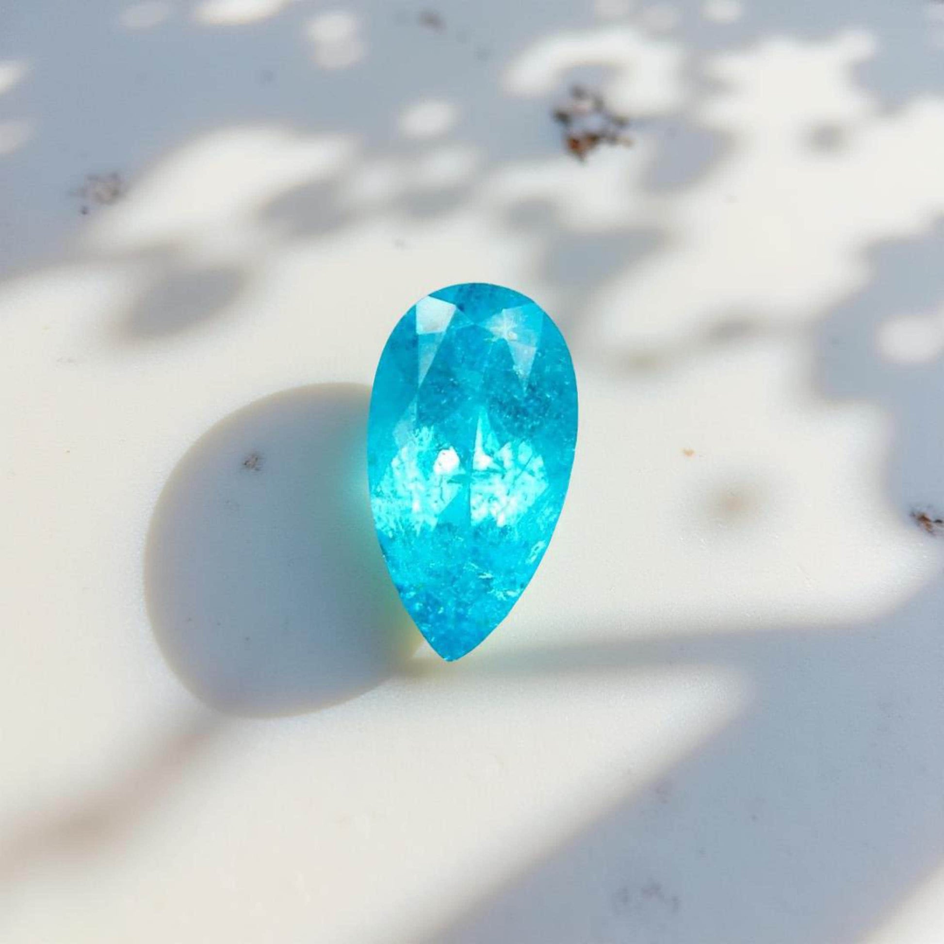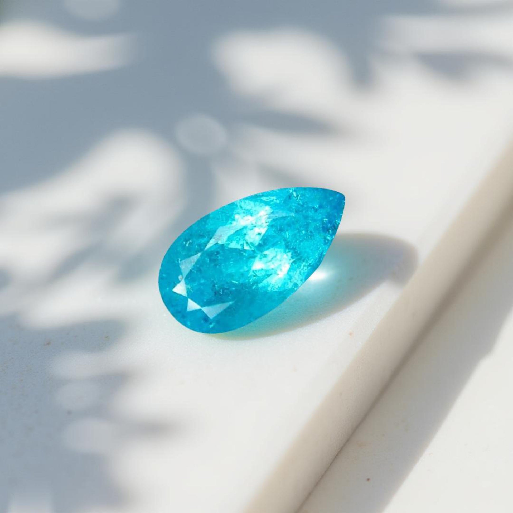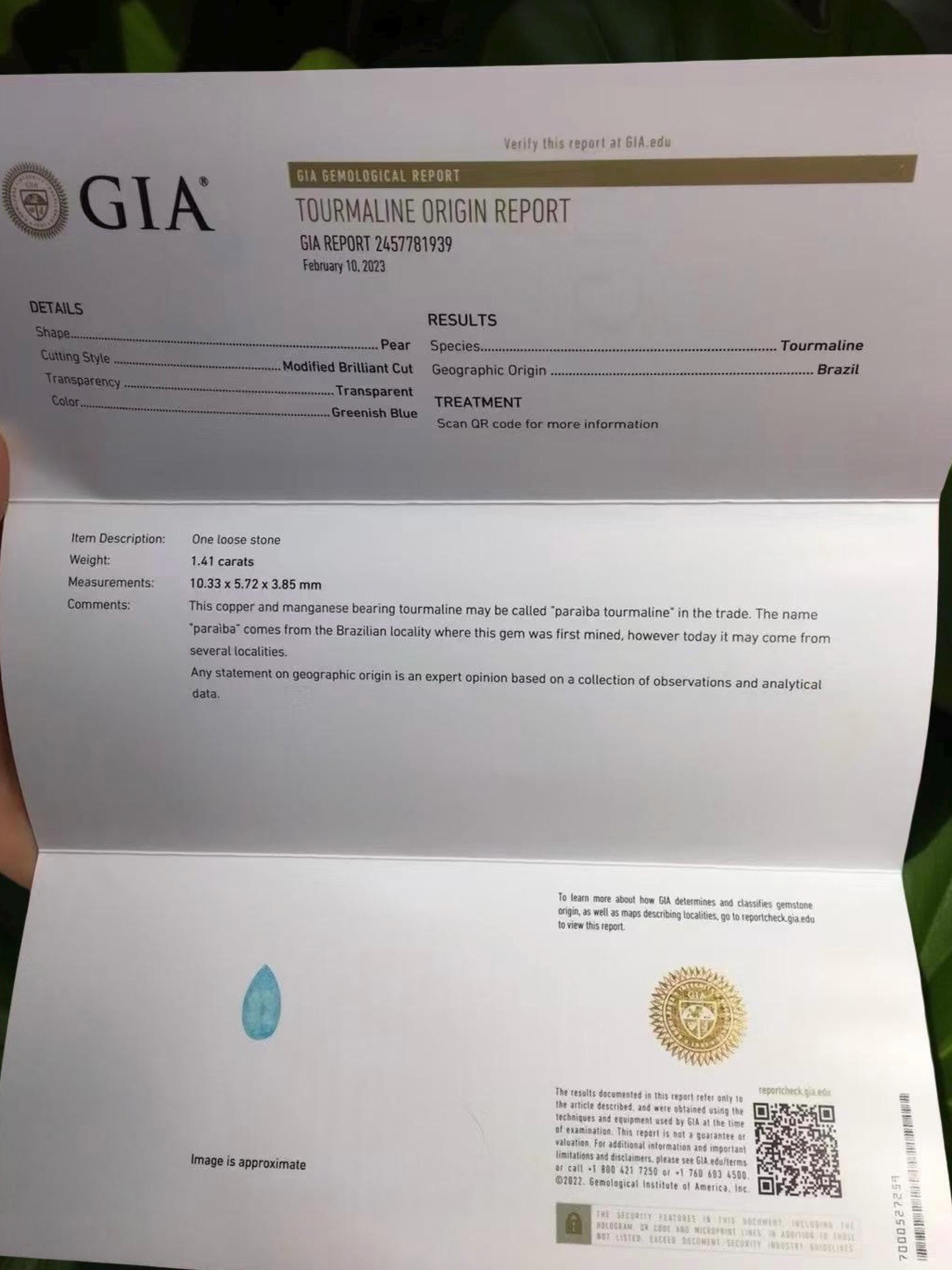 We present a 1.41 carat natural Paraiba Tourmaline, certified by GIA and hailing from Brazil, the legendary source of the world’s most coveted neon gemstones. Its pear cut brilliance captures the luminous glow that Paraiba is famous for — a vivid turquoise-green fire that feels alive in every movement.