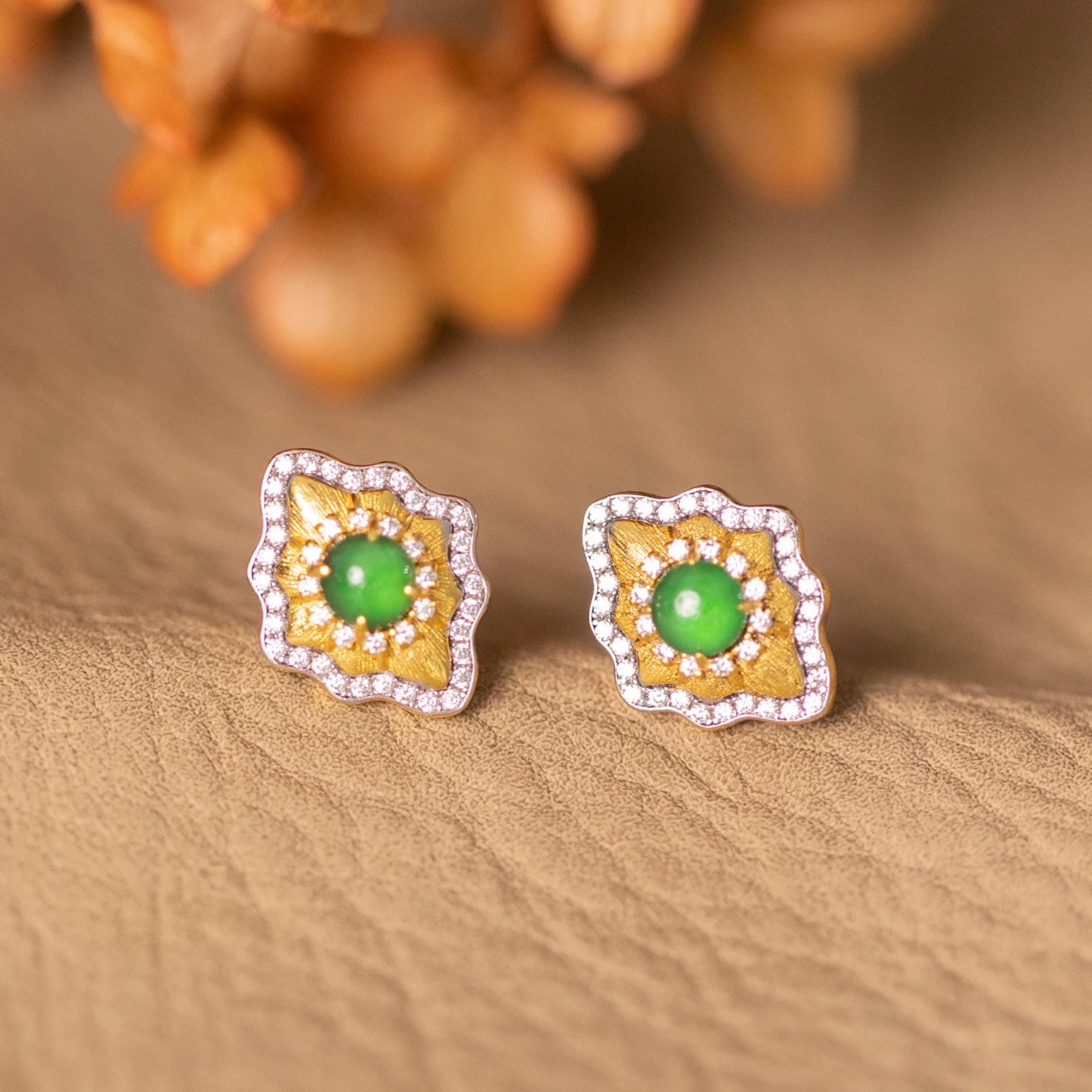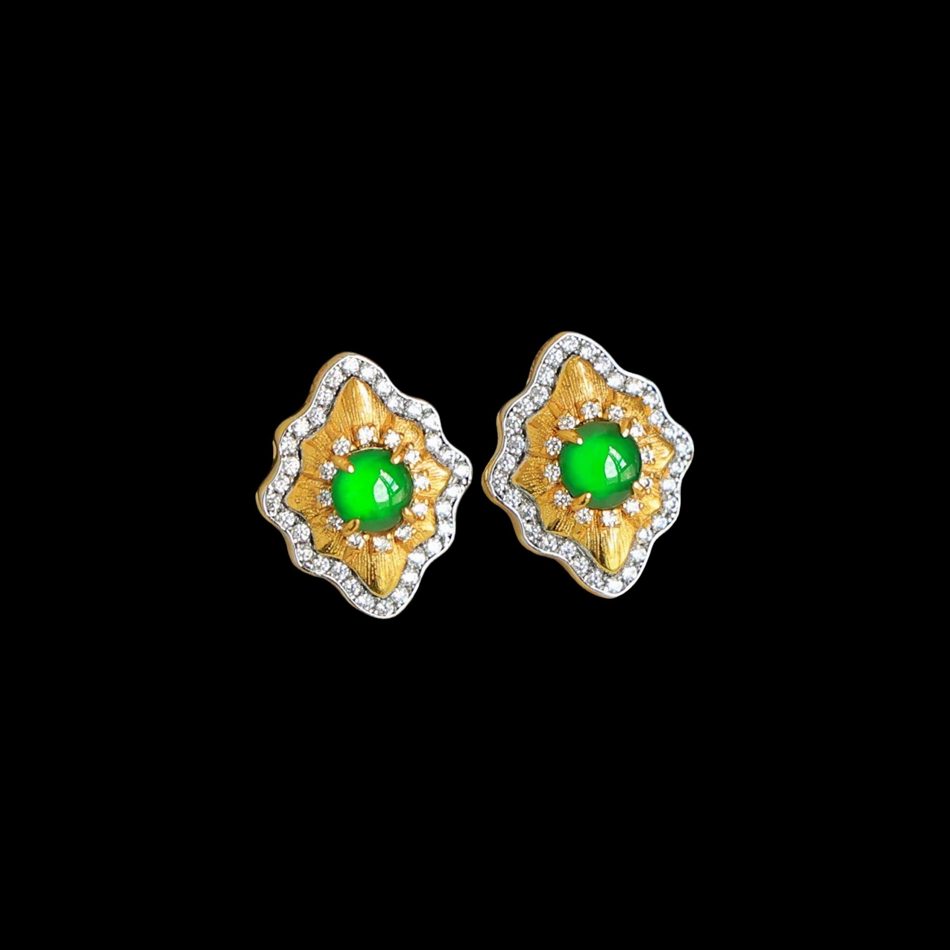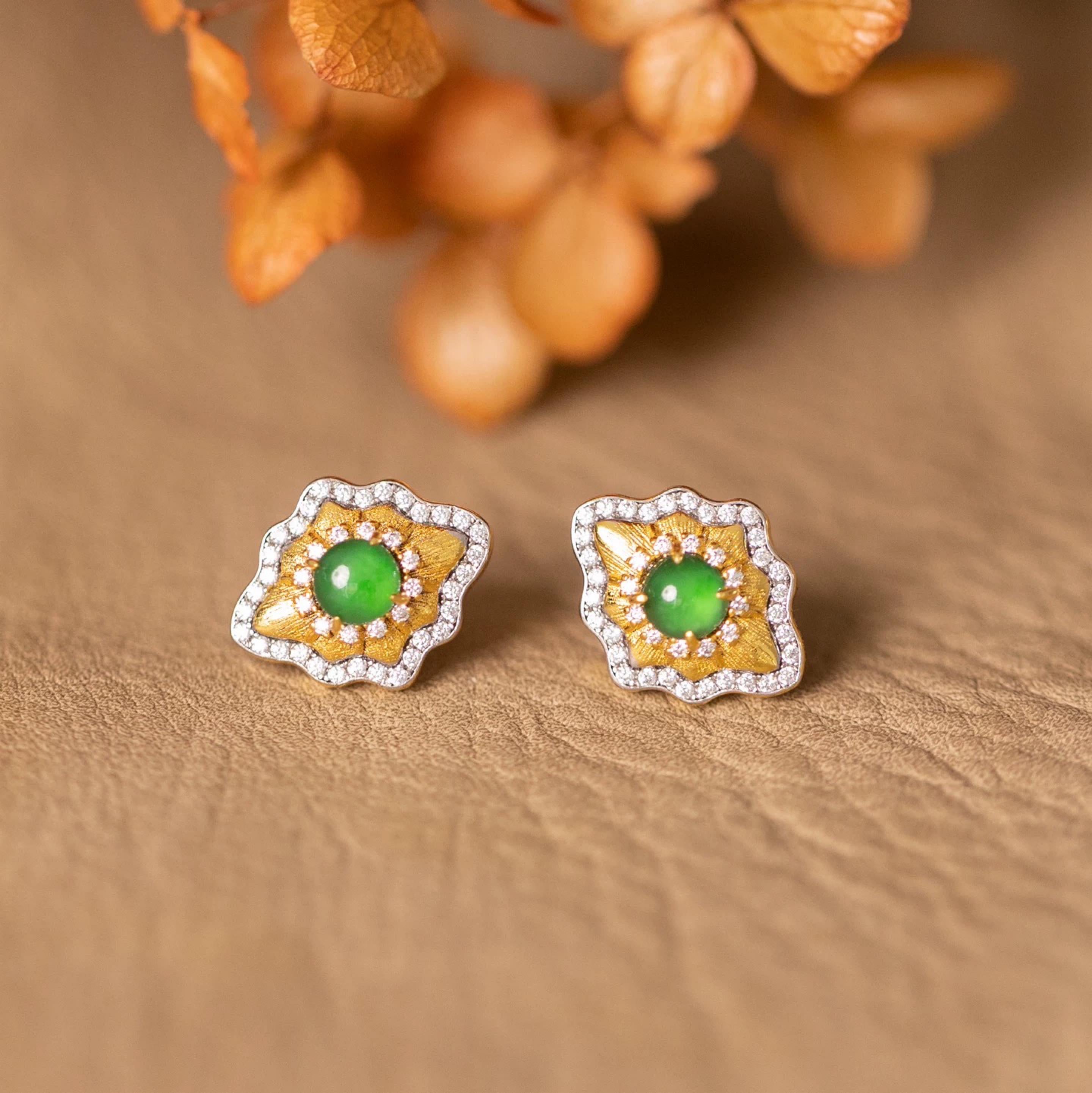 Our green jade earrings feature a naturally vibrant A-grade jadeite jade cabochon at the center, set inside a softly sculpted gold motif framed with sparkling stones. The look is elegant, luminous, and quietly luxurious—perfect for gifting or treating yourself.