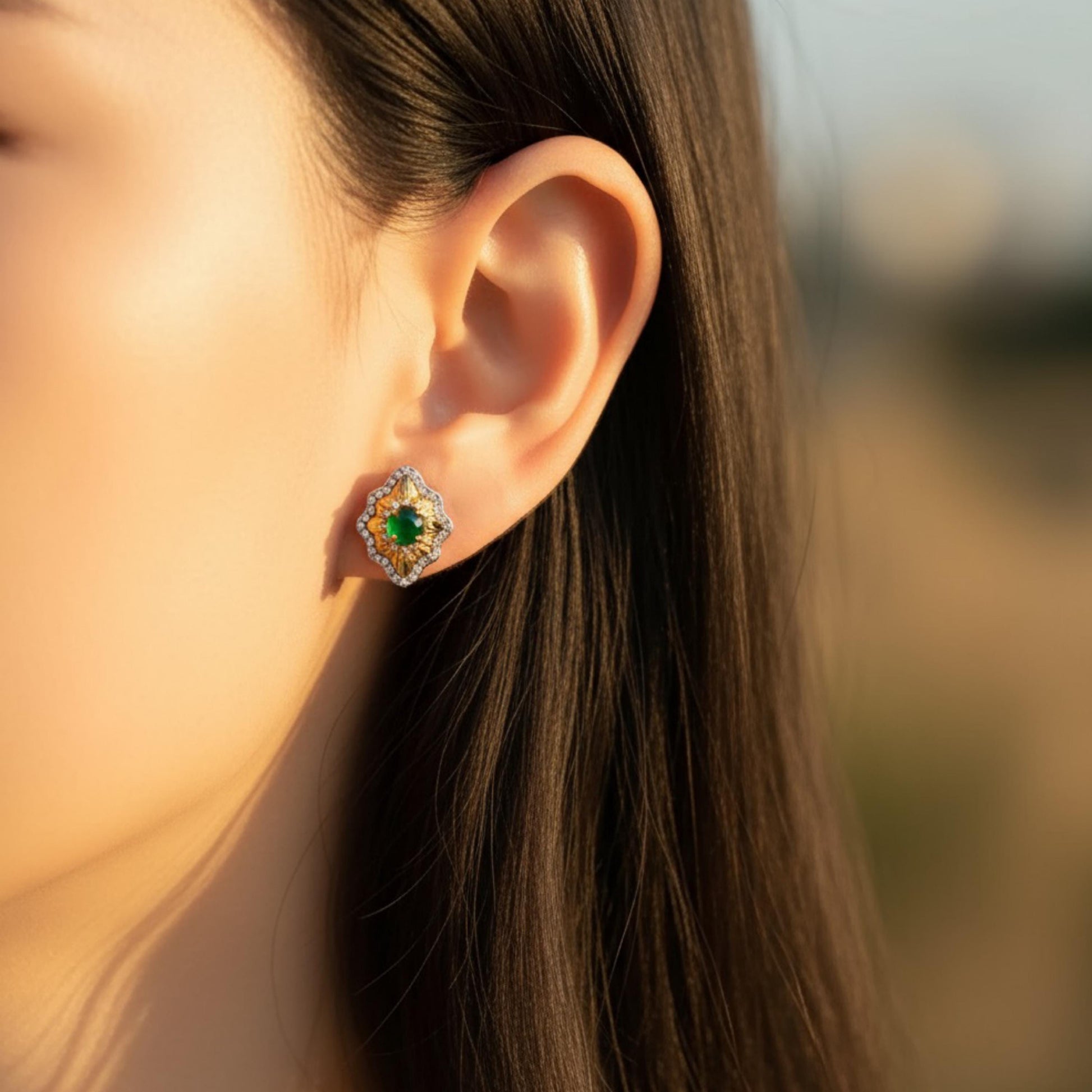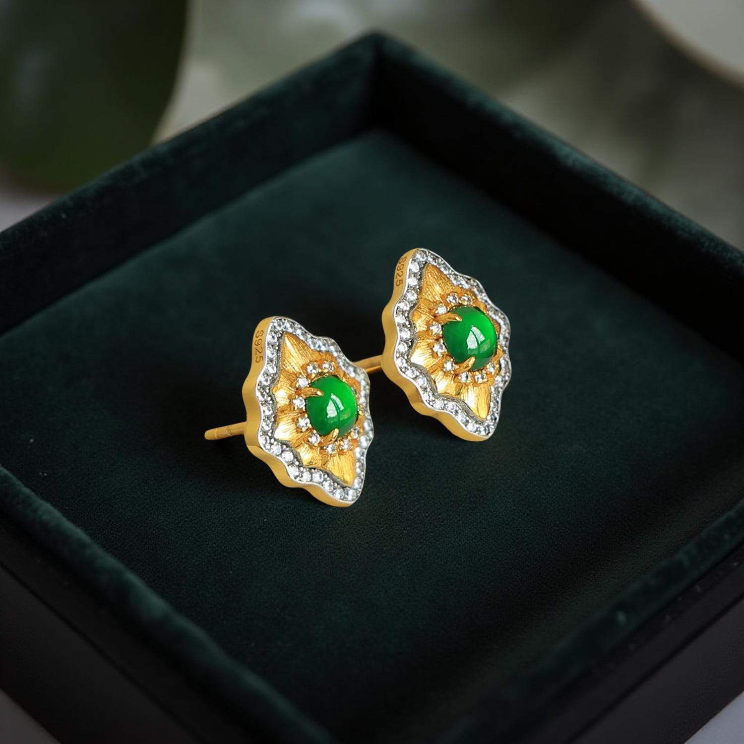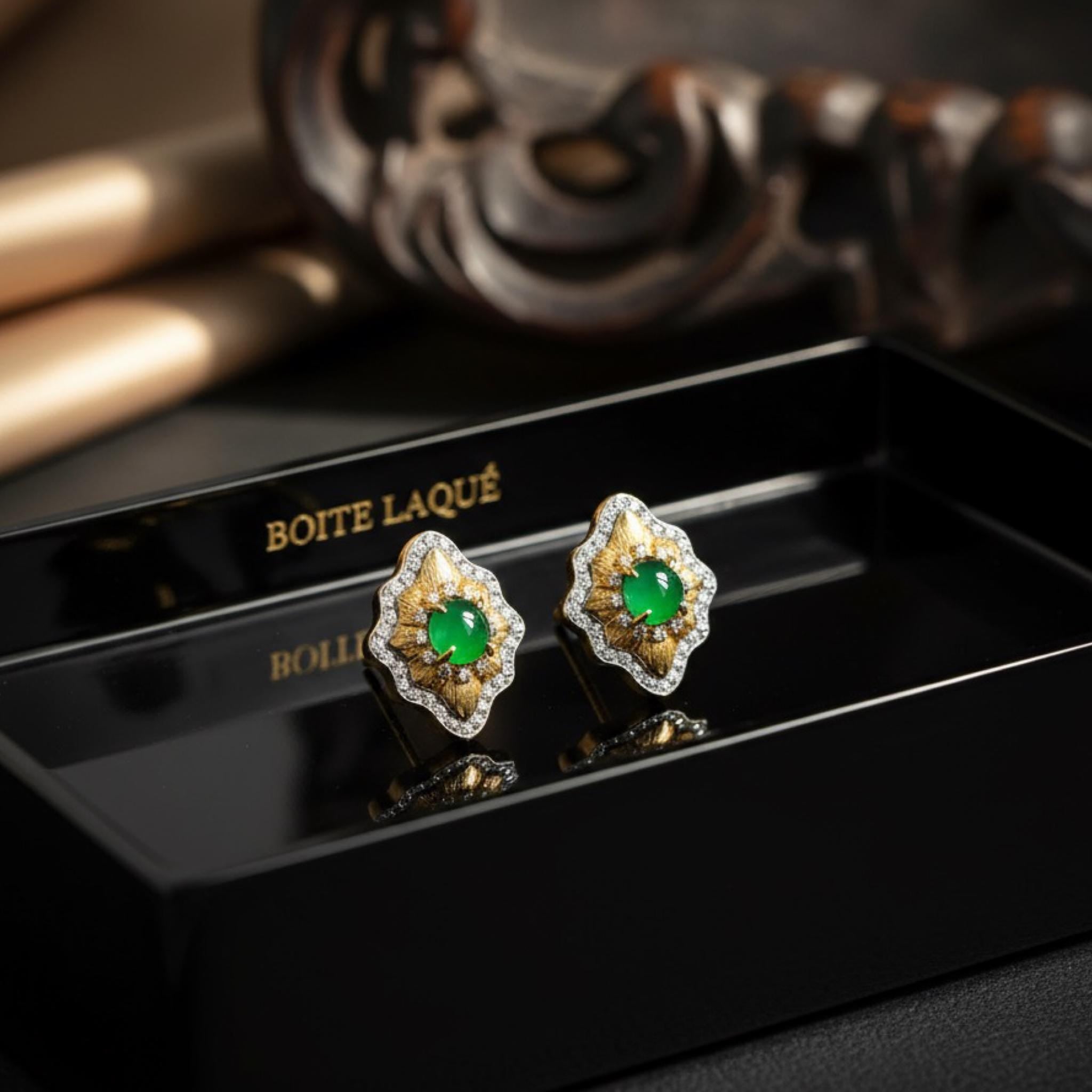 Our green jade earrings feature a naturally vibrant A-grade jadeite jade cabochon at the center, set inside a softly sculpted gold motif framed with sparkling stones. The look is elegant, luminous, and quietly luxurious—perfect for gifting or treating yourself.