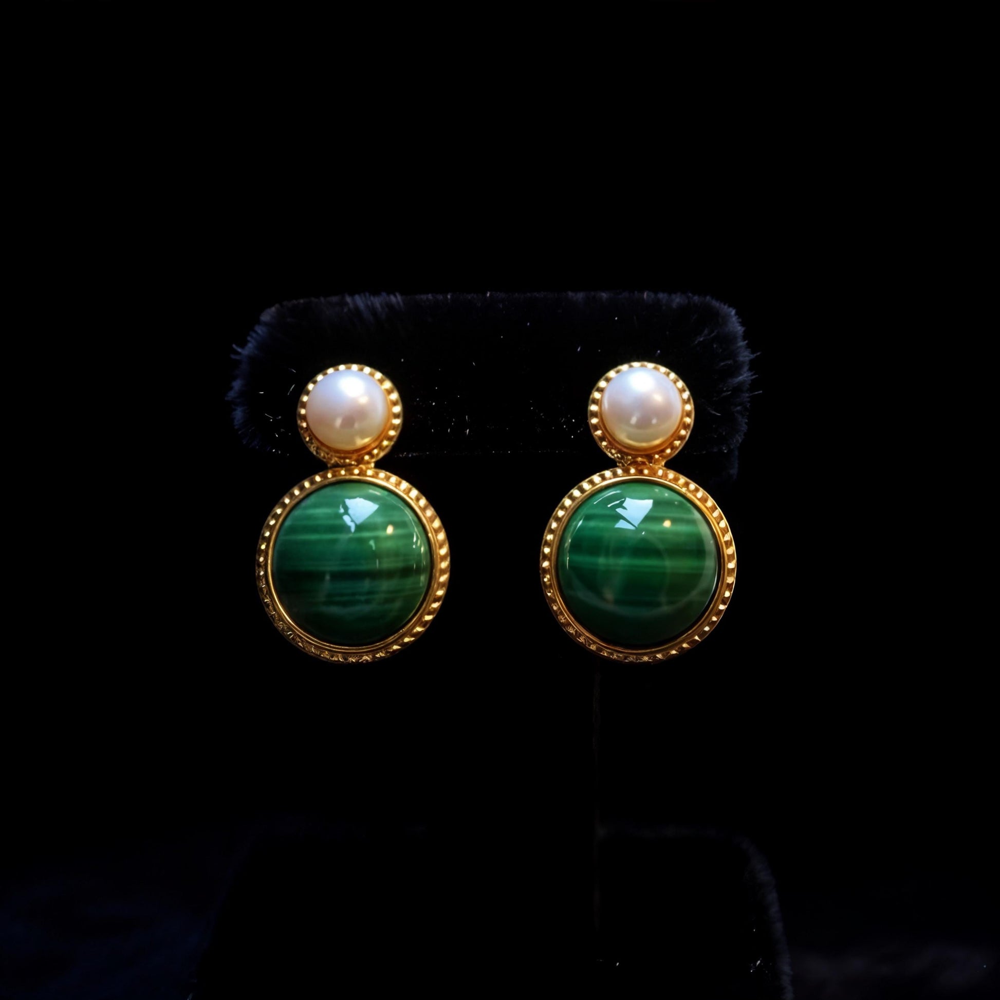 A timeless blend of natural malachite and luminous pearls, these earrings are crafted with an elegant rope detail. The dangle two-part design moves gracefully, bringing a touch of quiet luxury to any outfit.