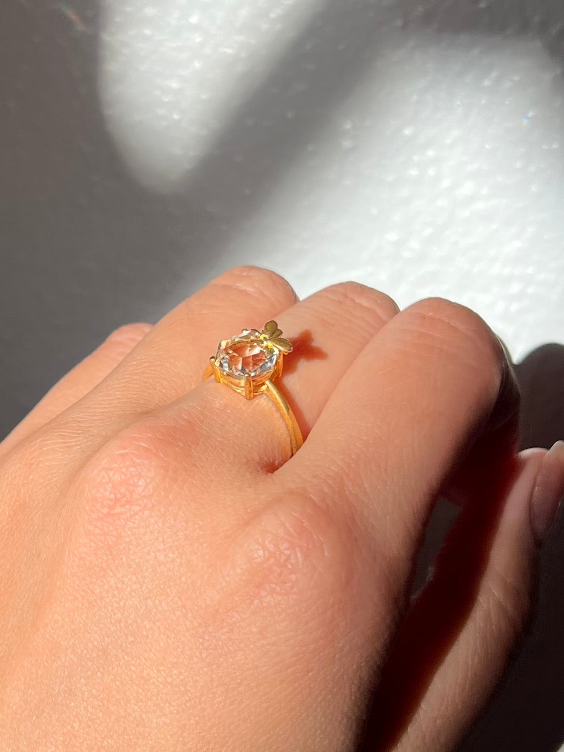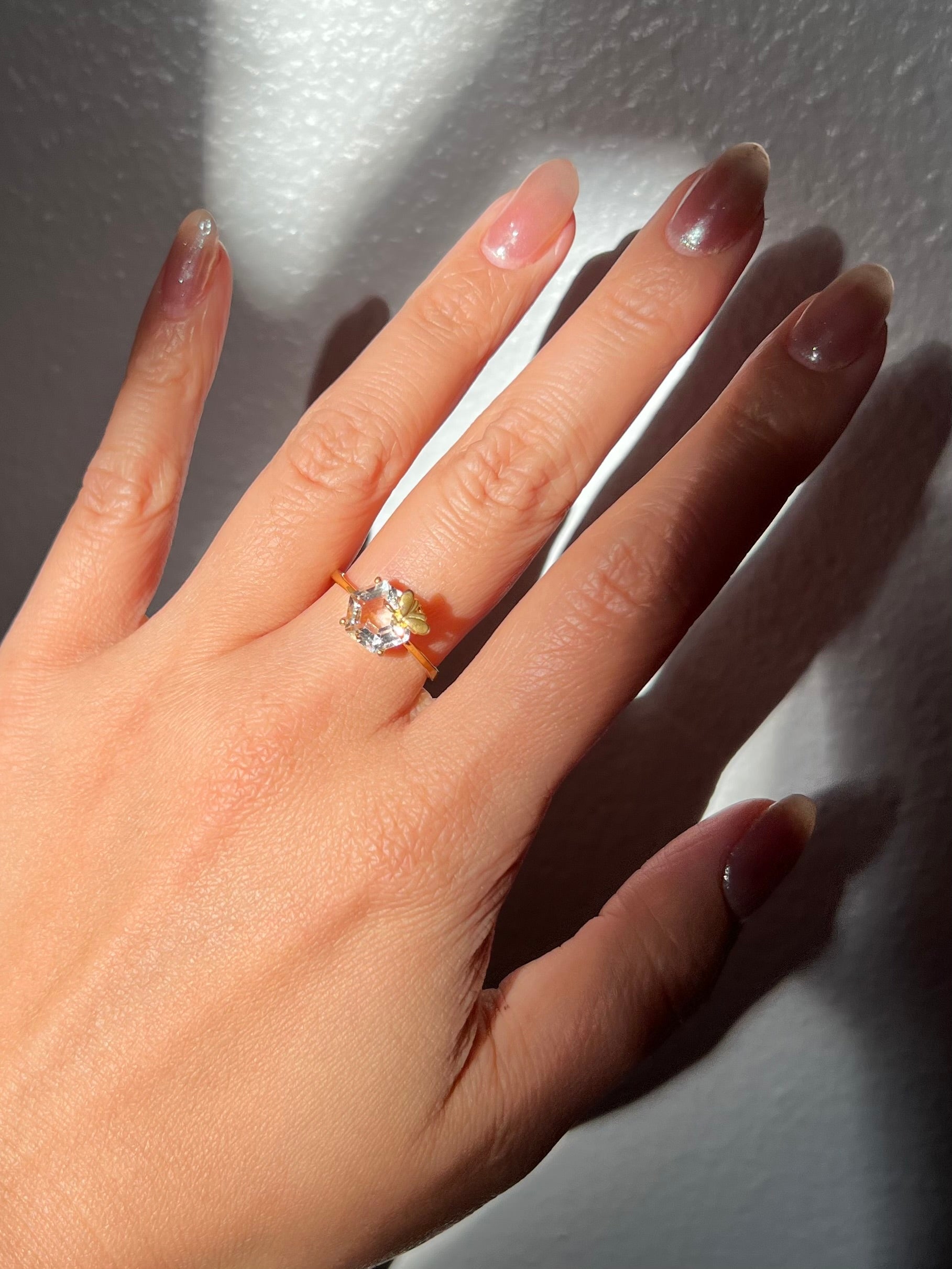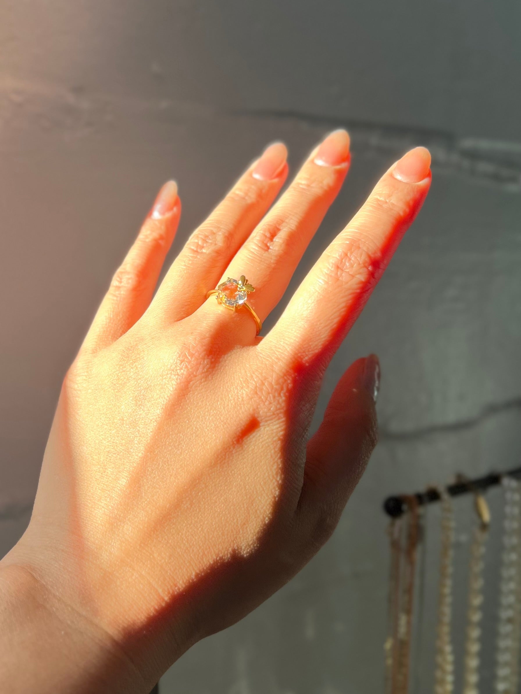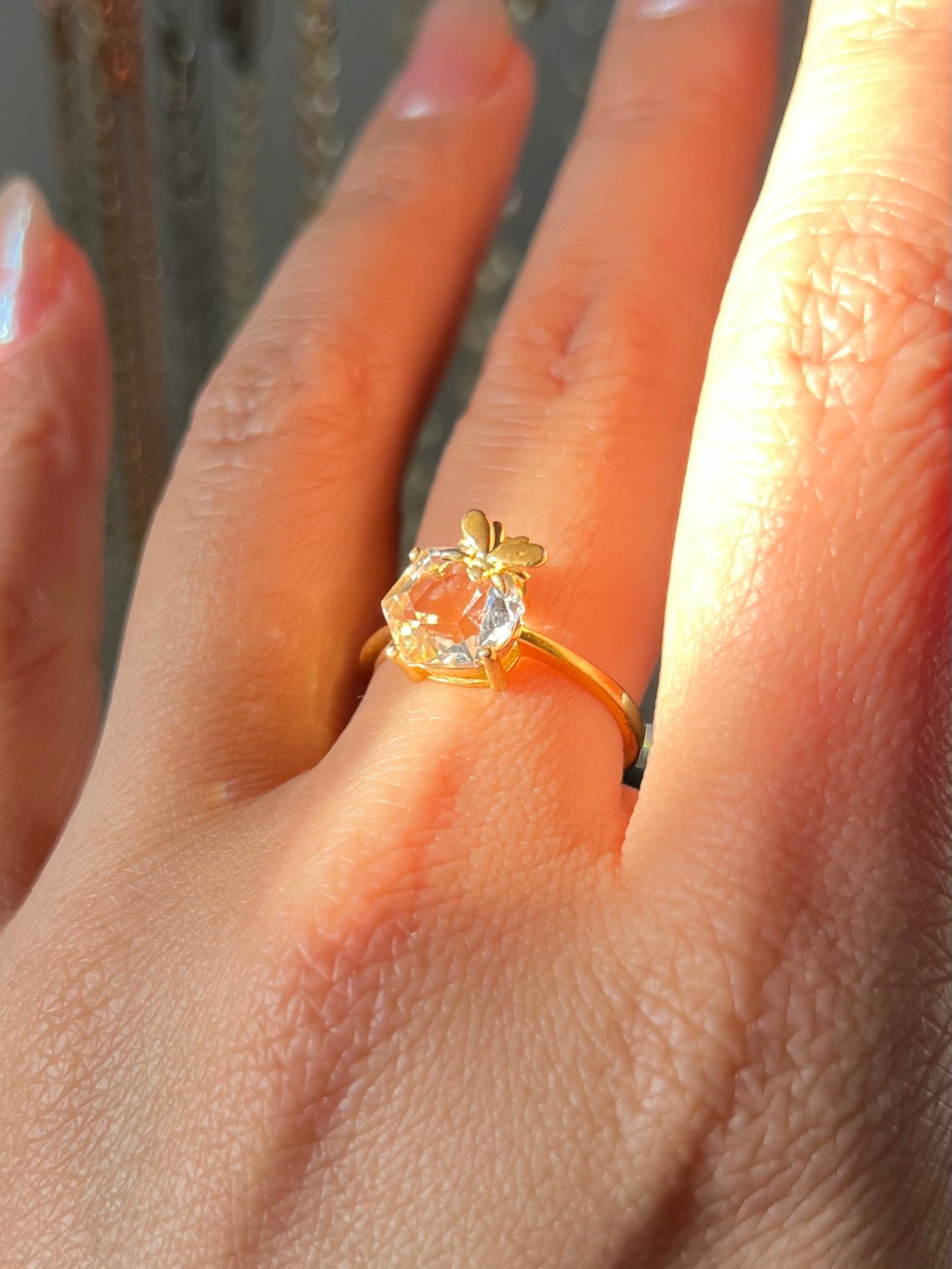 A gentle shimmer. A golden bee. A natural clear quartz cut into a perfect hexagon—just like the heart of a honeycomb. This ring brings quiet luxury to your warm-weather wardrobe, designed to reflect calm, clarity, and effortless style.