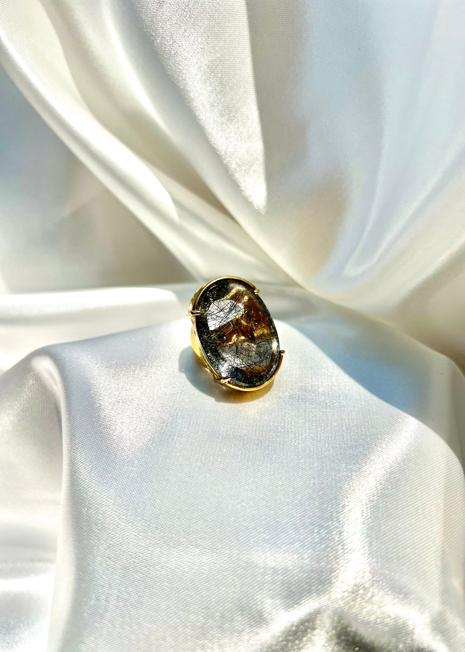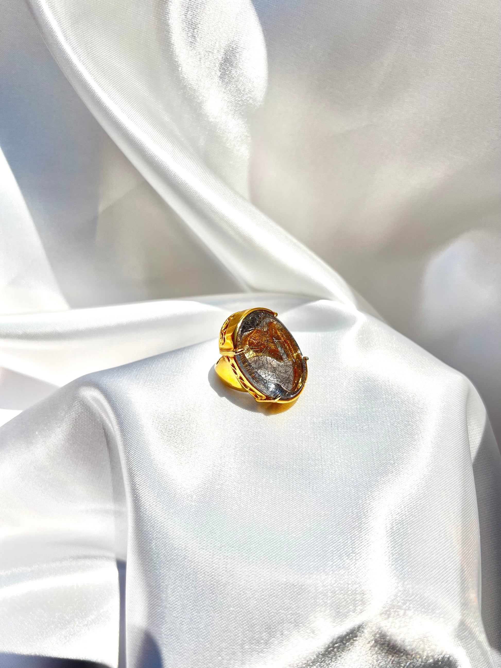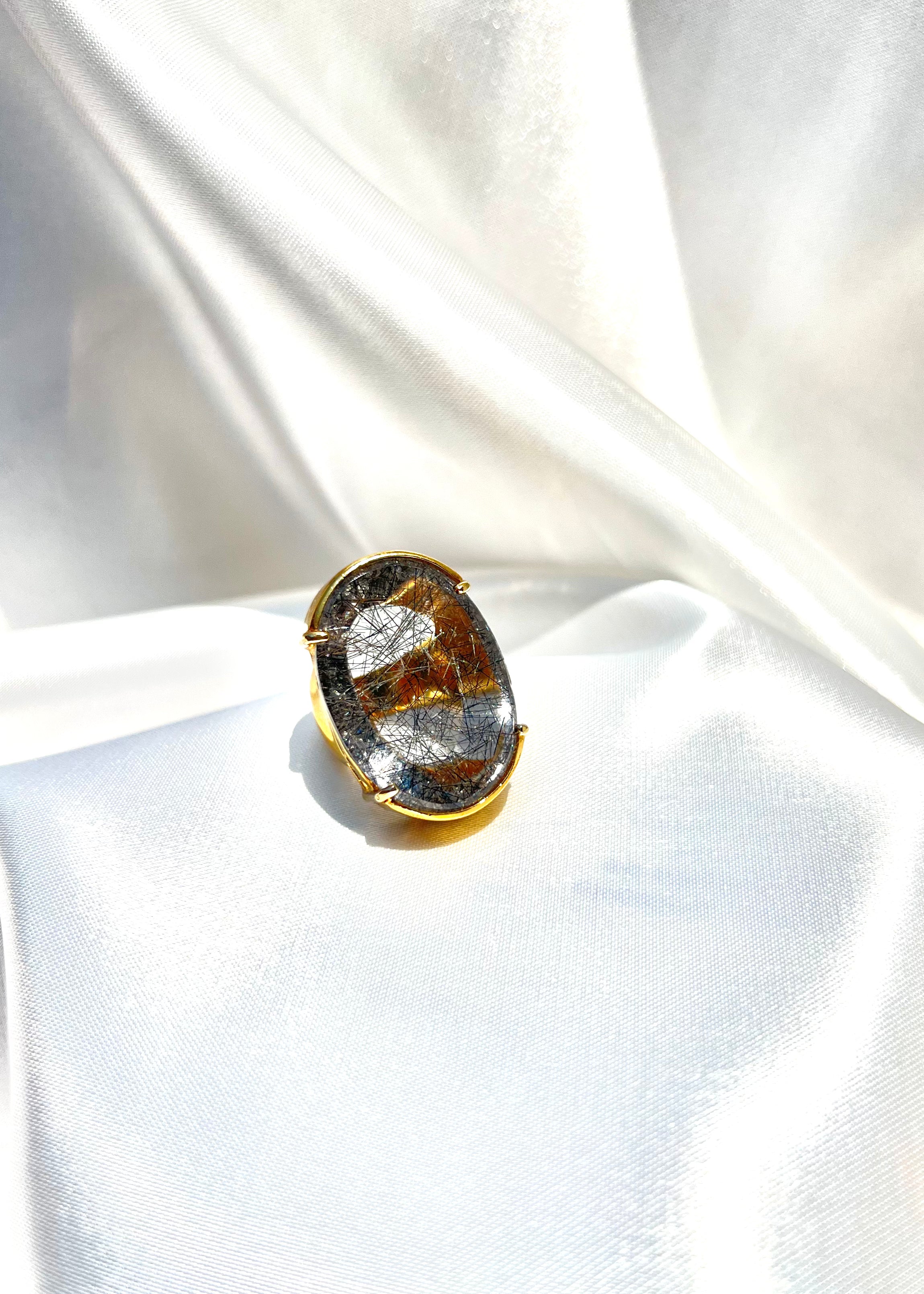 This Ice Rutile Crystal Chunky Ring features a stunning Rutile Crystal Quartz center stone that is sure to catch the eye. The unique rutile patterns within the quartz add a touch of elegance to any outfit.