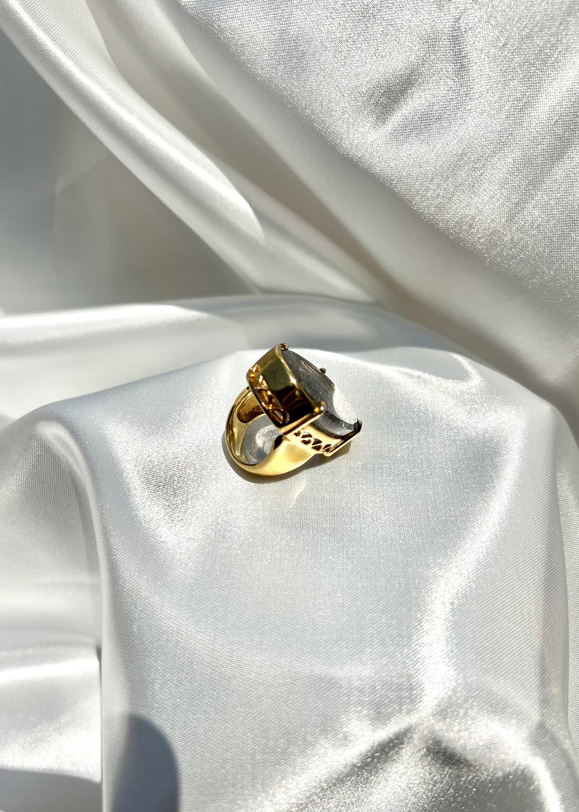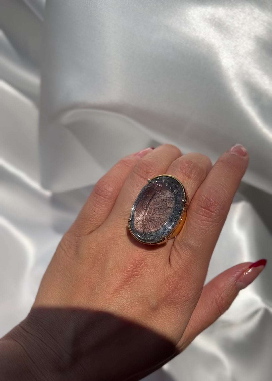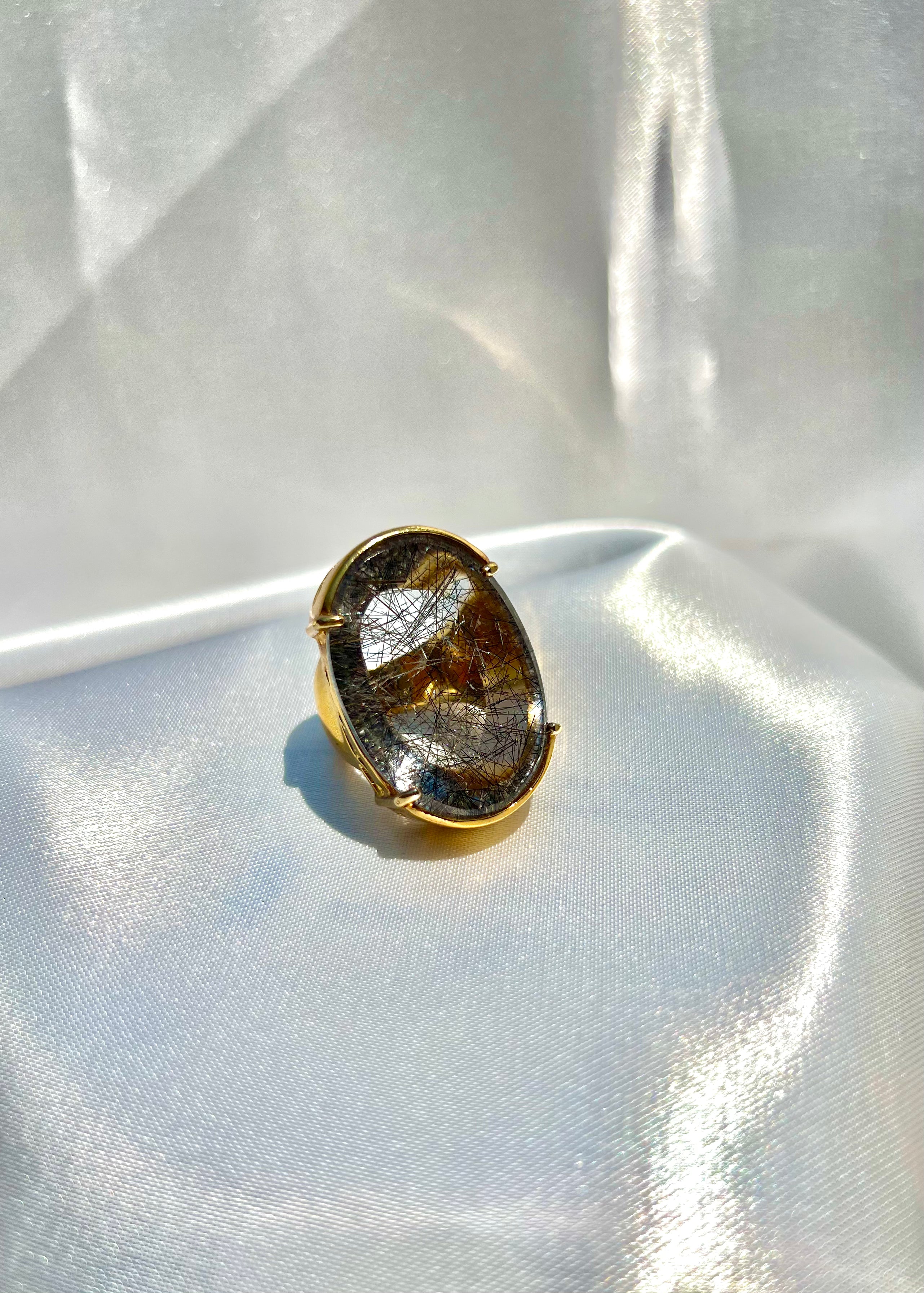 This Ice Rutile Crystal Chunky Ring features a stunning Rutile Crystal Quartz center stone that is sure to catch the eye. The unique rutile patterns within the quartz add a touch of elegance to any outfit.