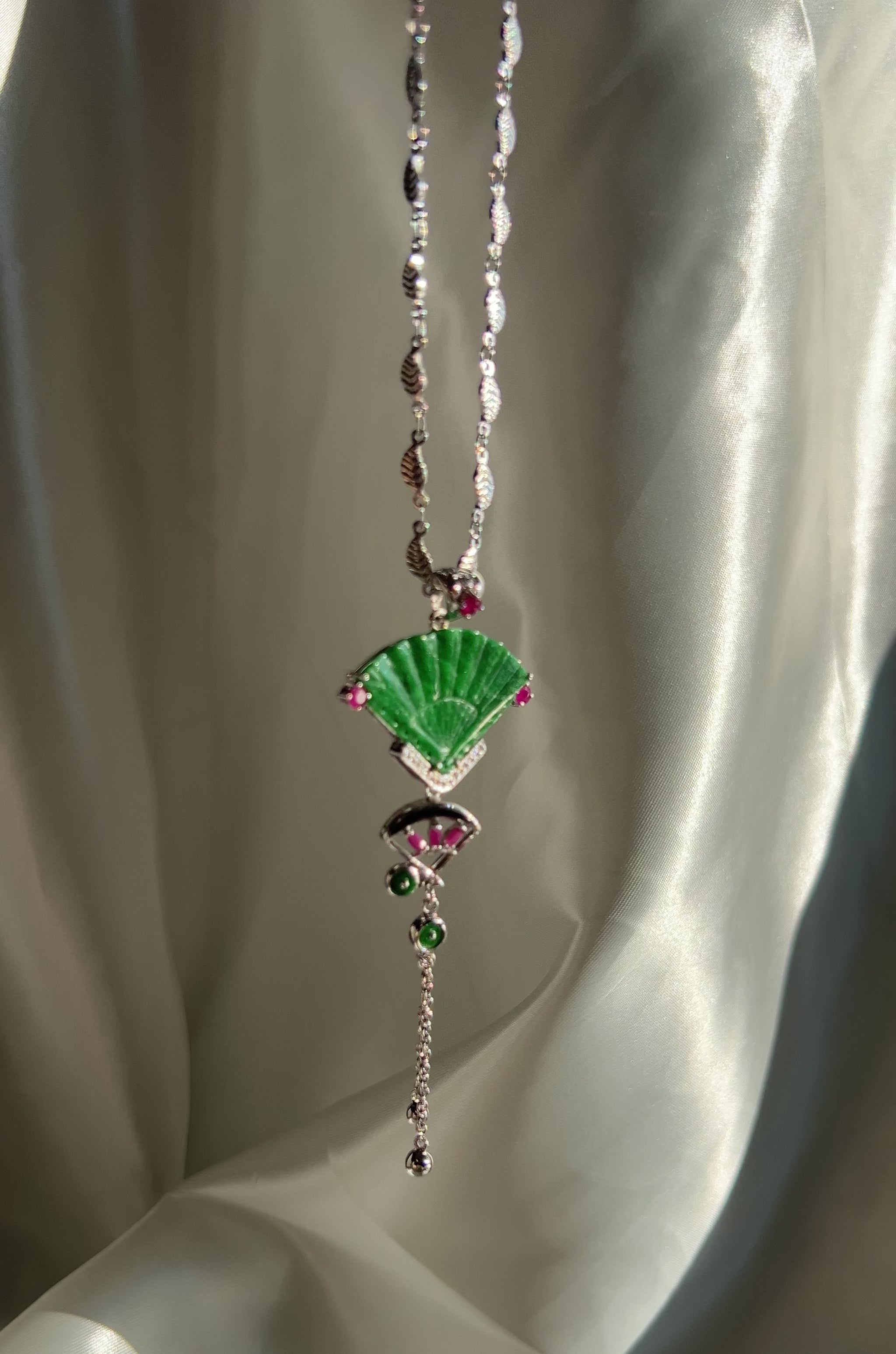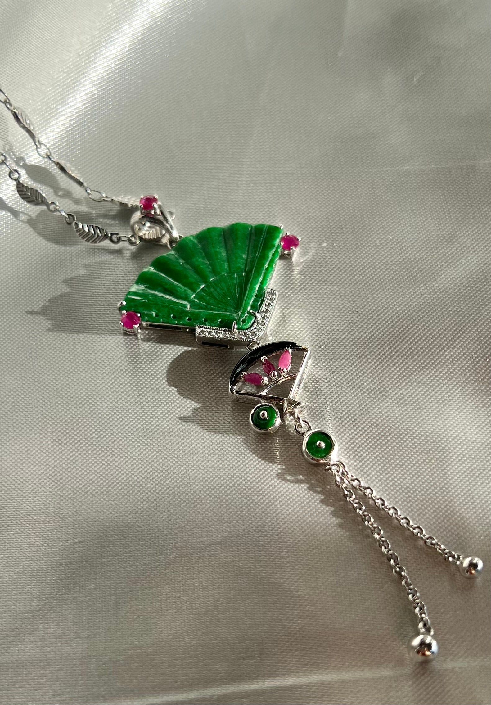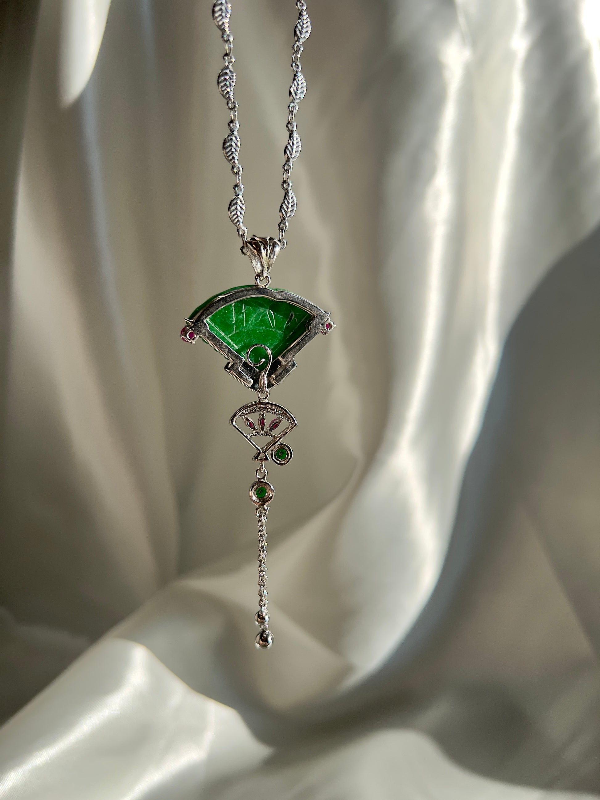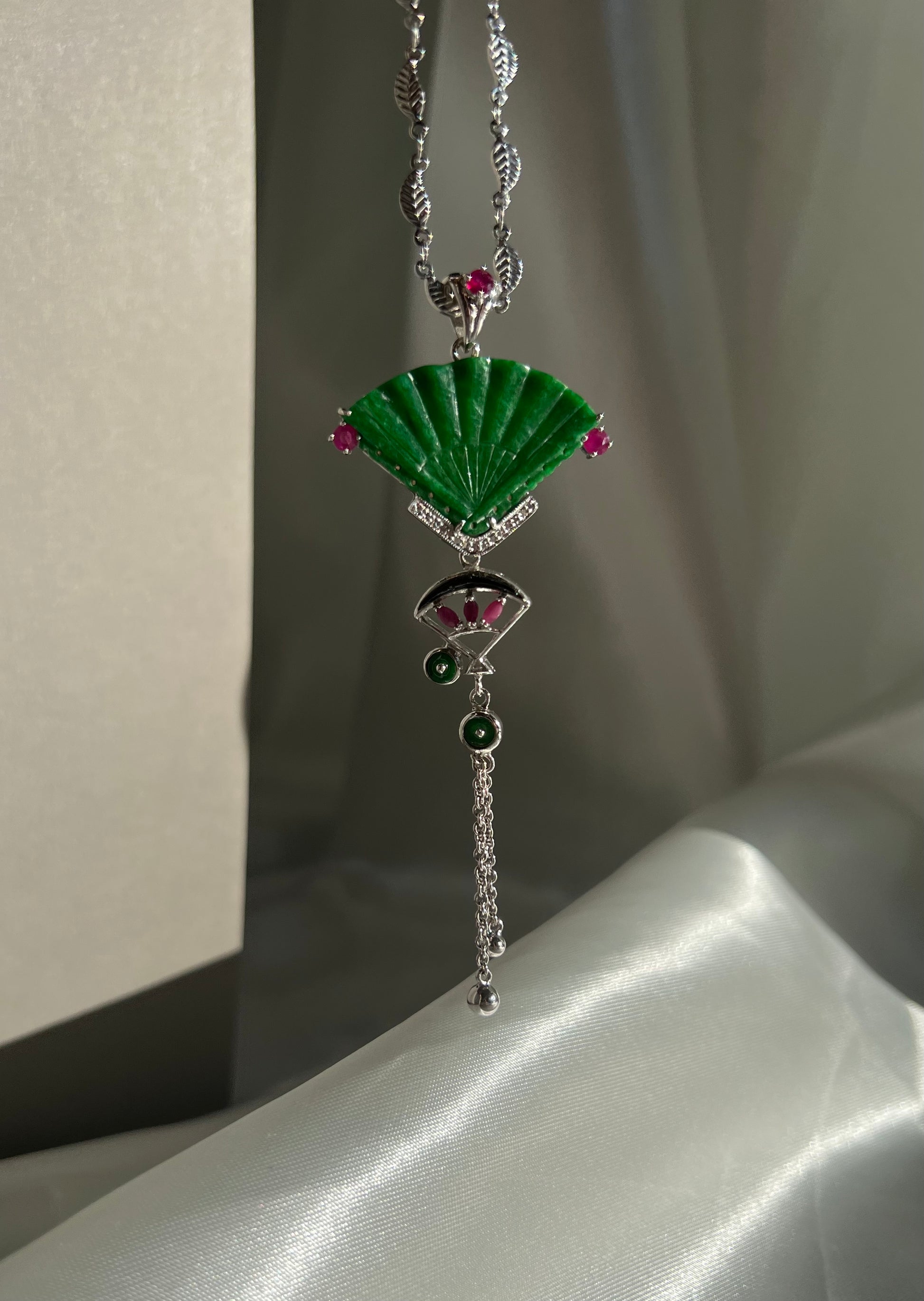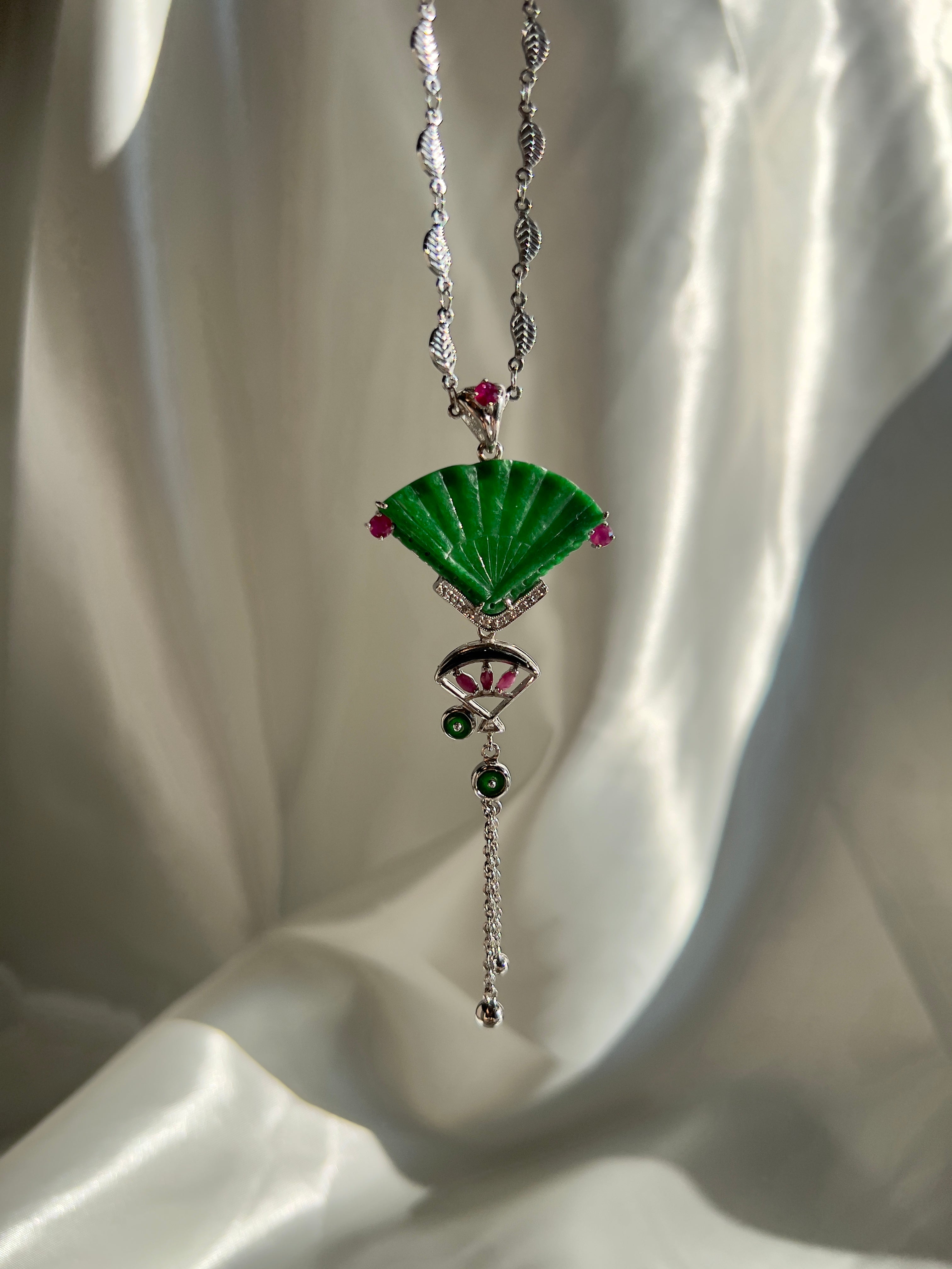 Jadeite Jade & Ruby Fan Pendant Necklace