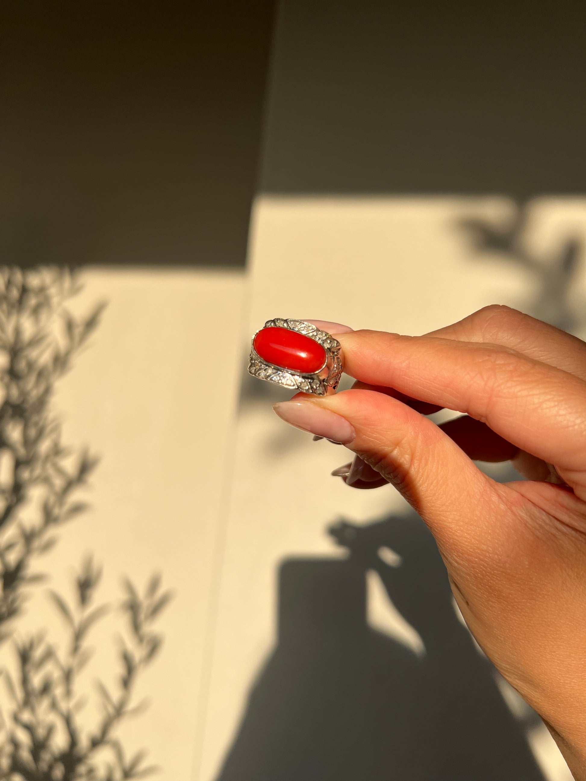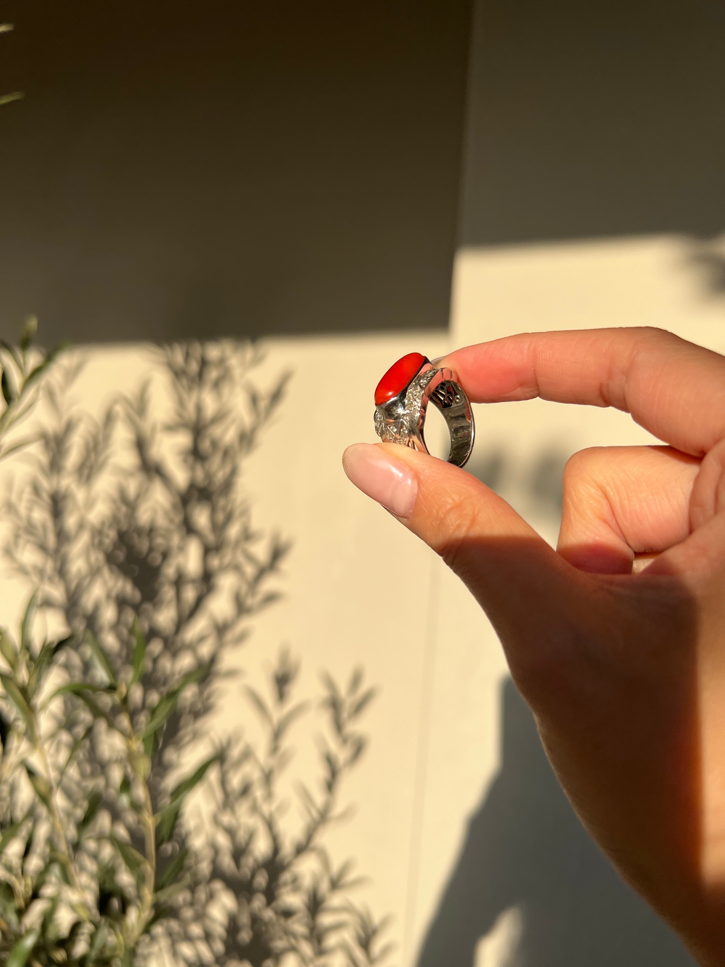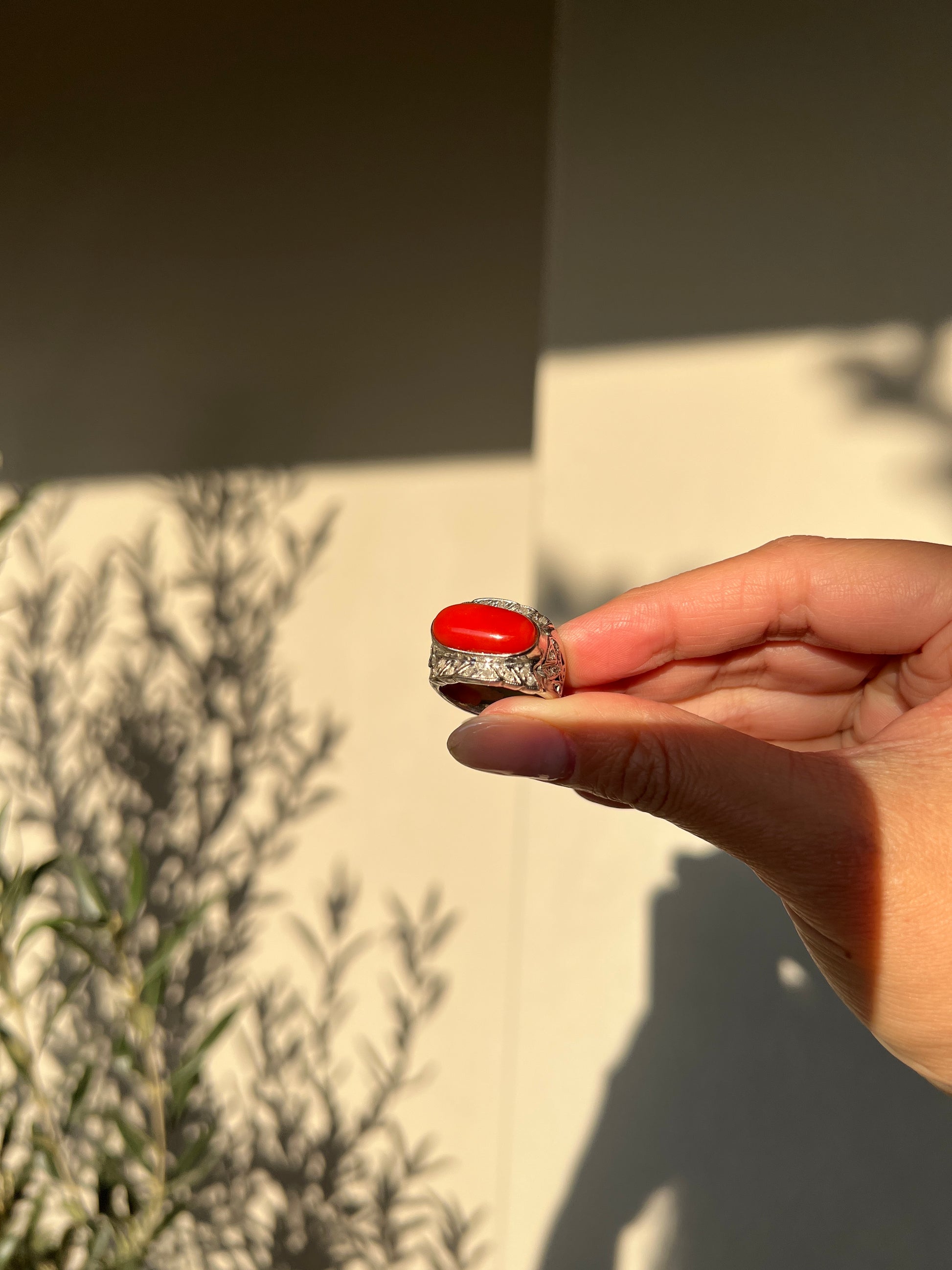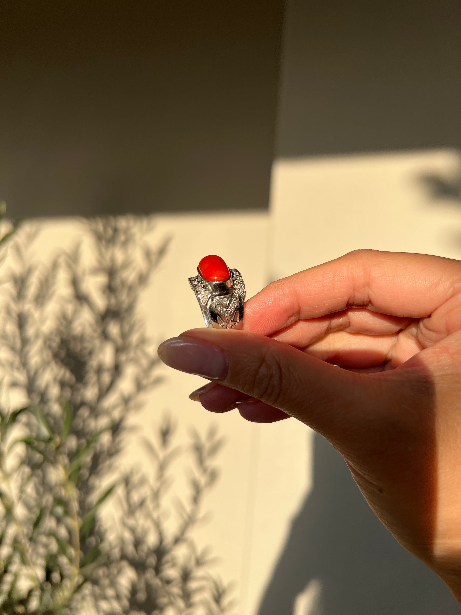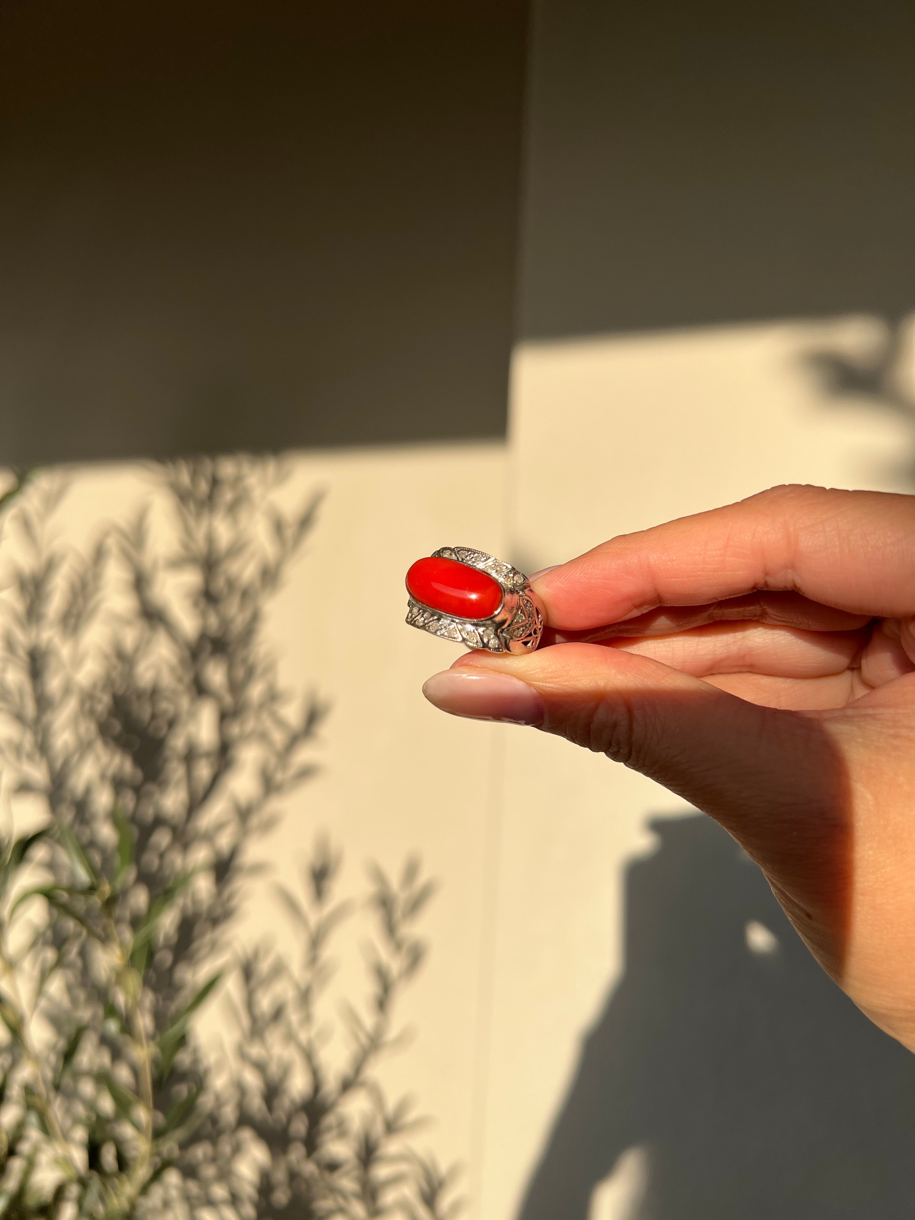 Japanese Red Coral (OX Blood Coral) and Diamond Ring in 18K White Gold