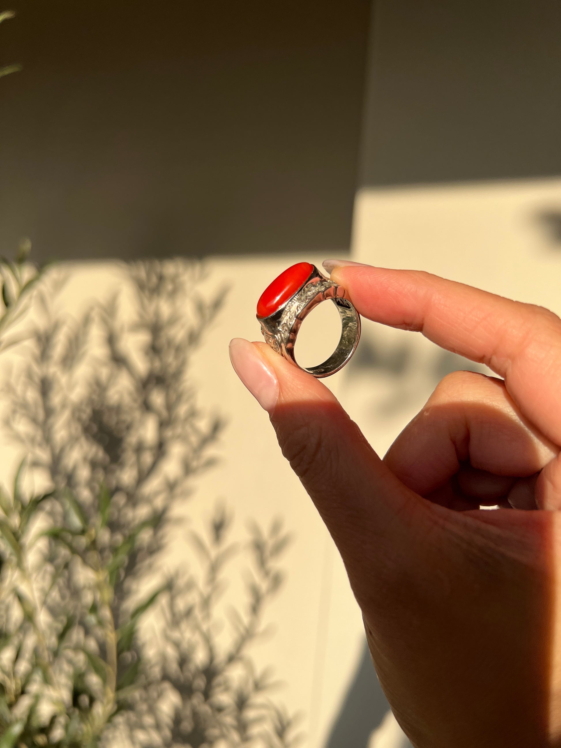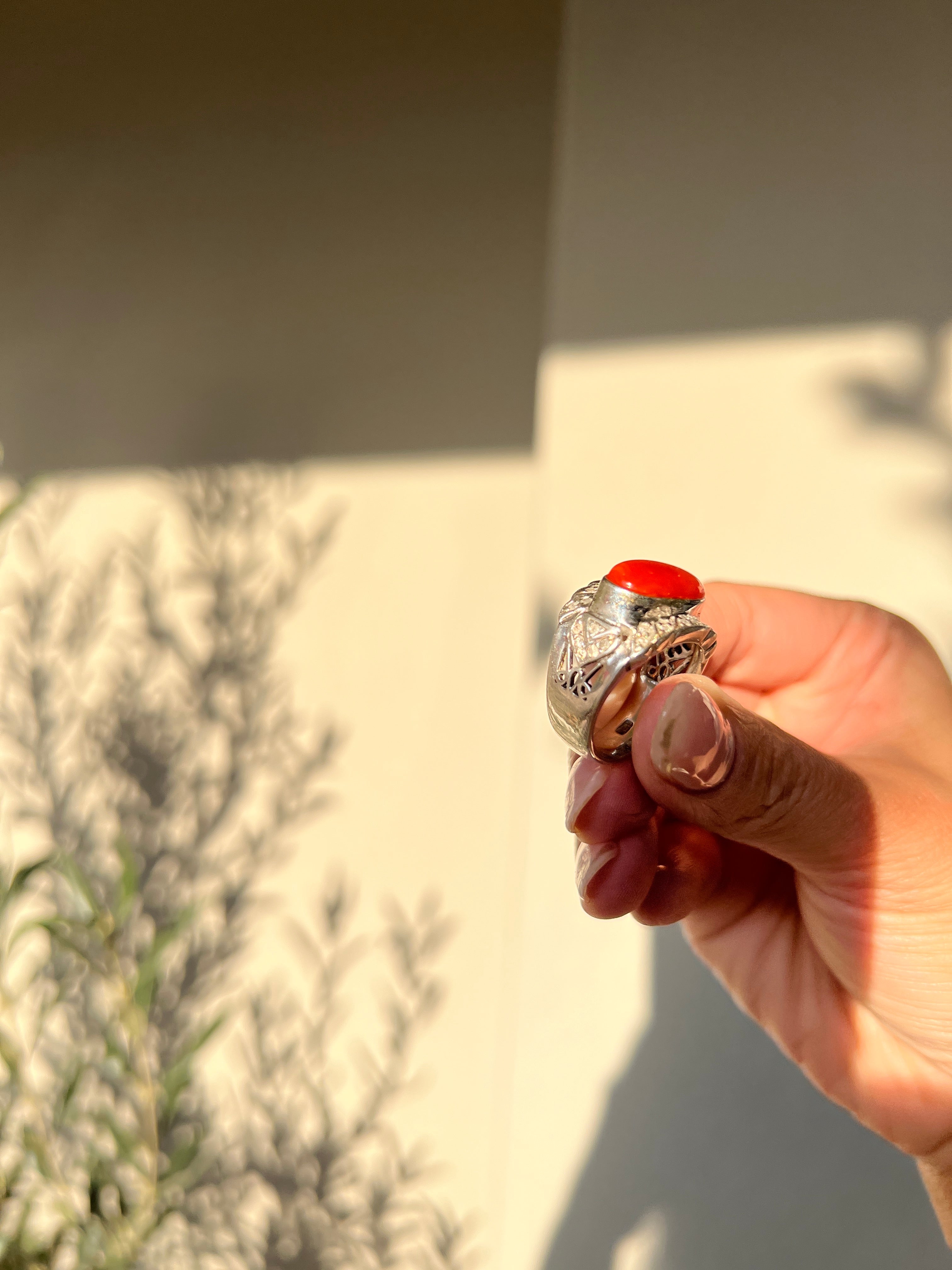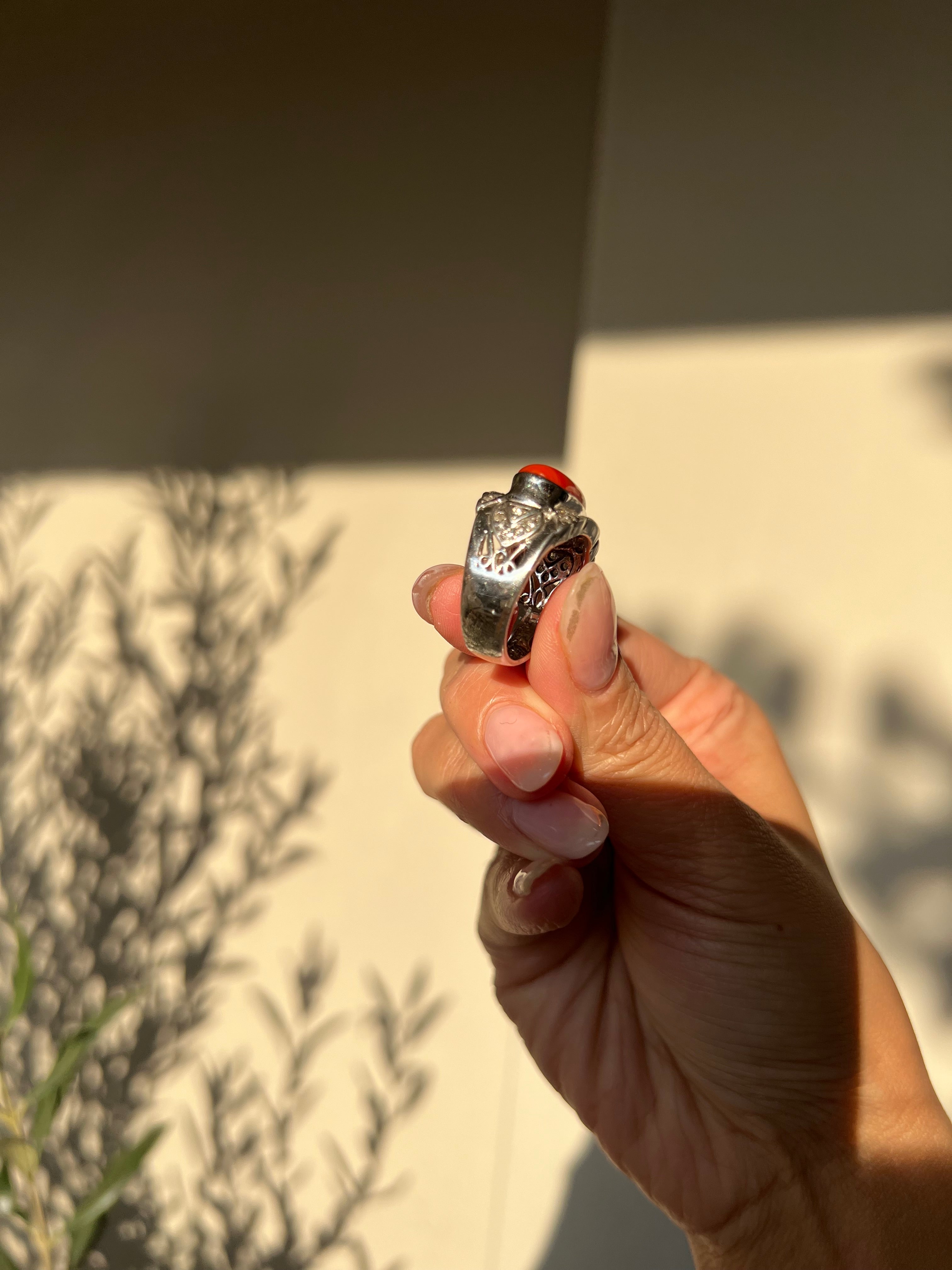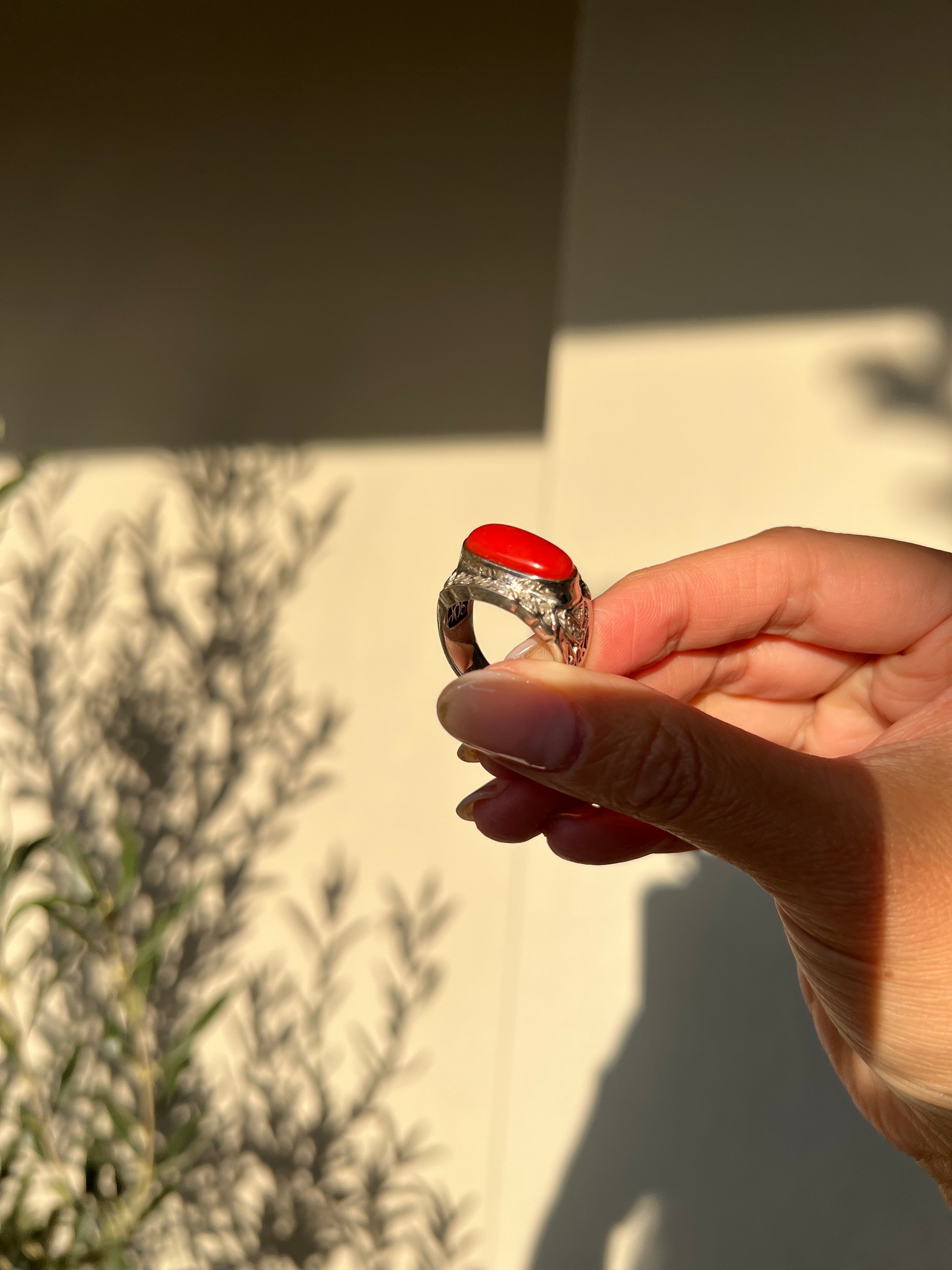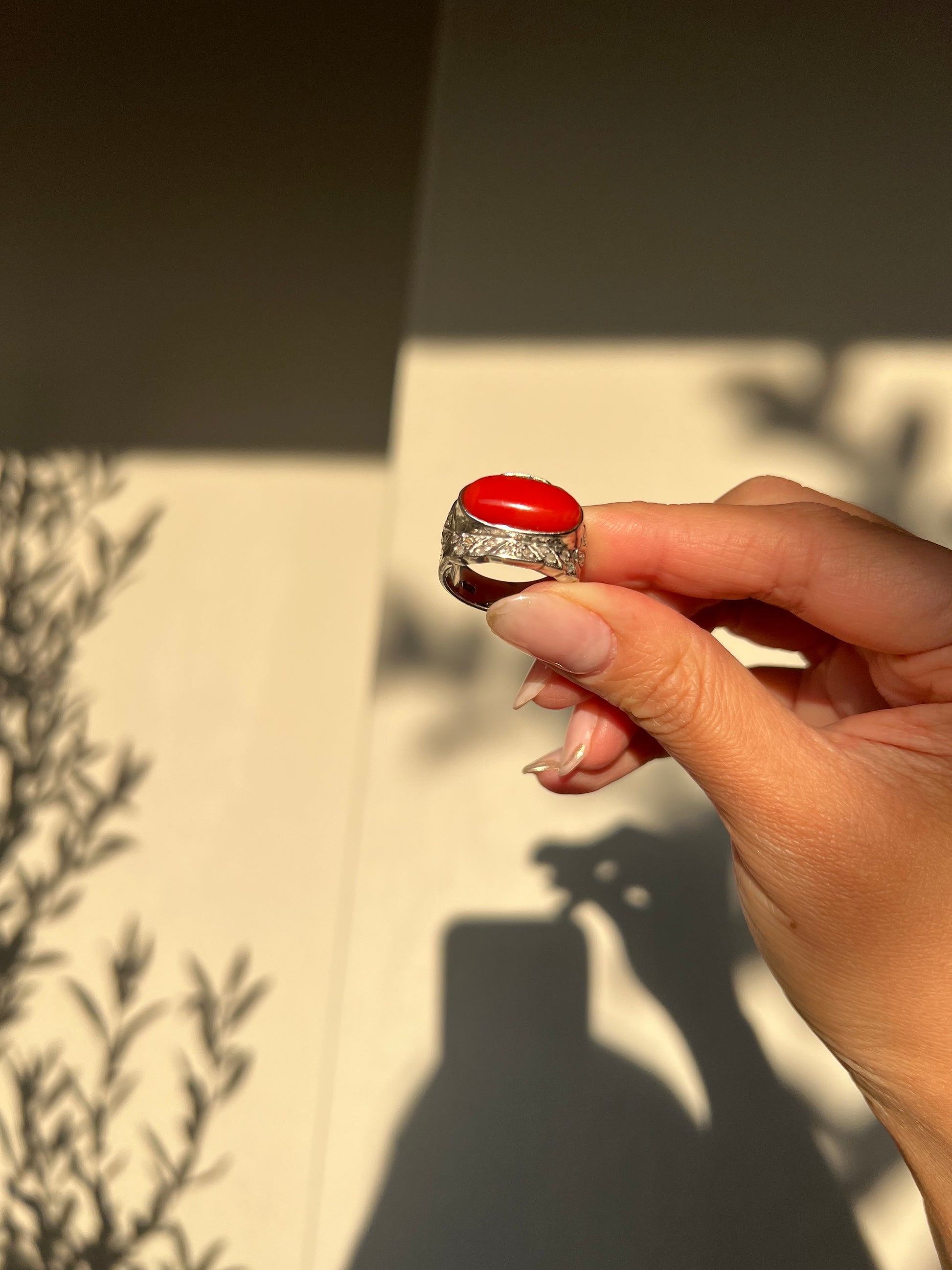 Japanese Red Coral (OX Blood Coral) and Diamond Ring in 18K White Gold