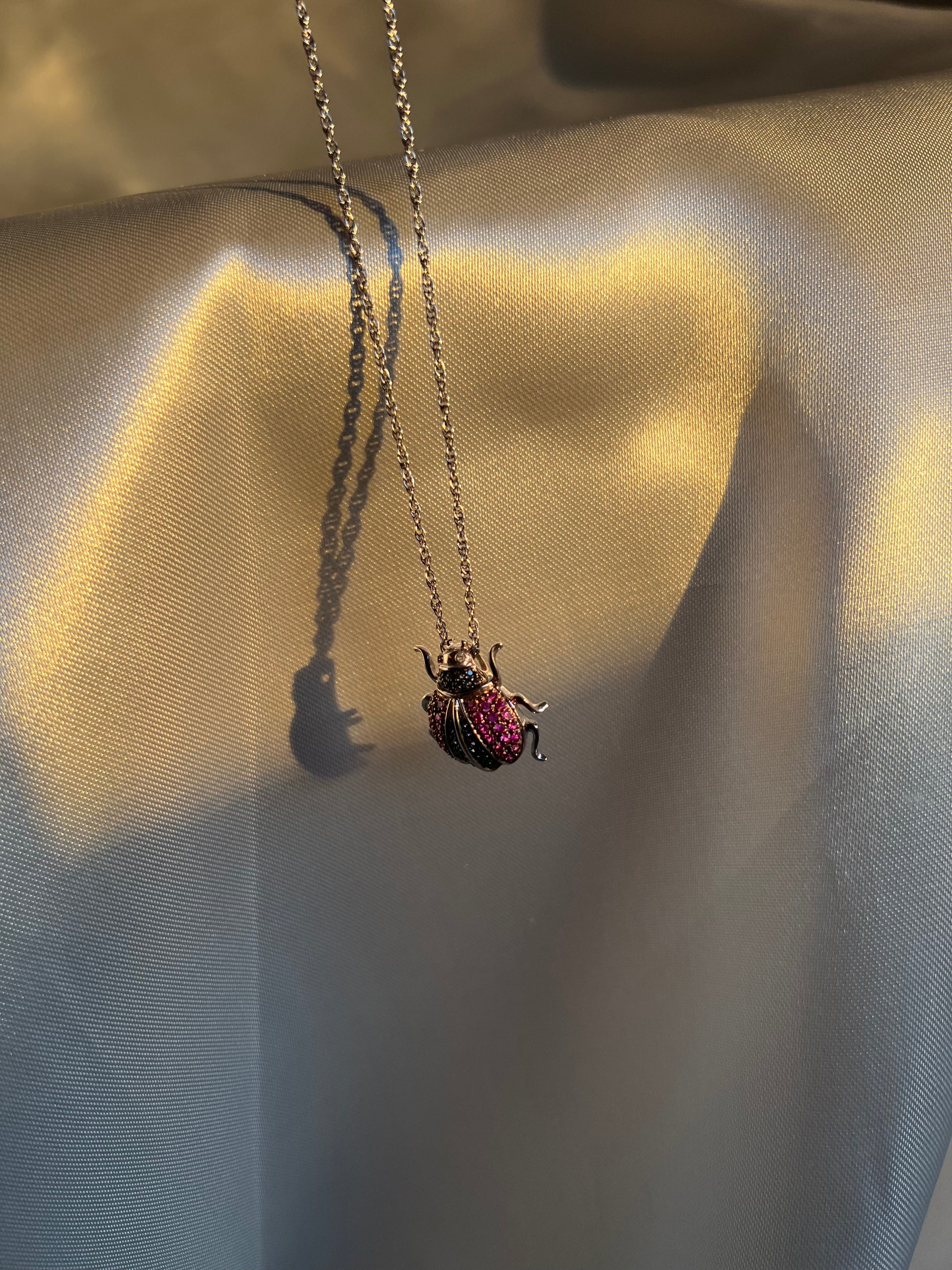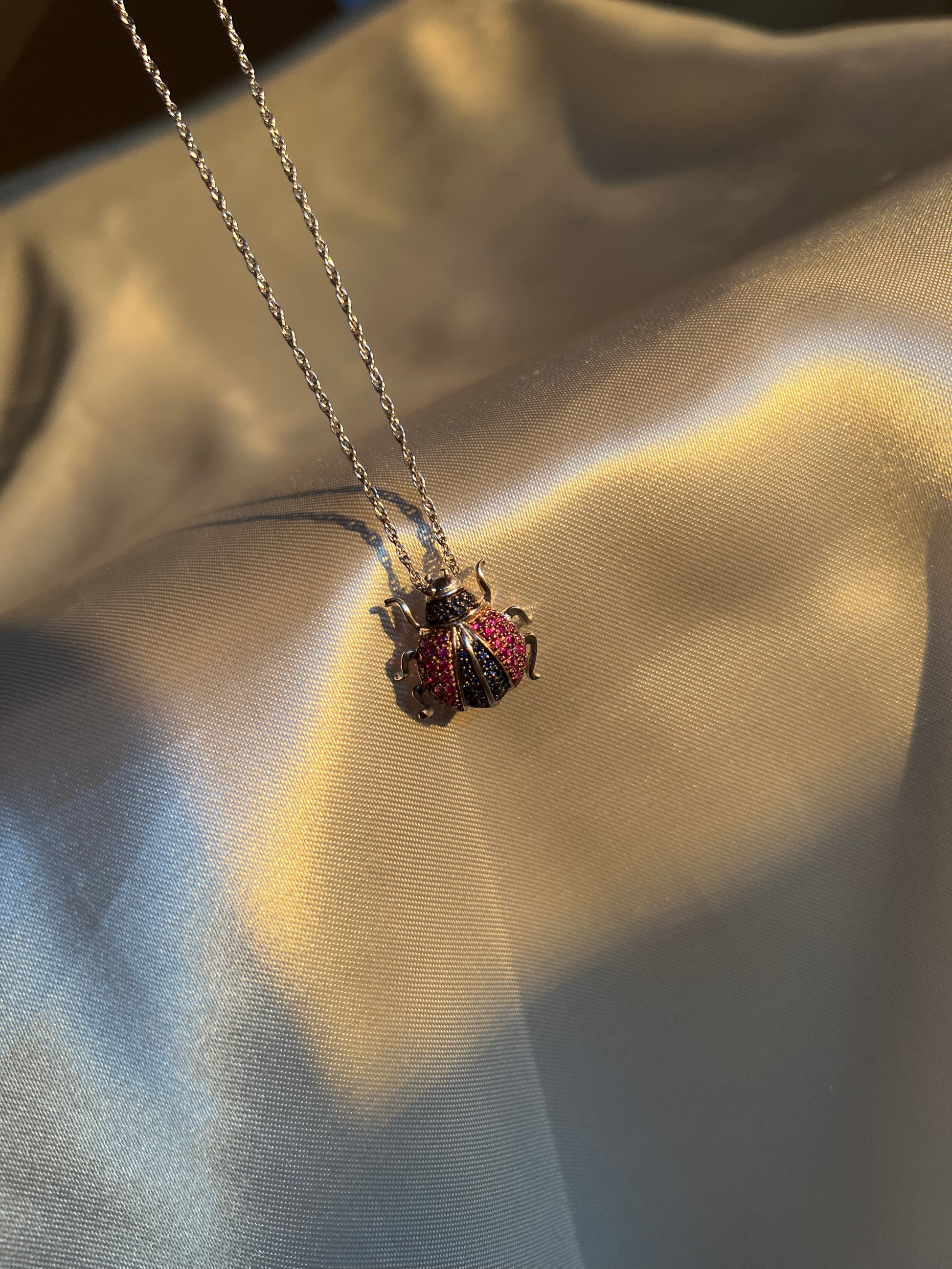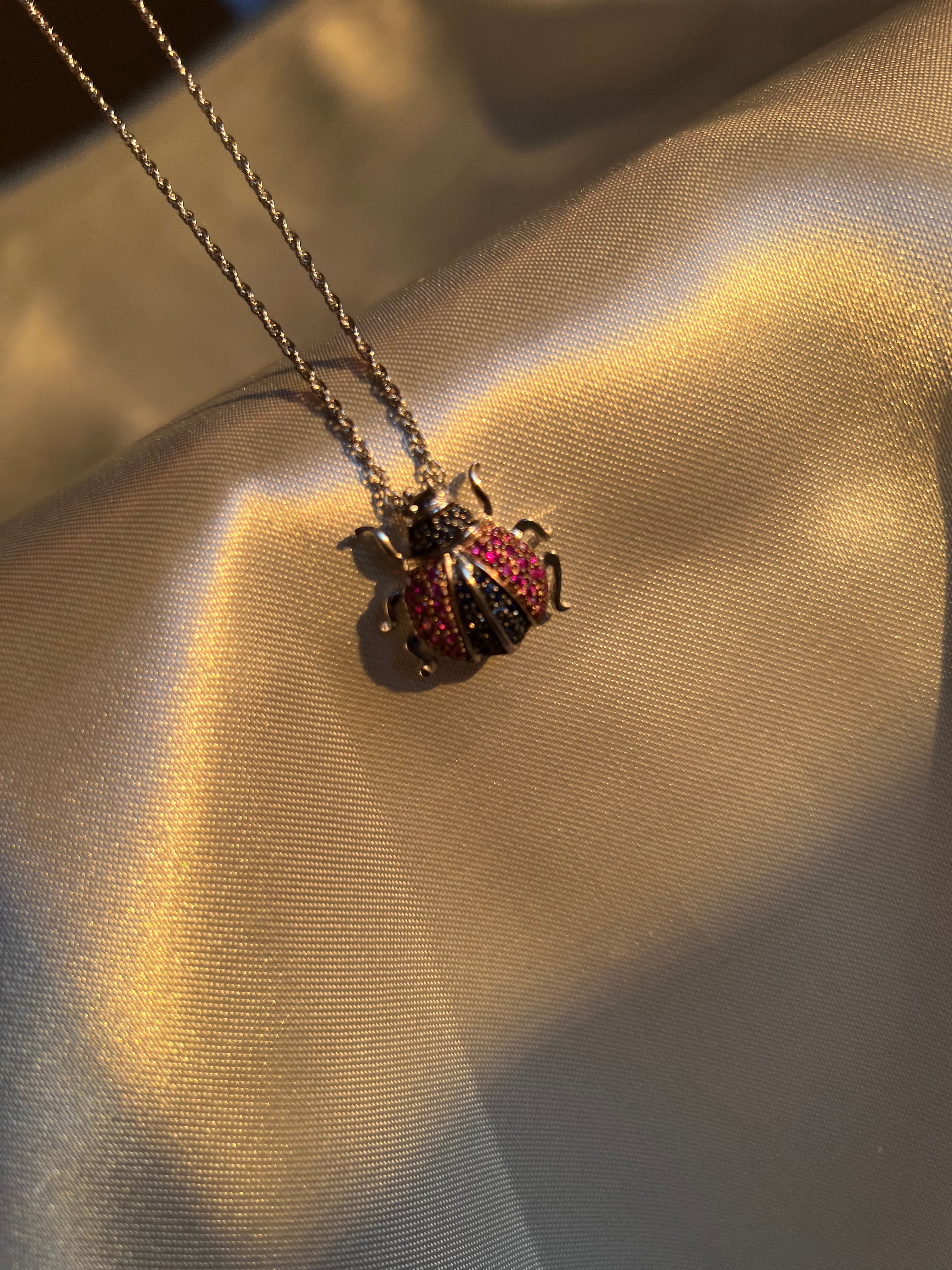 The necklace features lucky and glorious in ladybug shape embellished with pave setting rubies total weight 1.8carats and deep blue tone sapphires total weight 1.5 carats. In almost all world cultures believe that ladybug/ladybird are an embodiment of lady luck, it brings good fortune and prosperity along with it. delicate yet elegant, It's perfect for collector and can be worn any occasion.