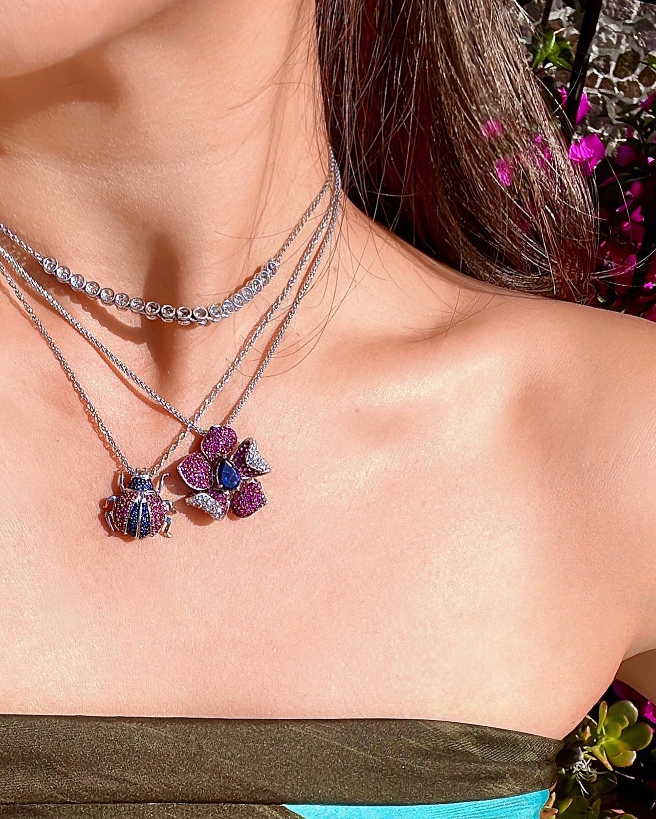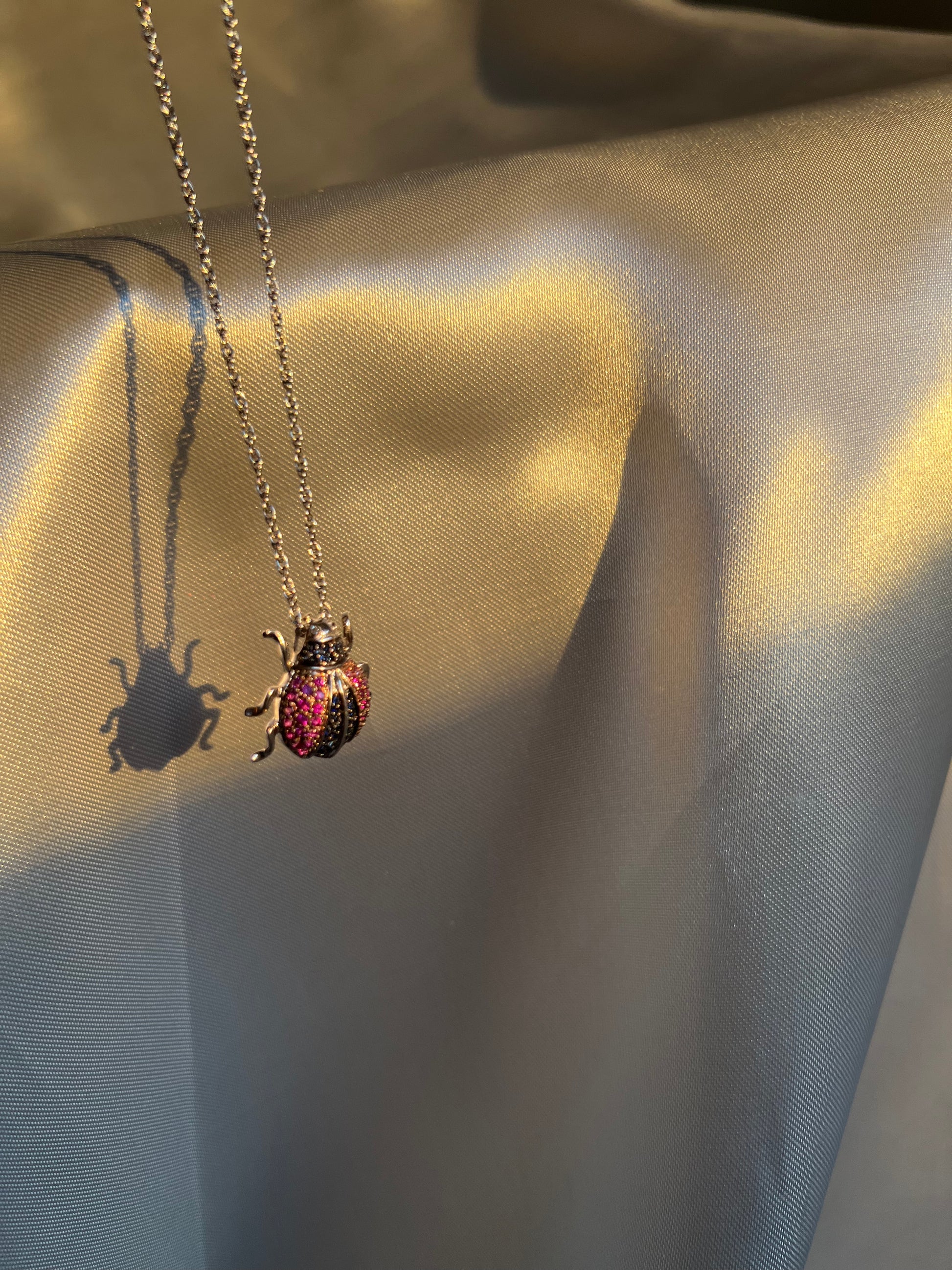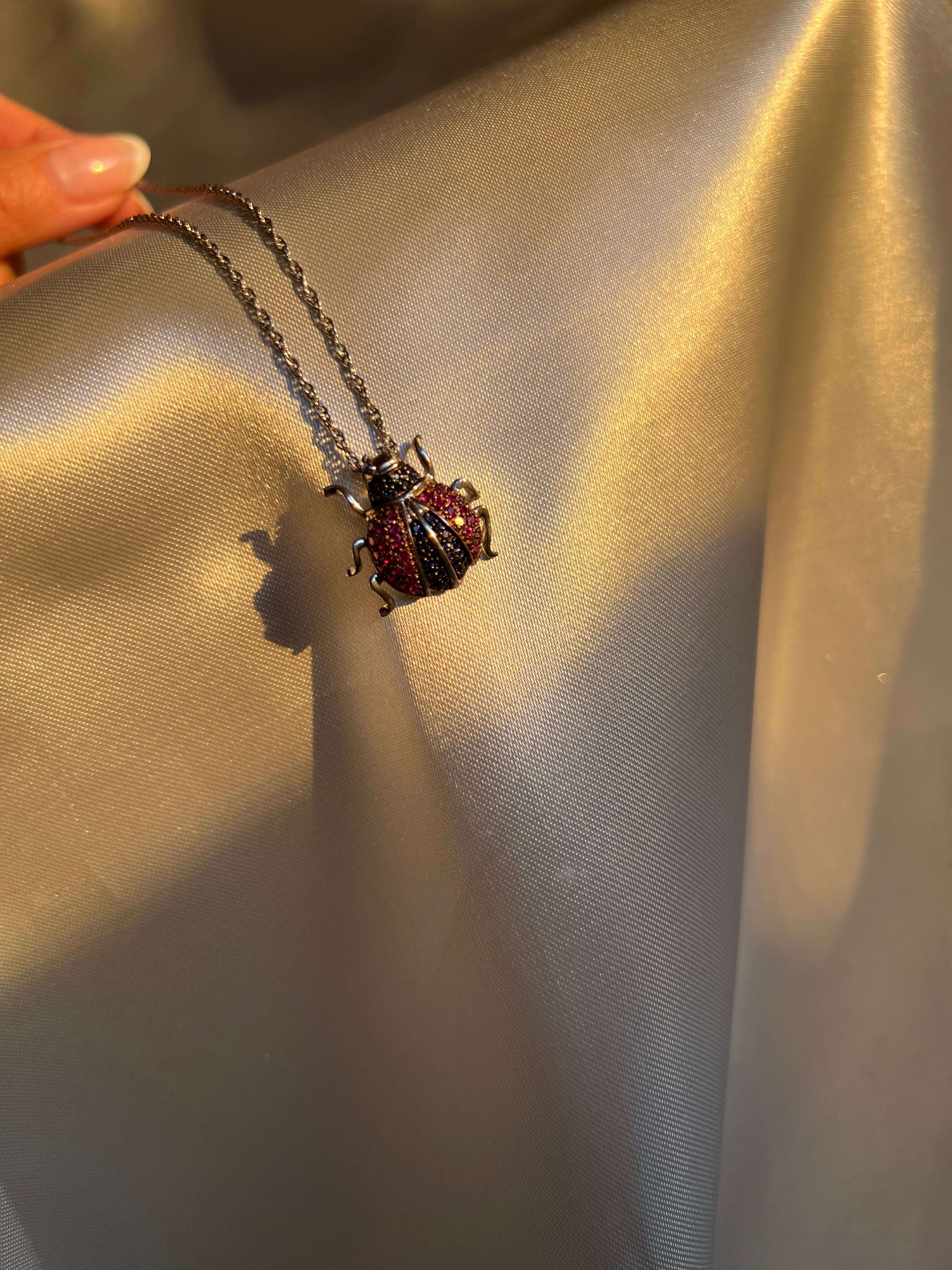 The necklace features lucky and glorious in ladybug shape embellished with pave setting rubies total weight 1.8carats and deep blue tone sapphires total weight 1.5 carats. In almost all world cultures believe that ladybug/ladybird are an embodiment of lady luck, it brings good fortune and prosperity along with it. delicate yet elegant, It's perfect for collector and can be worn any occasion.