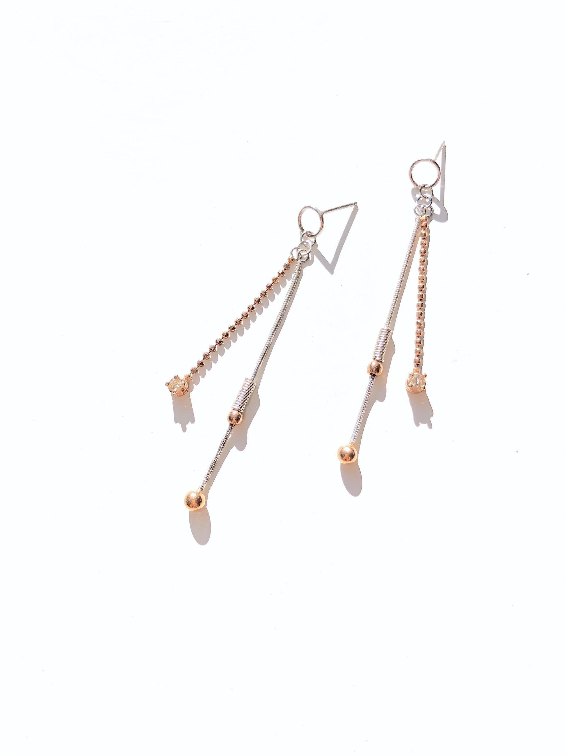 Faceted baubles in two tones of gold, tipped with brilliant-cut .25ct prong-set diamonds, add kinetic movement to the slender chains of these wispy drop earrings. They expertly catch and reflect light, making them minimalist linear diamond earrings that flatter and complement any outfit.