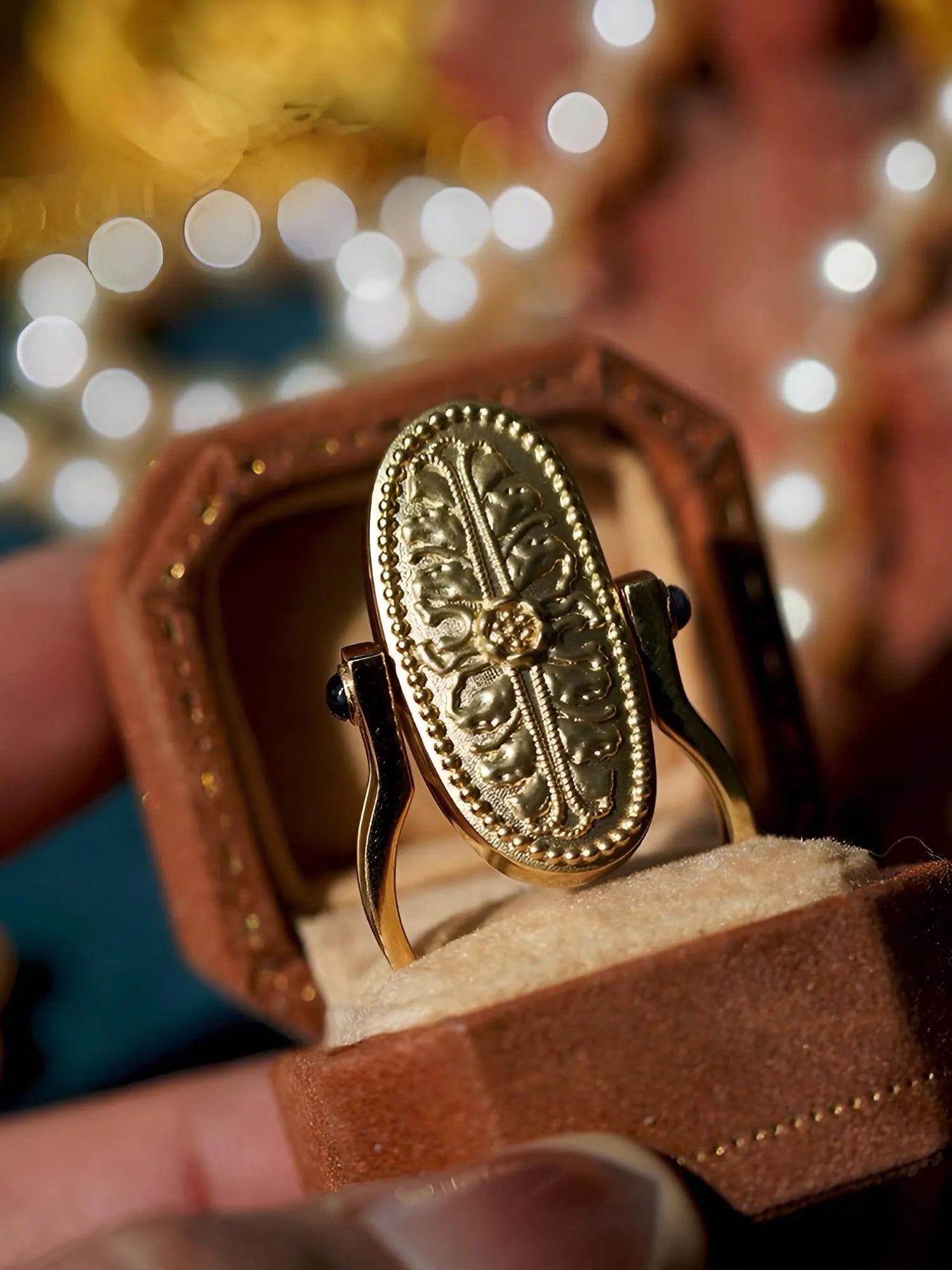 The ring's unique reversible design allows you to enjoy two beautiful looks in one—wear the opal's vibrant hues or flip to reveal the classic floral gold pattern. Plus you also can wear it as a pendant for necklace.