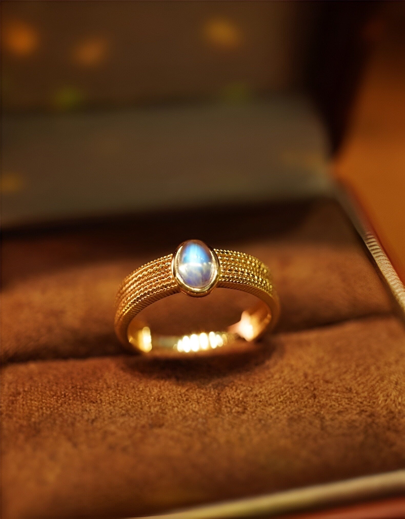 Beautiful vintage ring made with Blue sheen of moonstone and timeless 14k solid yellow gold. Wearing moonstone is believed to enhance intuition, promote emotional balance, and attract good fortune, making this ring both a beautiful and meaningful jewelry.