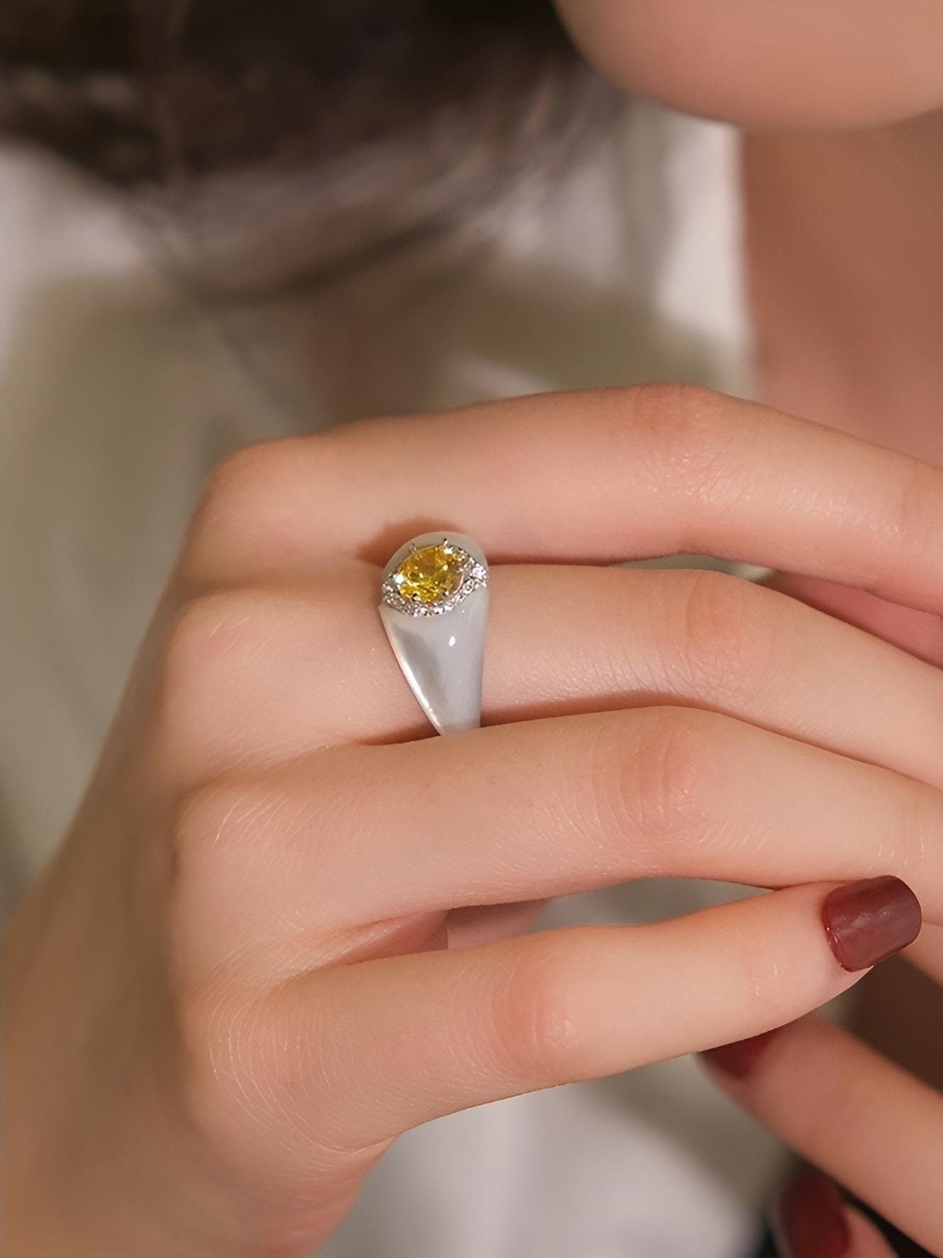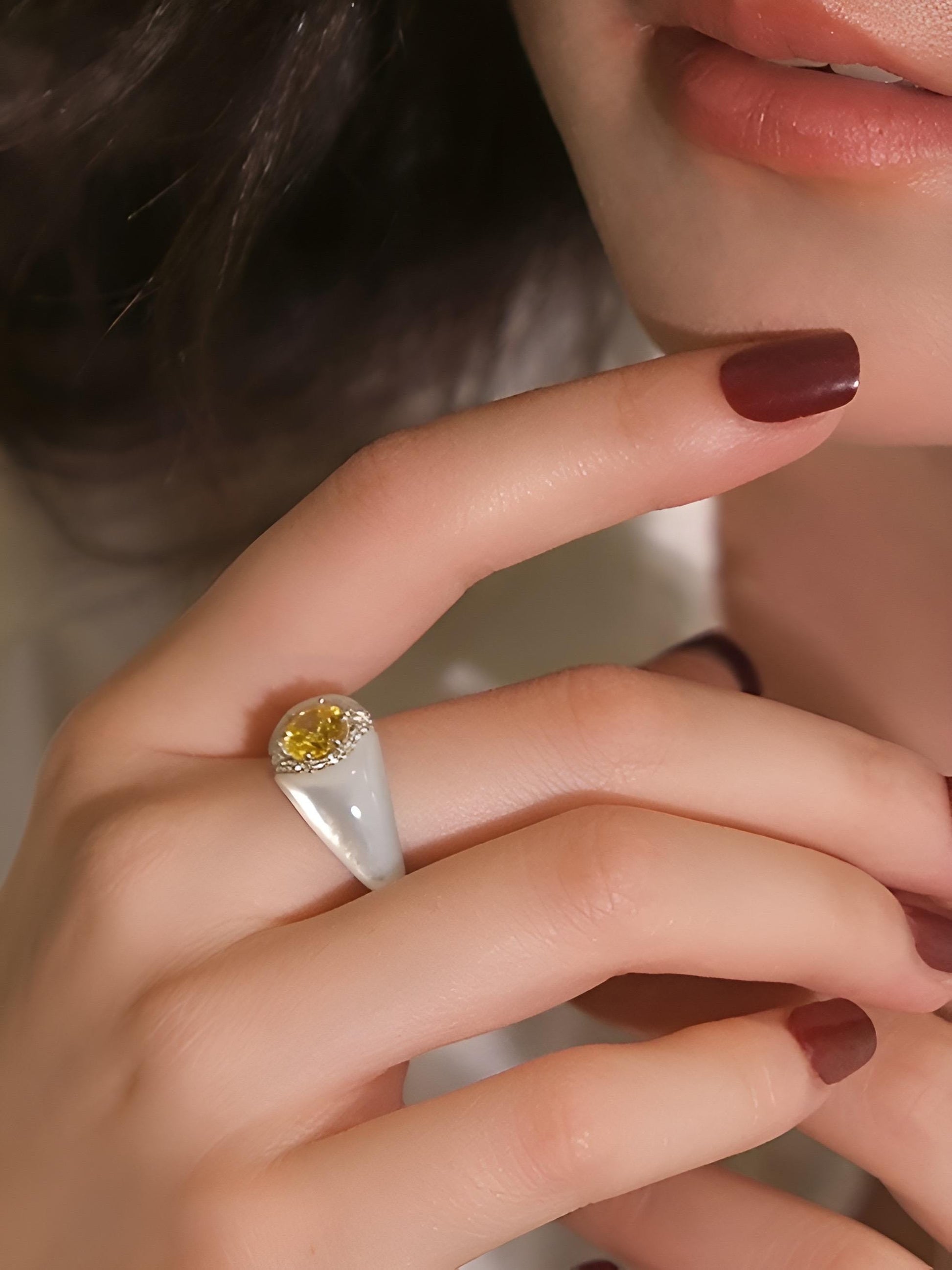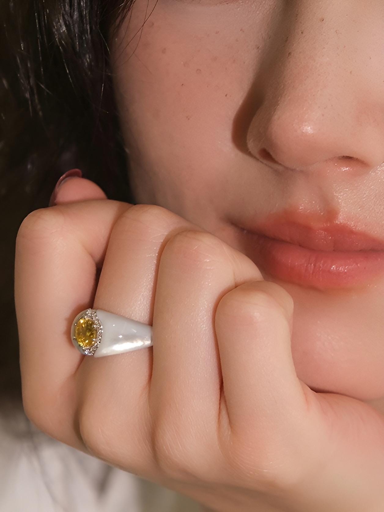 Materials: 18k white gold vermeil with natural yellow and white zircon ( not synthetic zirconia) and white mother of pearl