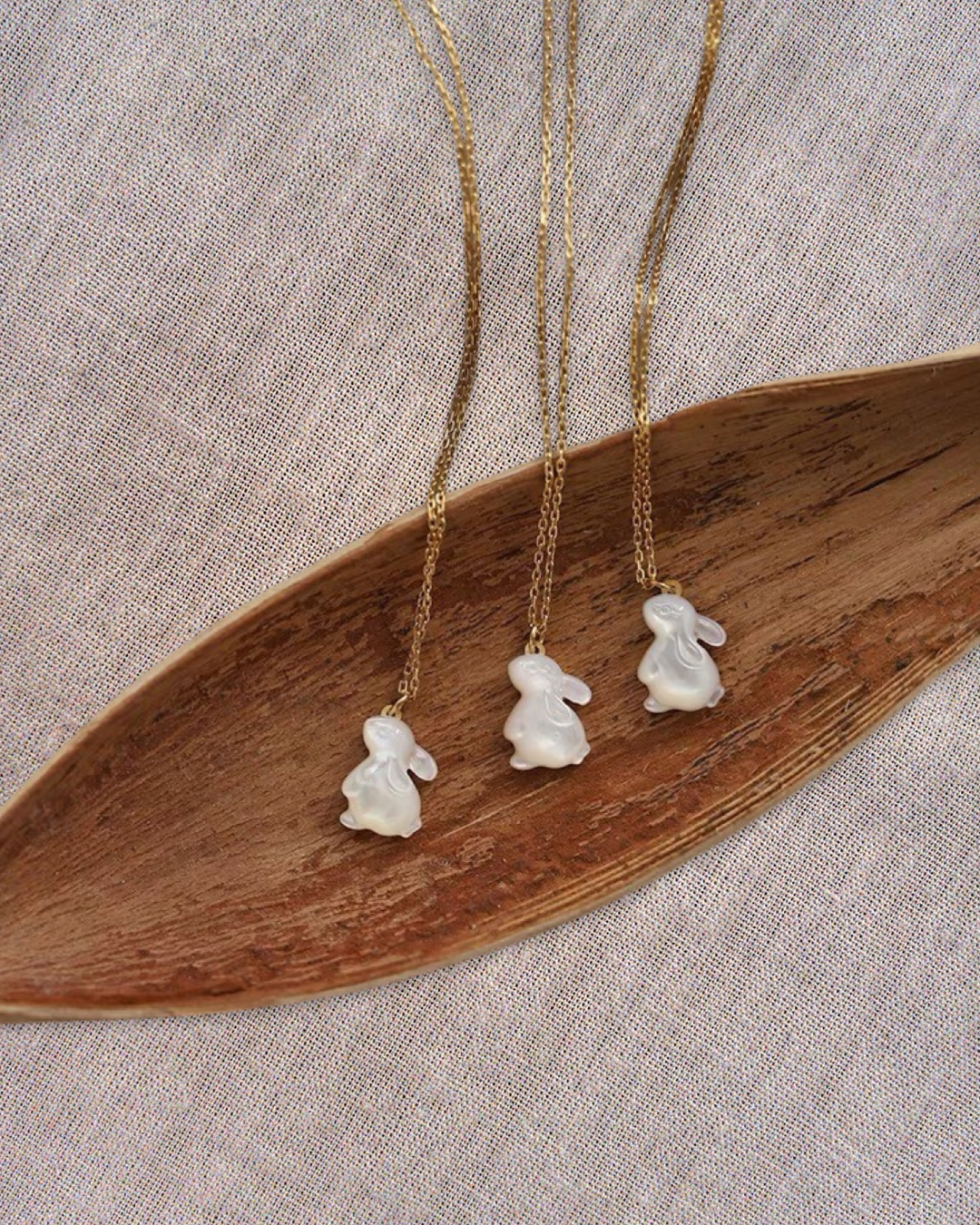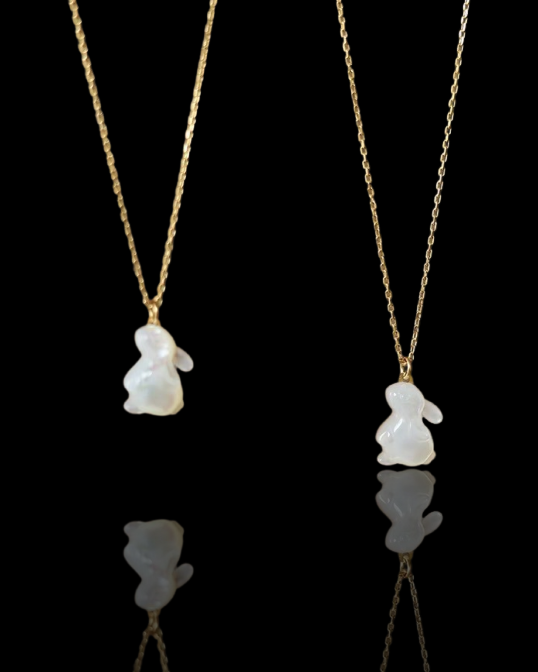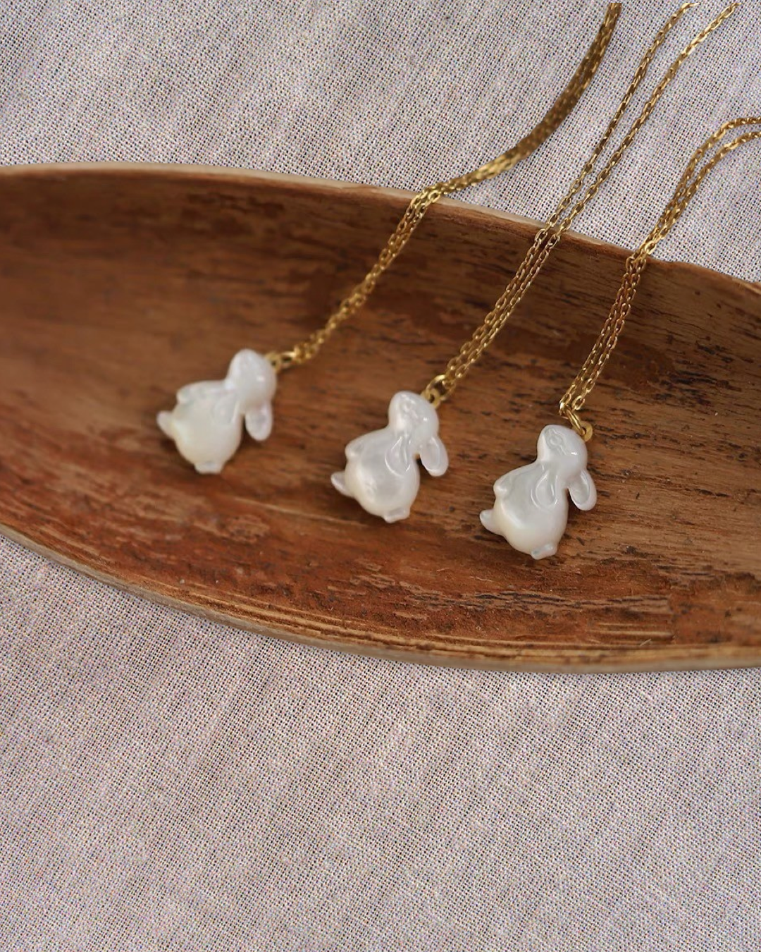 The bunny pendant is skillfully carved from natural mother of pearl, with careful manual screening to select the most beautiful pieces for production. Each pendant is unique, featuring slight variations due to the inherent minor flaws in the natural shell.