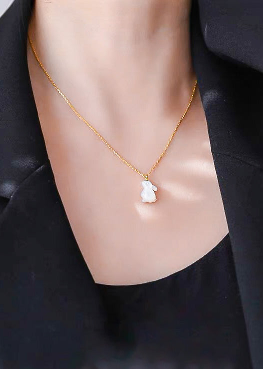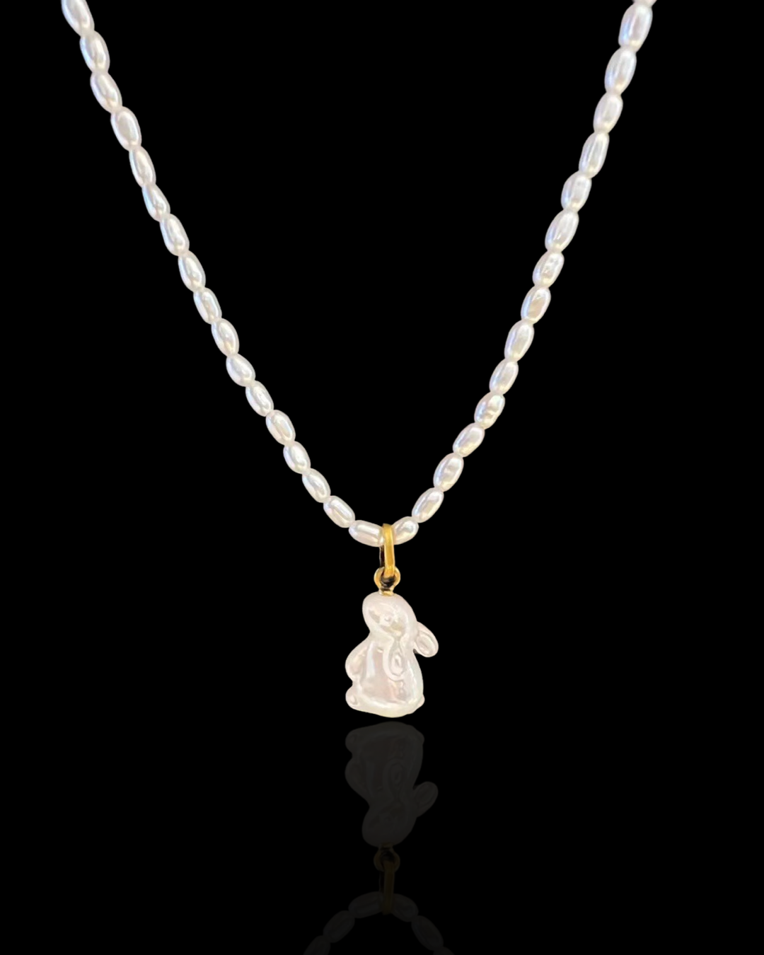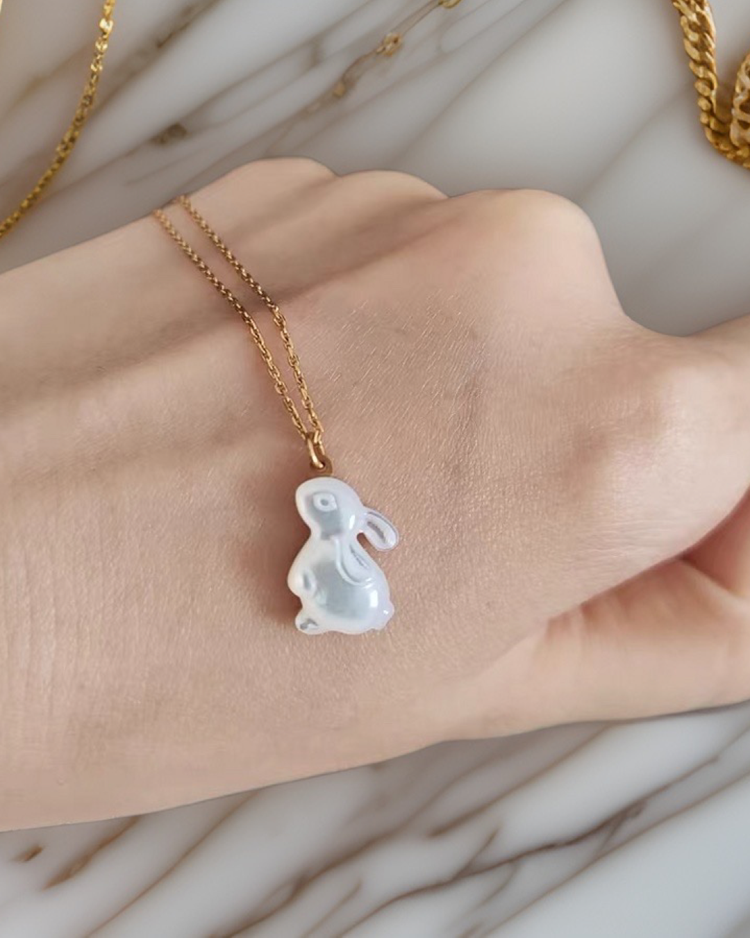 The bunny pendant is skillfully carved from natural mother of pearl, with careful manual screening to select the most beautiful pieces for production. Each pendant is unique, featuring slight variations due to the inherent minor flaws in the natural shell.