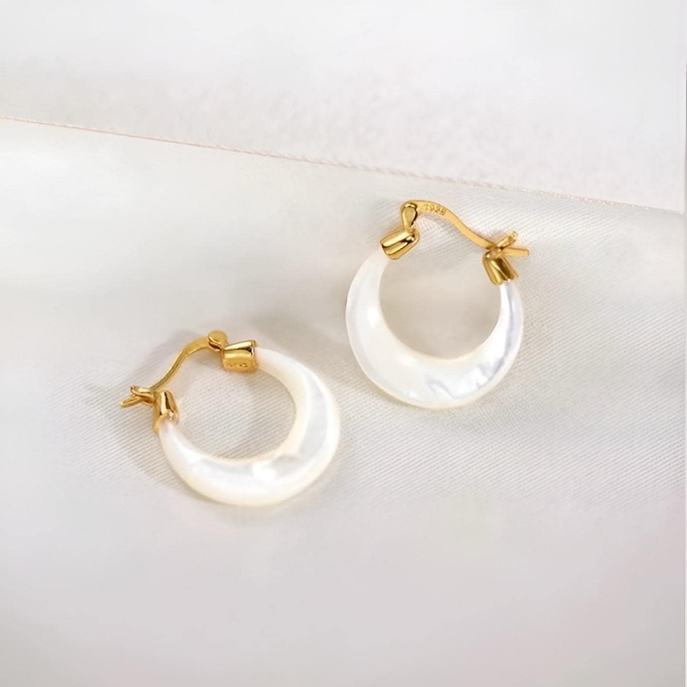 Step into the elegance of timeless French design with these exquisite 18K gold hand-carved mother of pearl earrings. Inspired by vintage aesthetics, these luminous crescent hoops are a tribute to classic craftsmanship, featuring natural, hand-carved mother of pearl that shimmers with iridescent beauty.