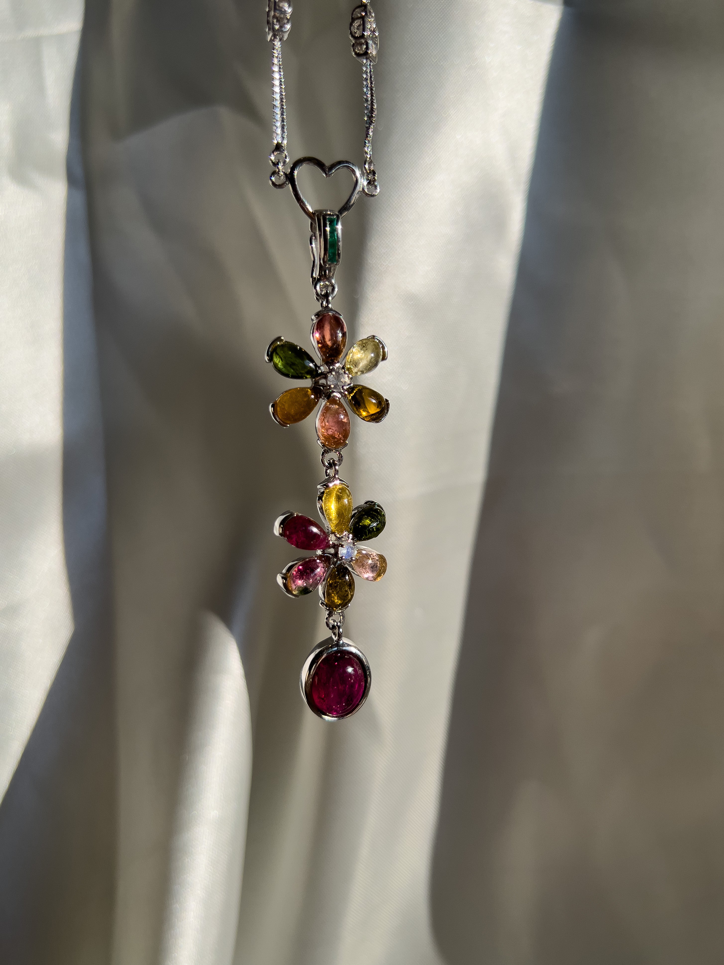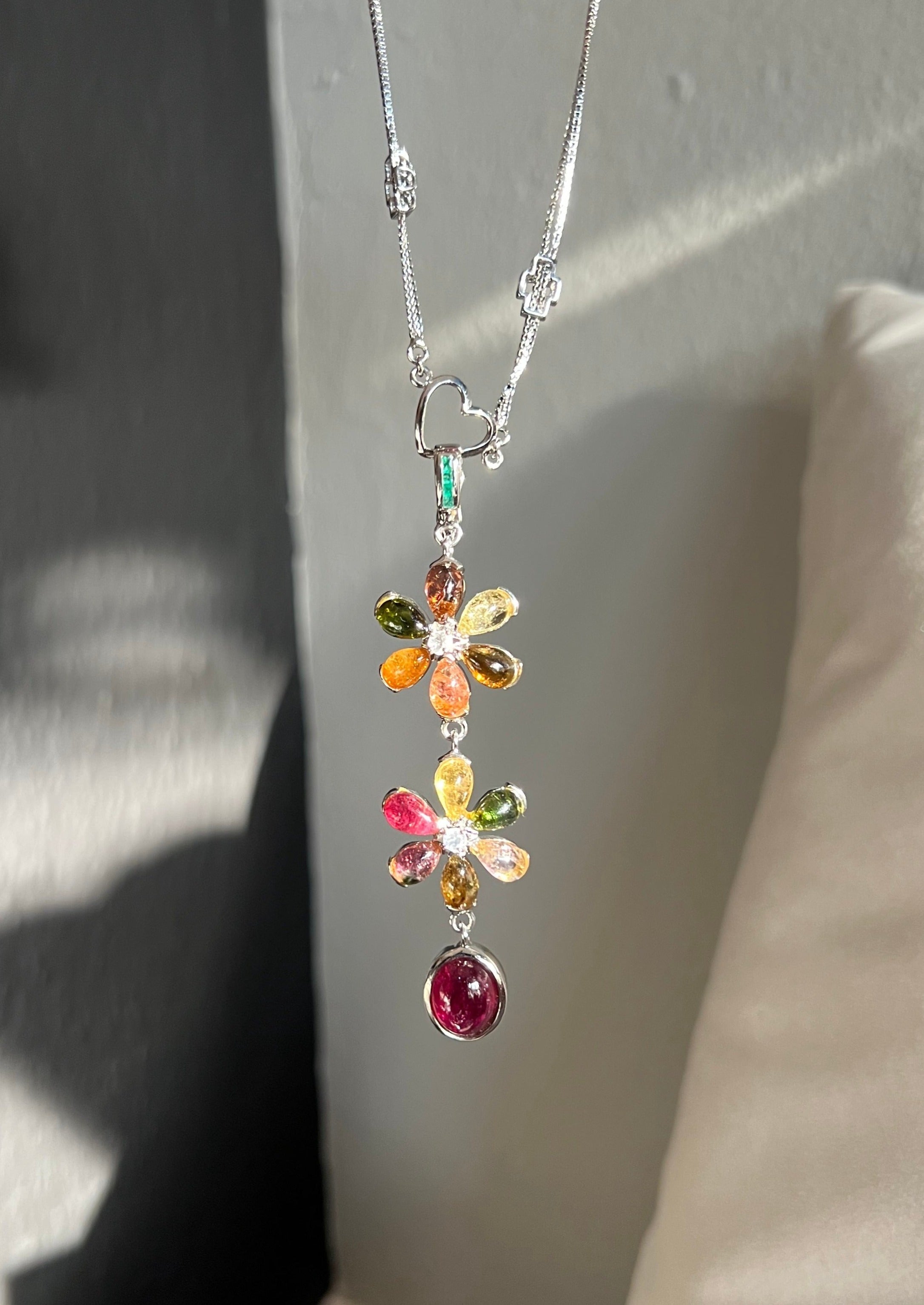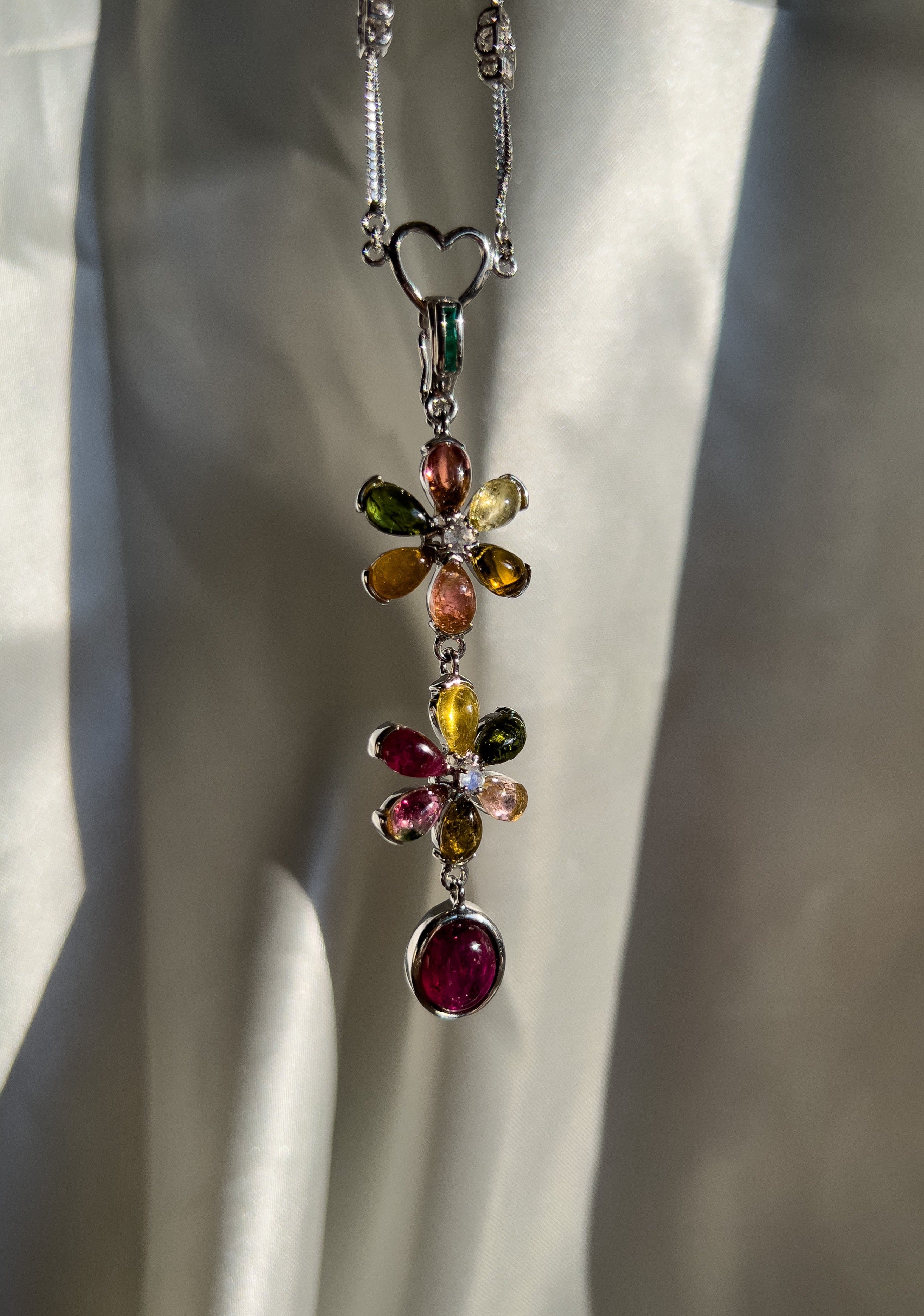Bright and colorful, this 6-petal flower rosettes design carries a symbolic meaning of protection across Britain and Europe. It features 12 multi-color pear-shaped tourmaline cabochons, one cabochon rubellite tourmaline, and calibrated green tourmalines on the hinged connector, totaling 15 ct. The hinged connector design allows for easy styling with different chains.