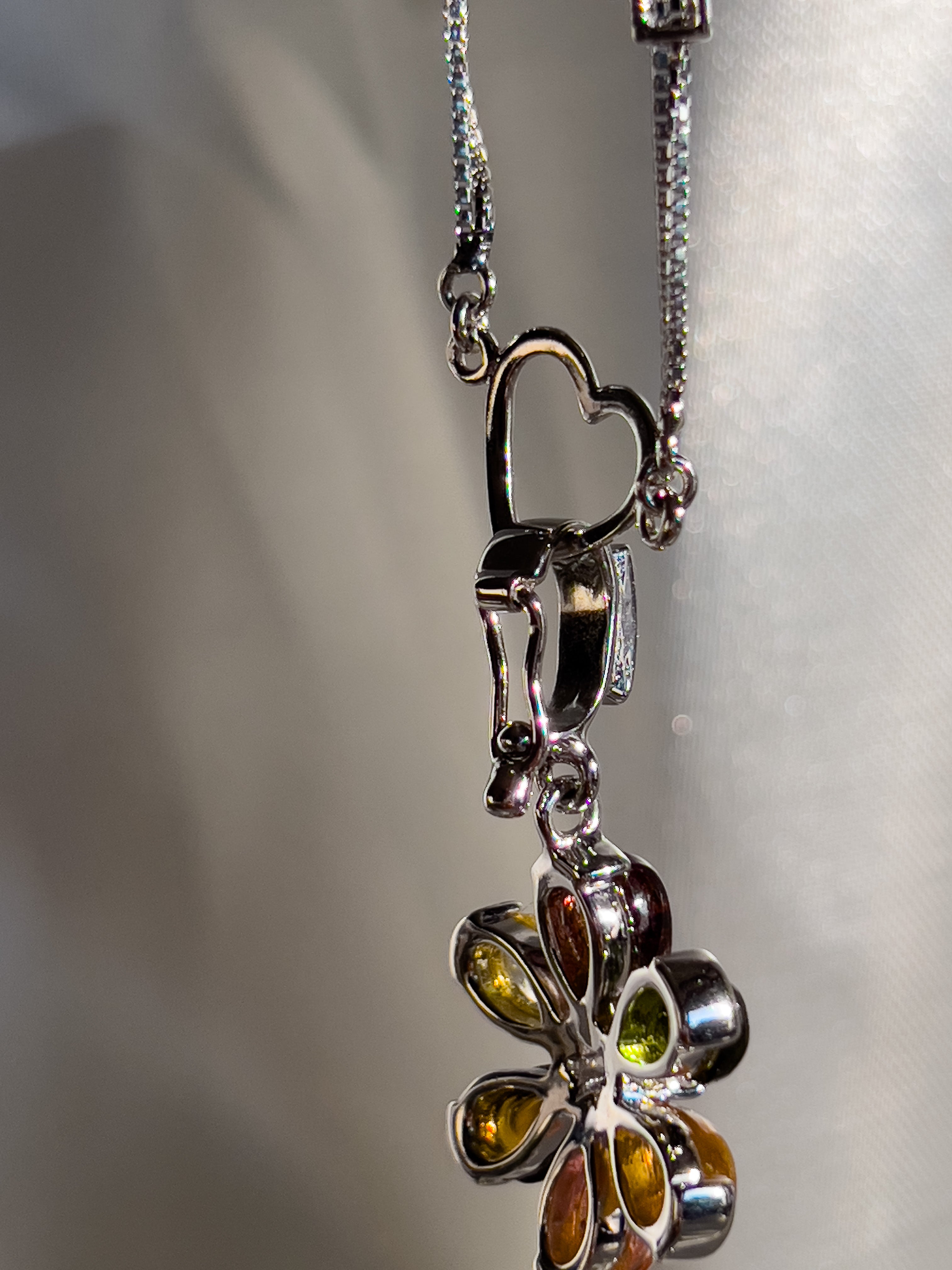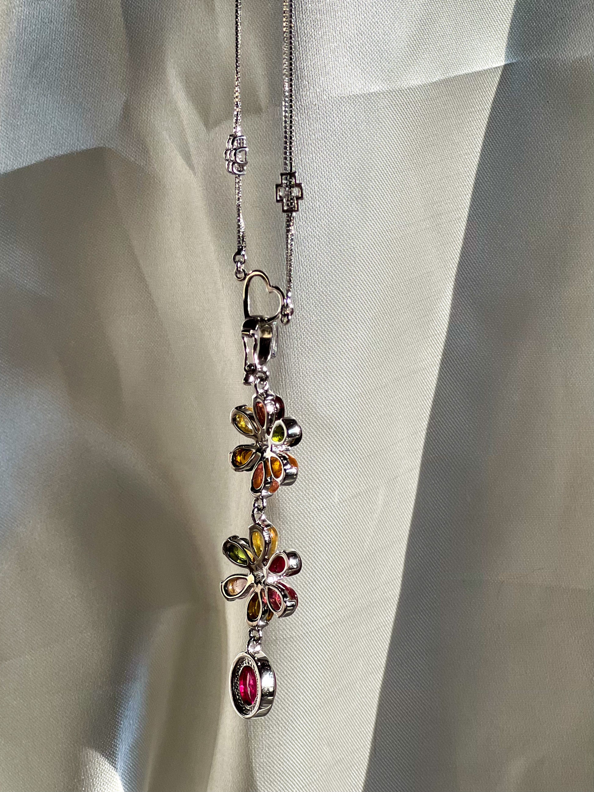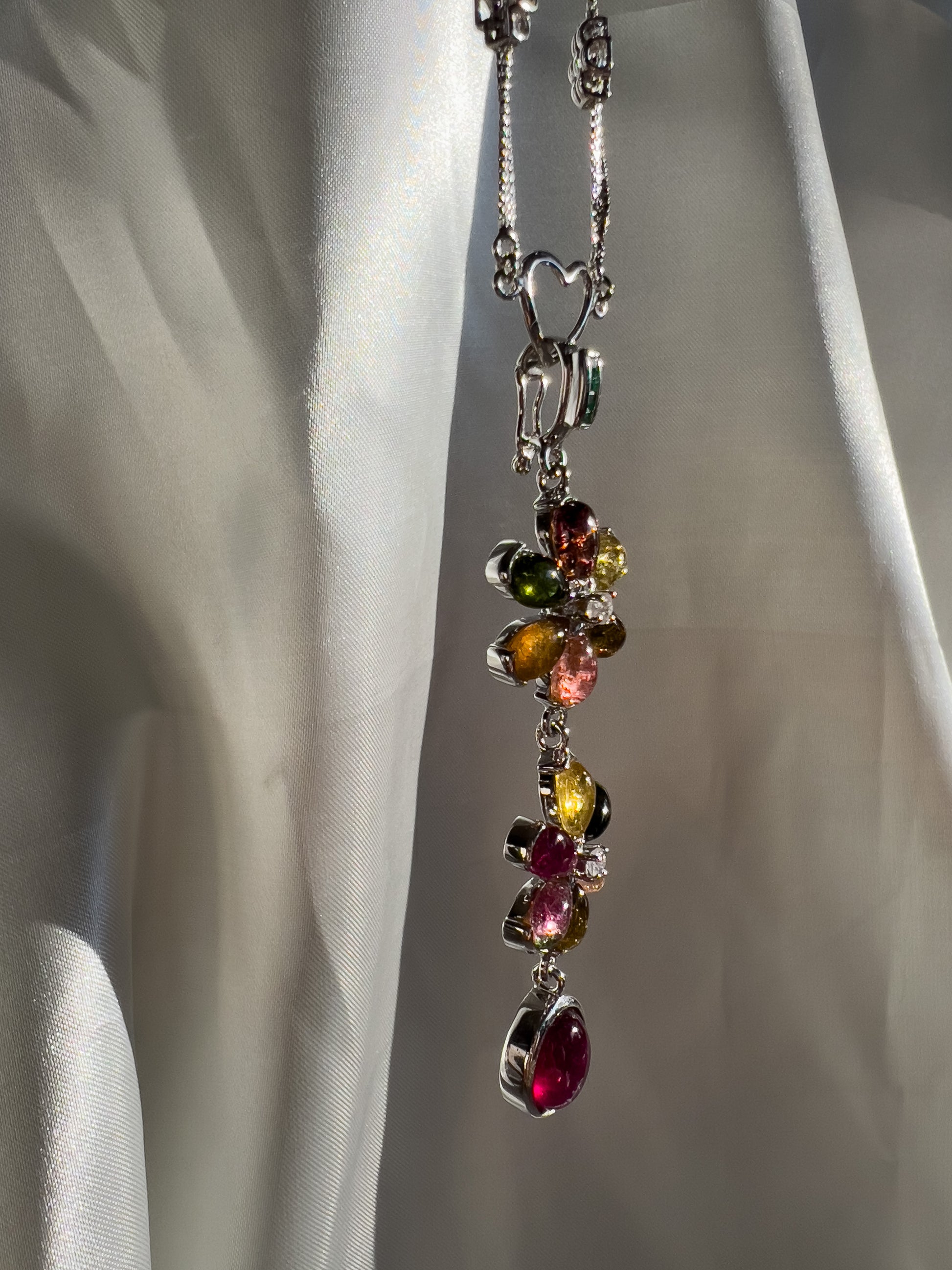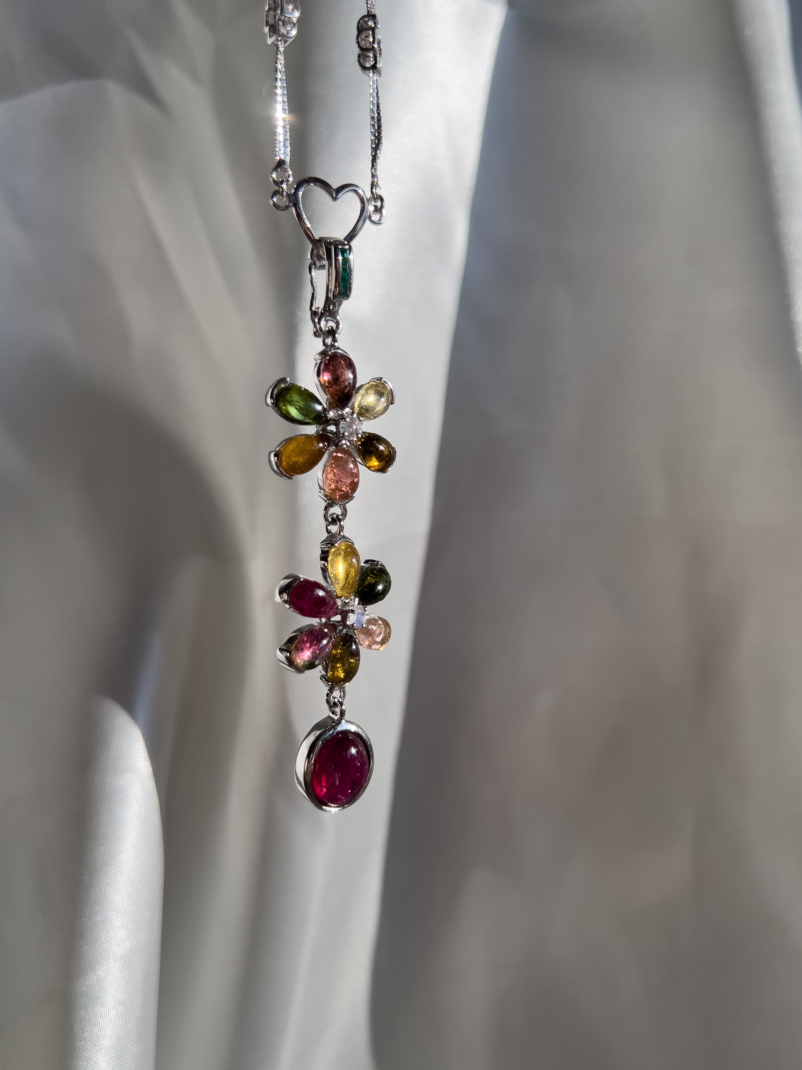 Bright and colorful, this 6-petal flower rosettes design carries a symbolic meaning of protection across Britain and Europe. It features 12 multi-color pear-shaped tourmaline cabochons, one cabochon rubellite tourmaline, and calibrated green tourmalines on the hinged connector, totaling 15 ct. The hinged connector design allows for easy styling with different chains.