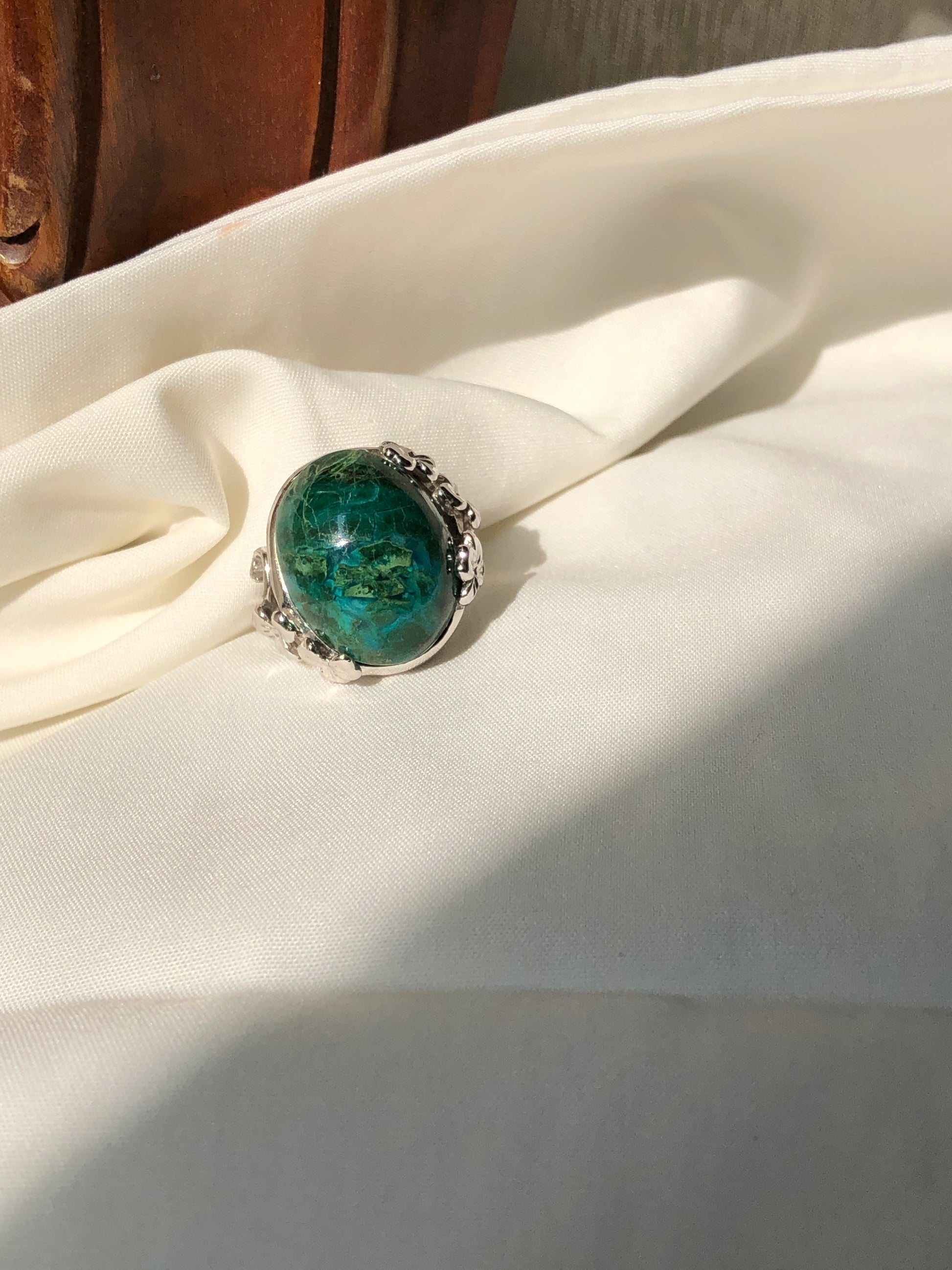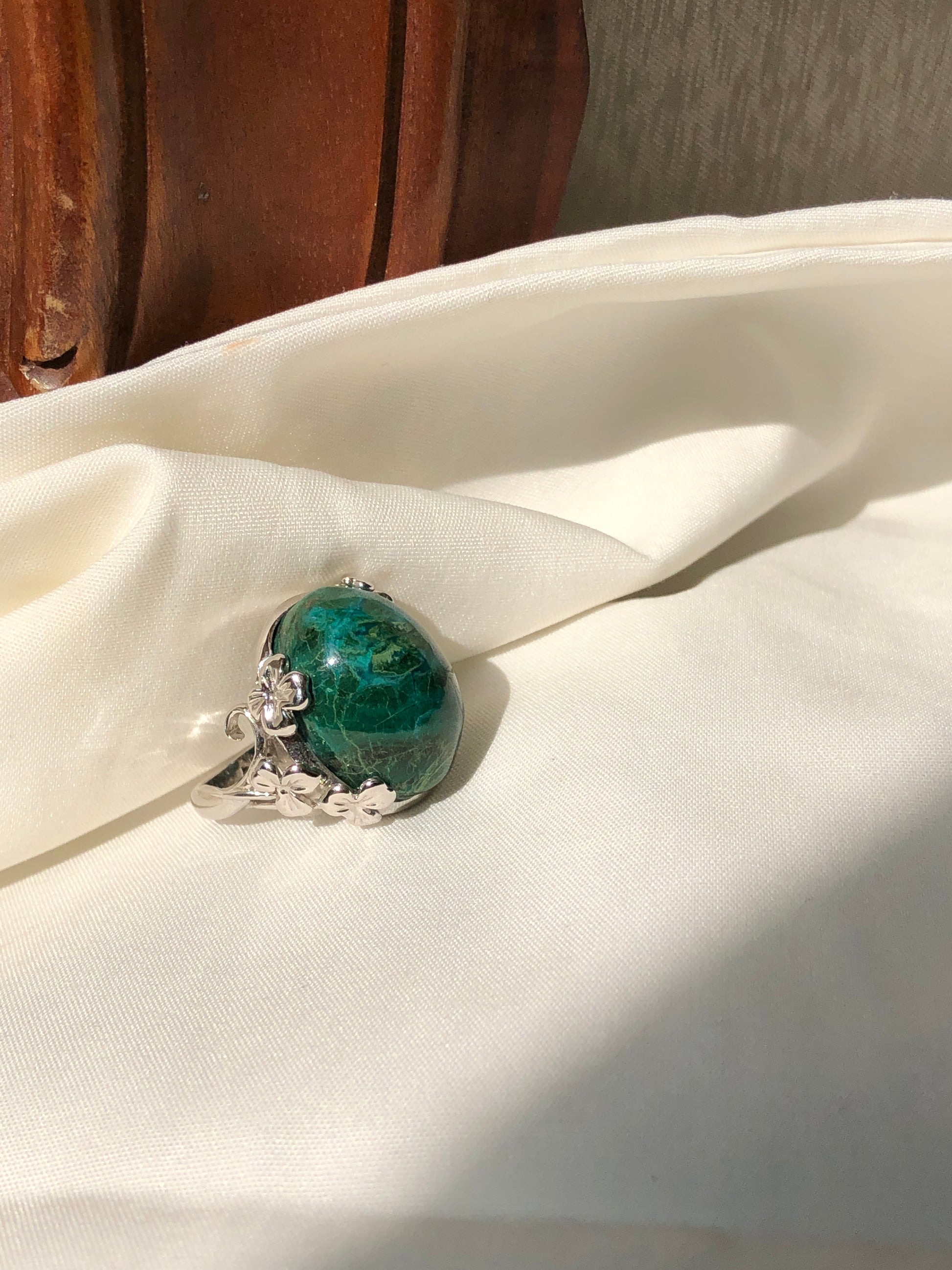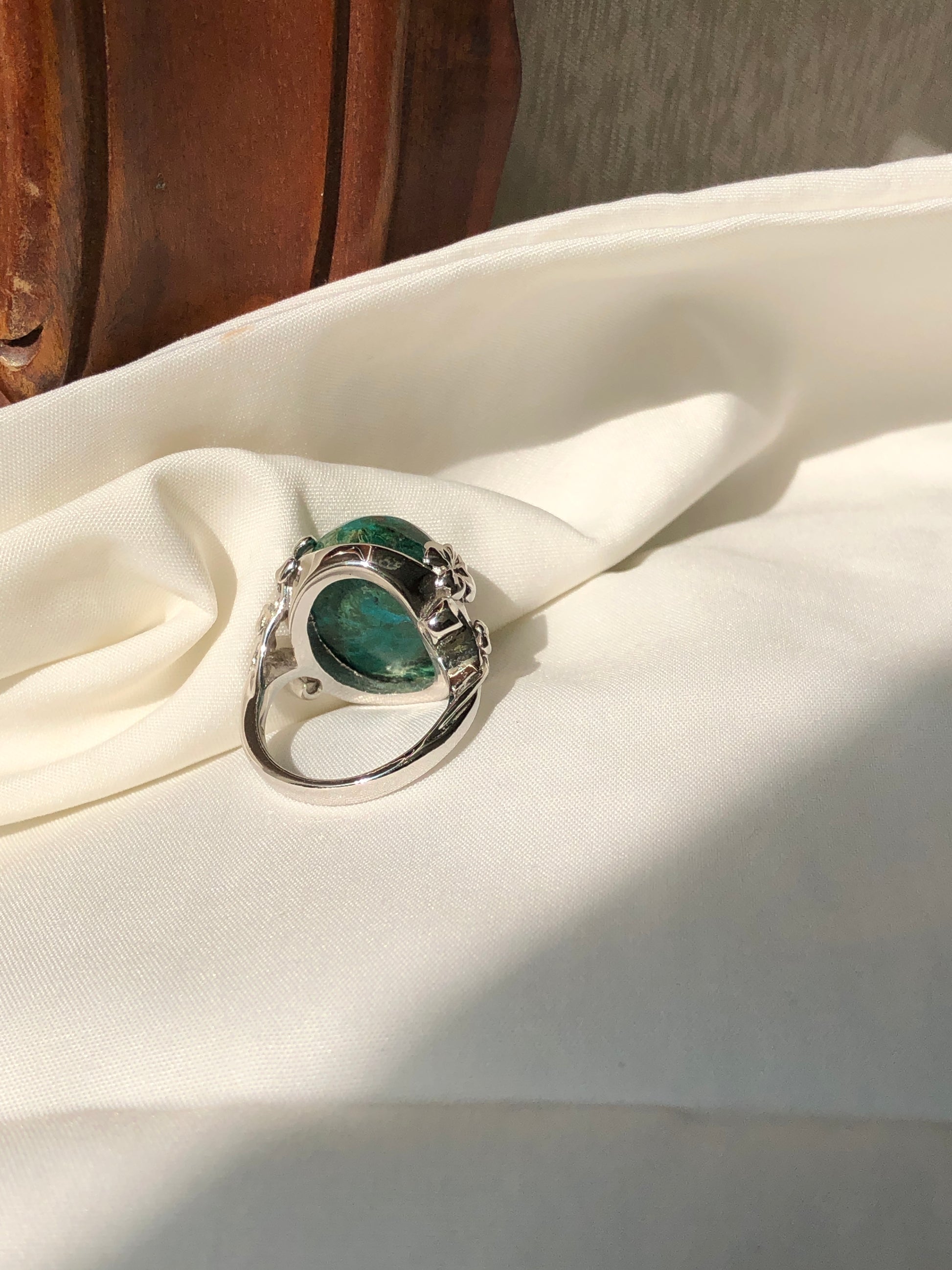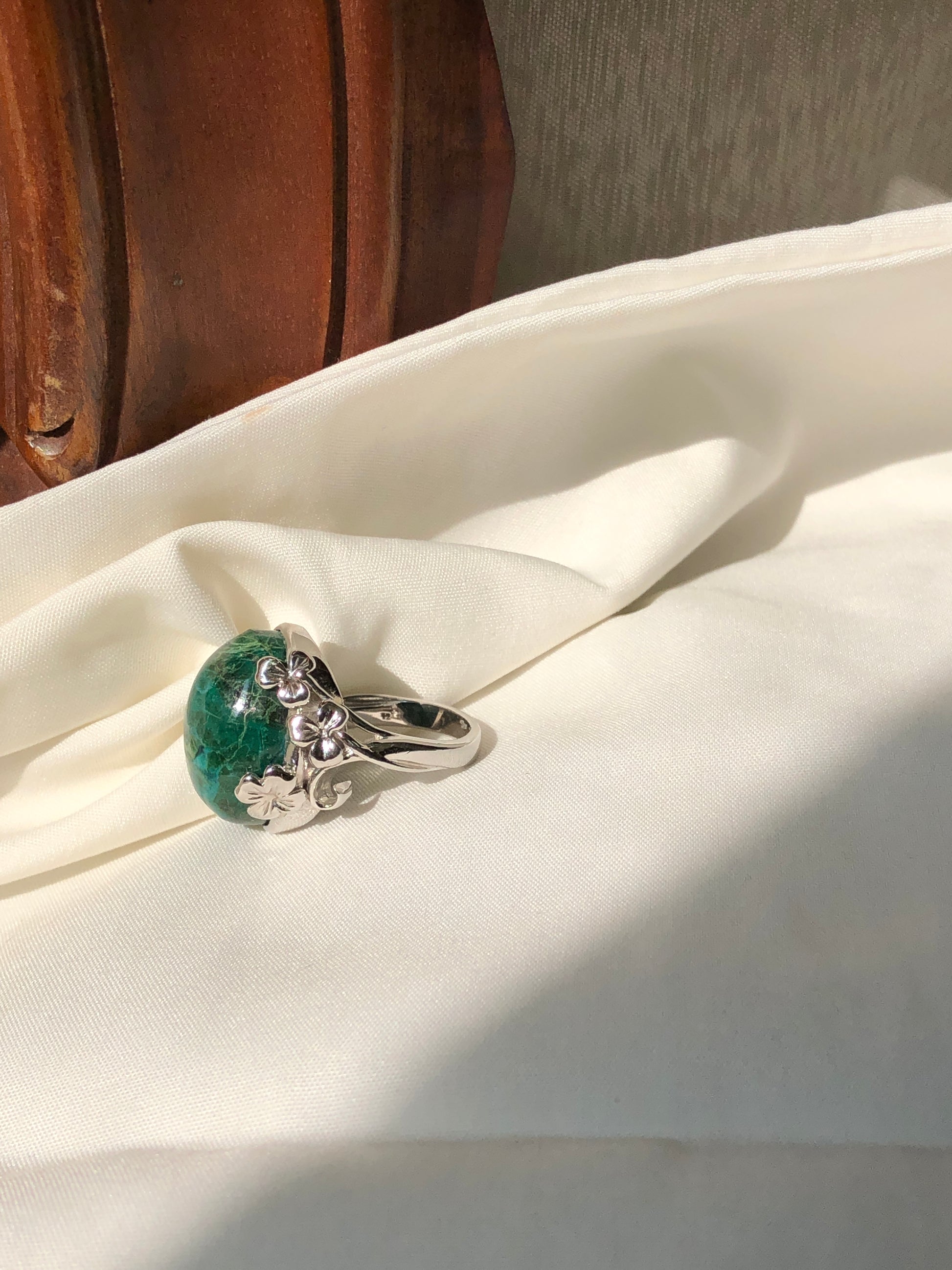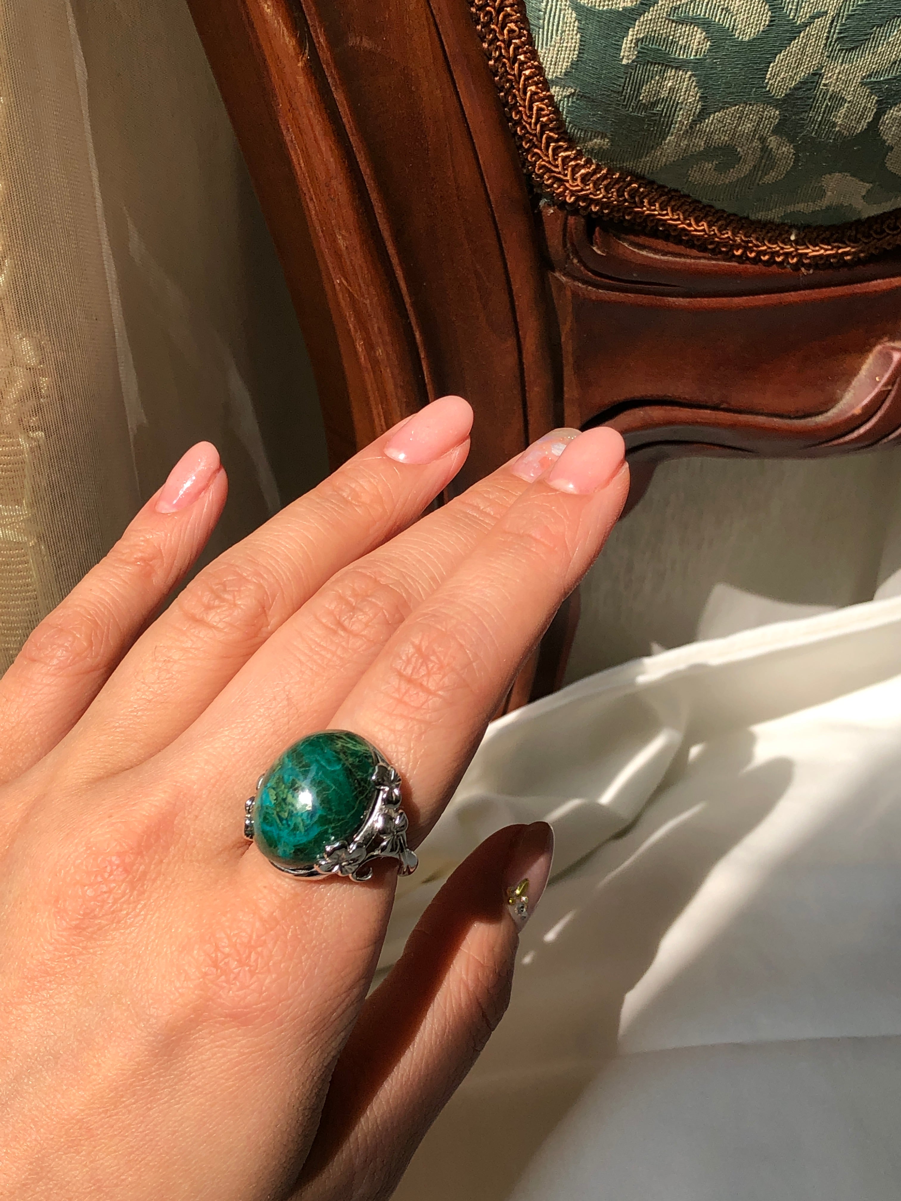 This elegant cabochon ring features a natural Forest Chalcedony, untouched by any treatments. This rare blue chalcedony variant, found only on the East Coast of Taiwan, is locally known as "blue sapphire."