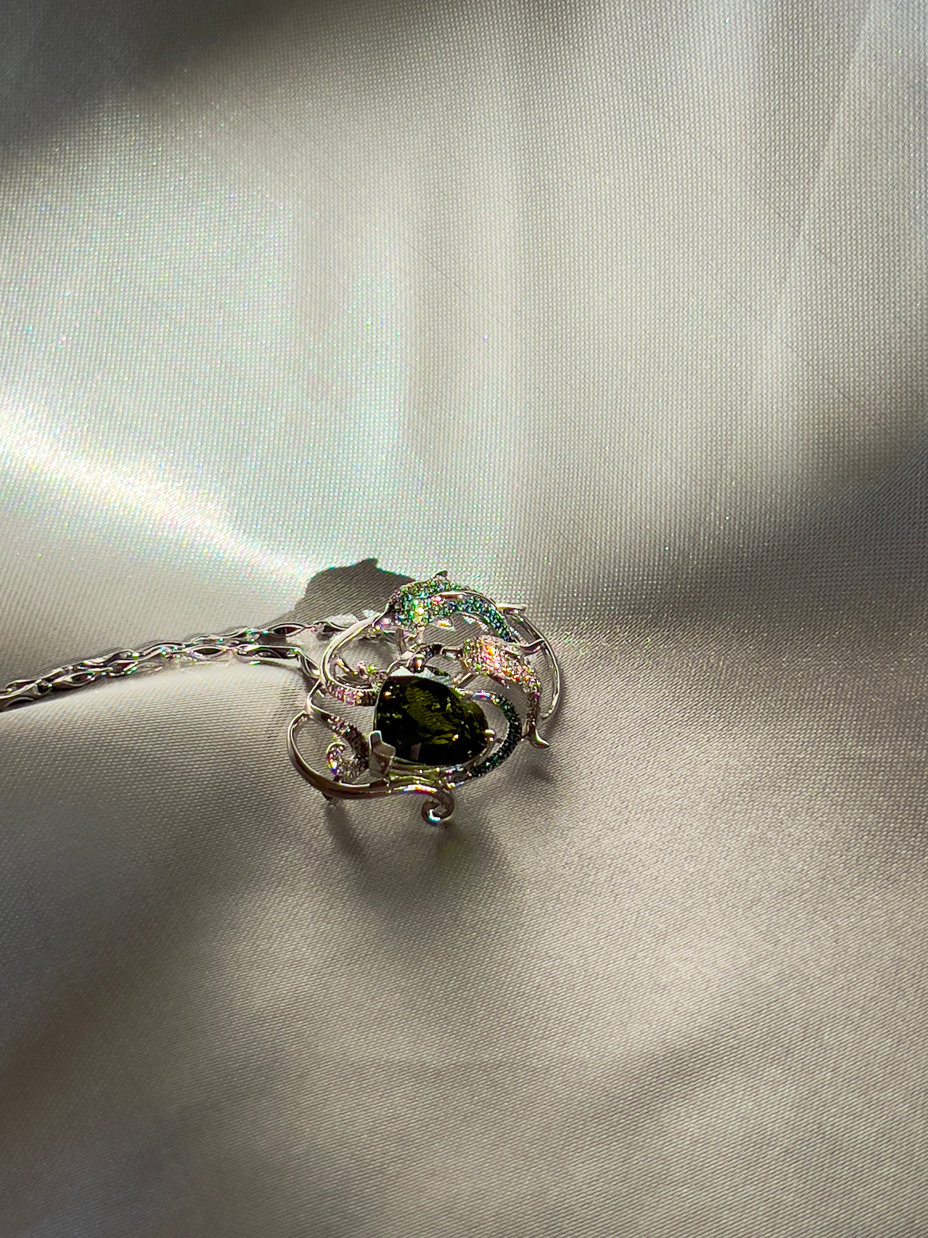 Natural 7.5Ct Green Tourmaline with Tsavorite and Diamond Dolphins Pendant Brooch in 18K White Gold