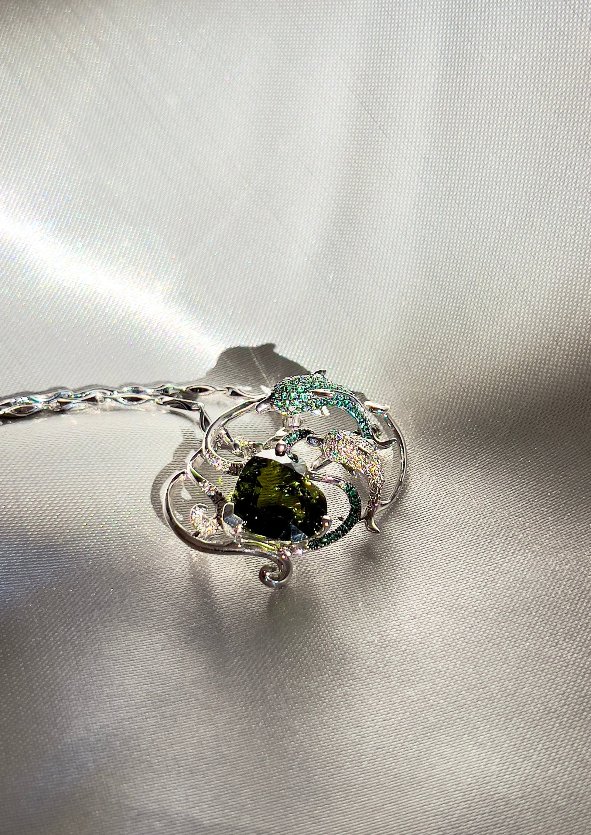 Beautiful and nearly flawless, this rare 7.5 ct heart-shaped natural chrome tourmaline is surrounded by two dolphins—one adorned with tsavorites and the other with diamonds. They are framed by flowing waves of diamonds and tsavorites. In some cultures, the double fish symbolizes a balanced union between a couple. Perfect for collectors, this piece can be worn as a brooch or a pendant necklace.