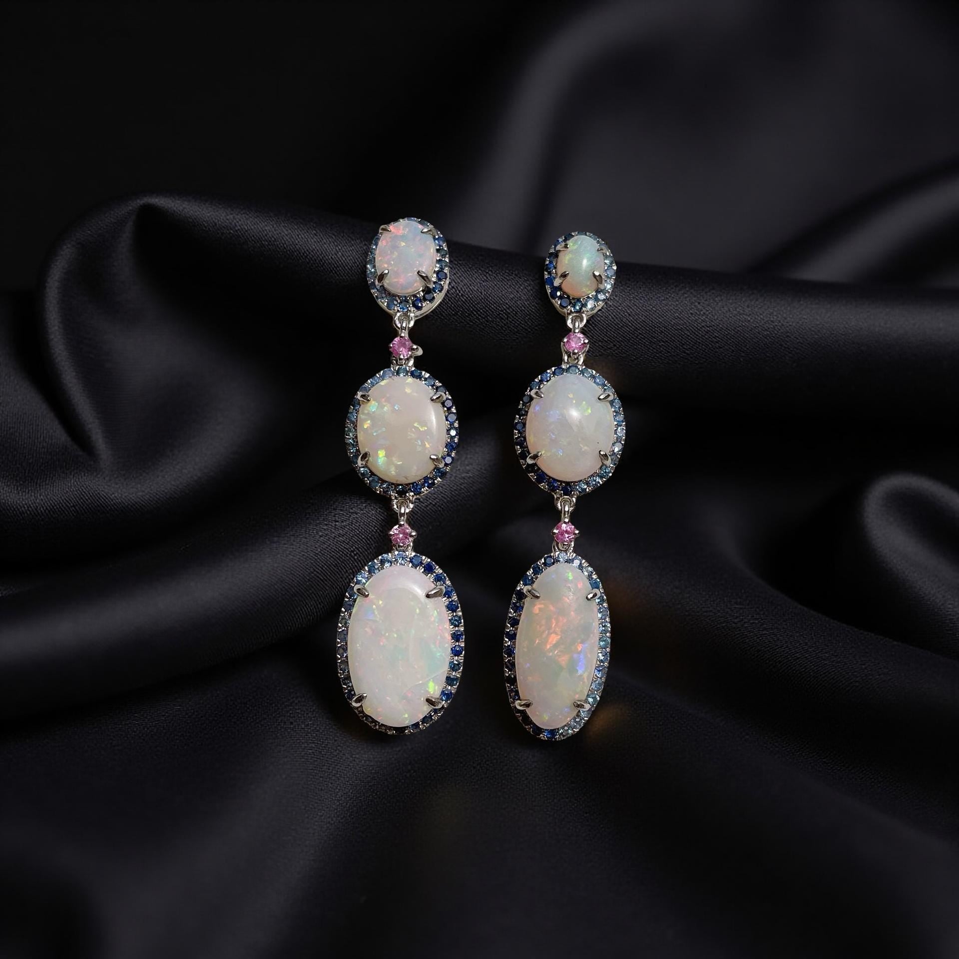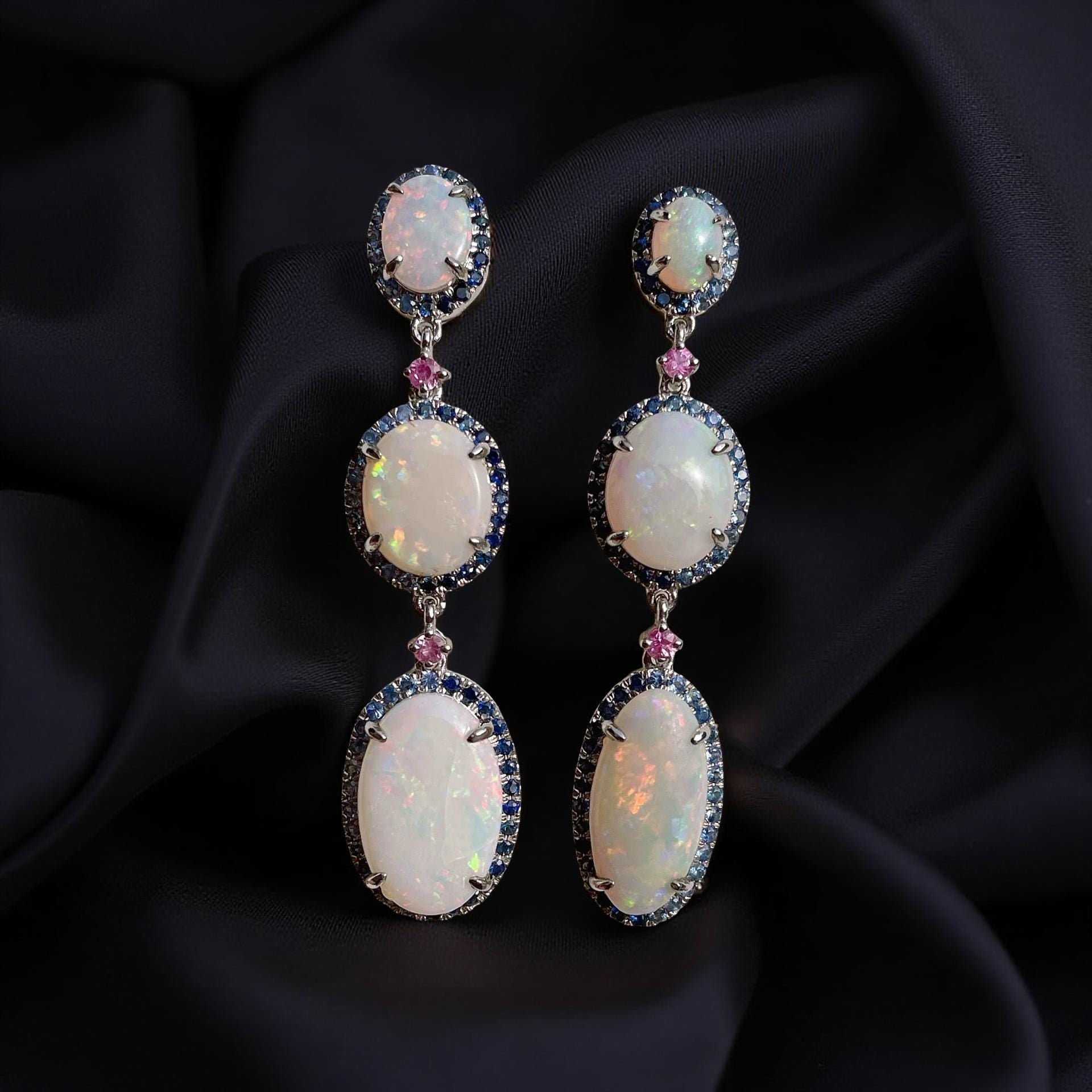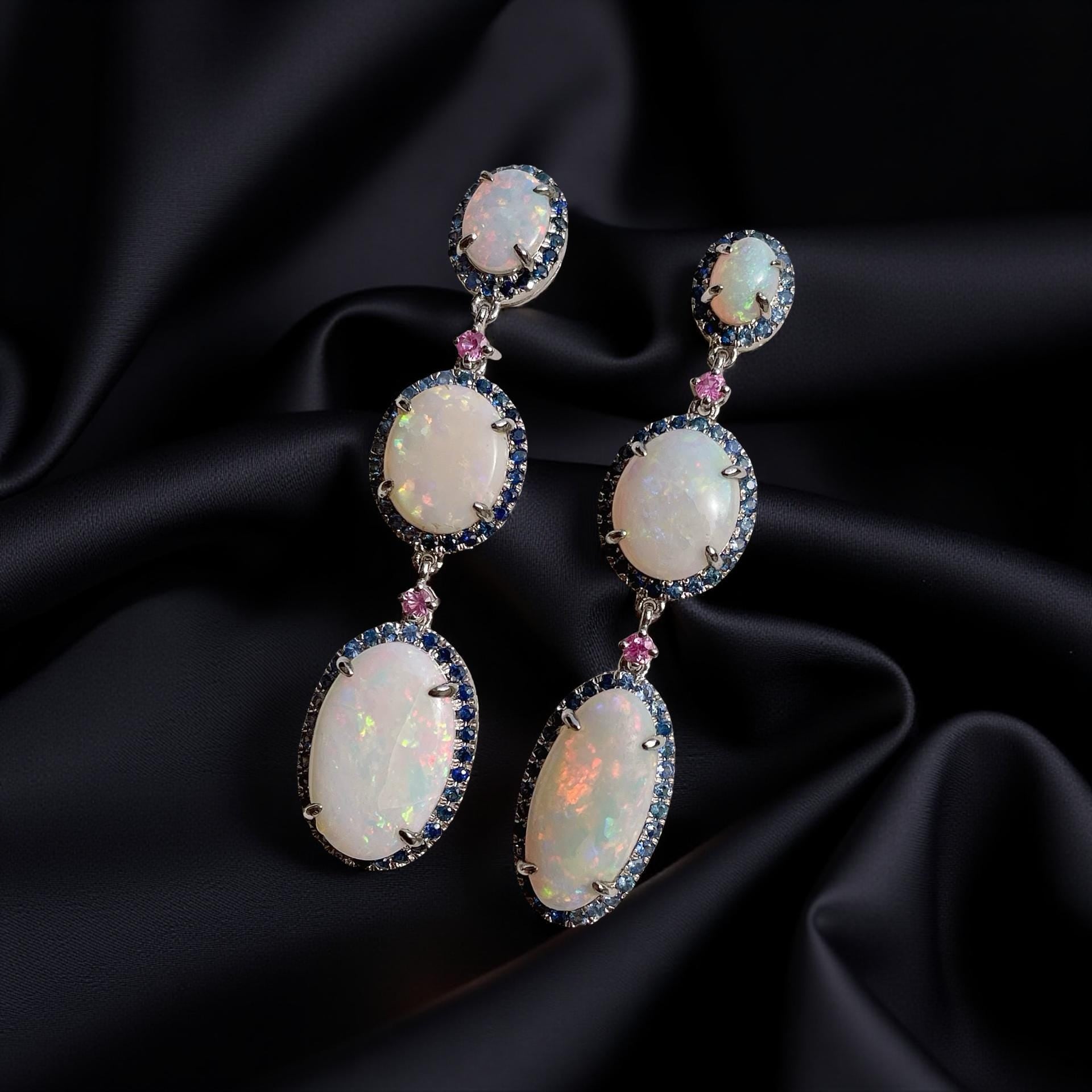 These breathtaking earrings feature Australian white opals, hand-selected for their exceptional fire and luminous play-of-color. Each earring holds three opals, delicately set in halos of shimmering blue sapphires and accented with petite pink sapphires for a soft romantic touch.