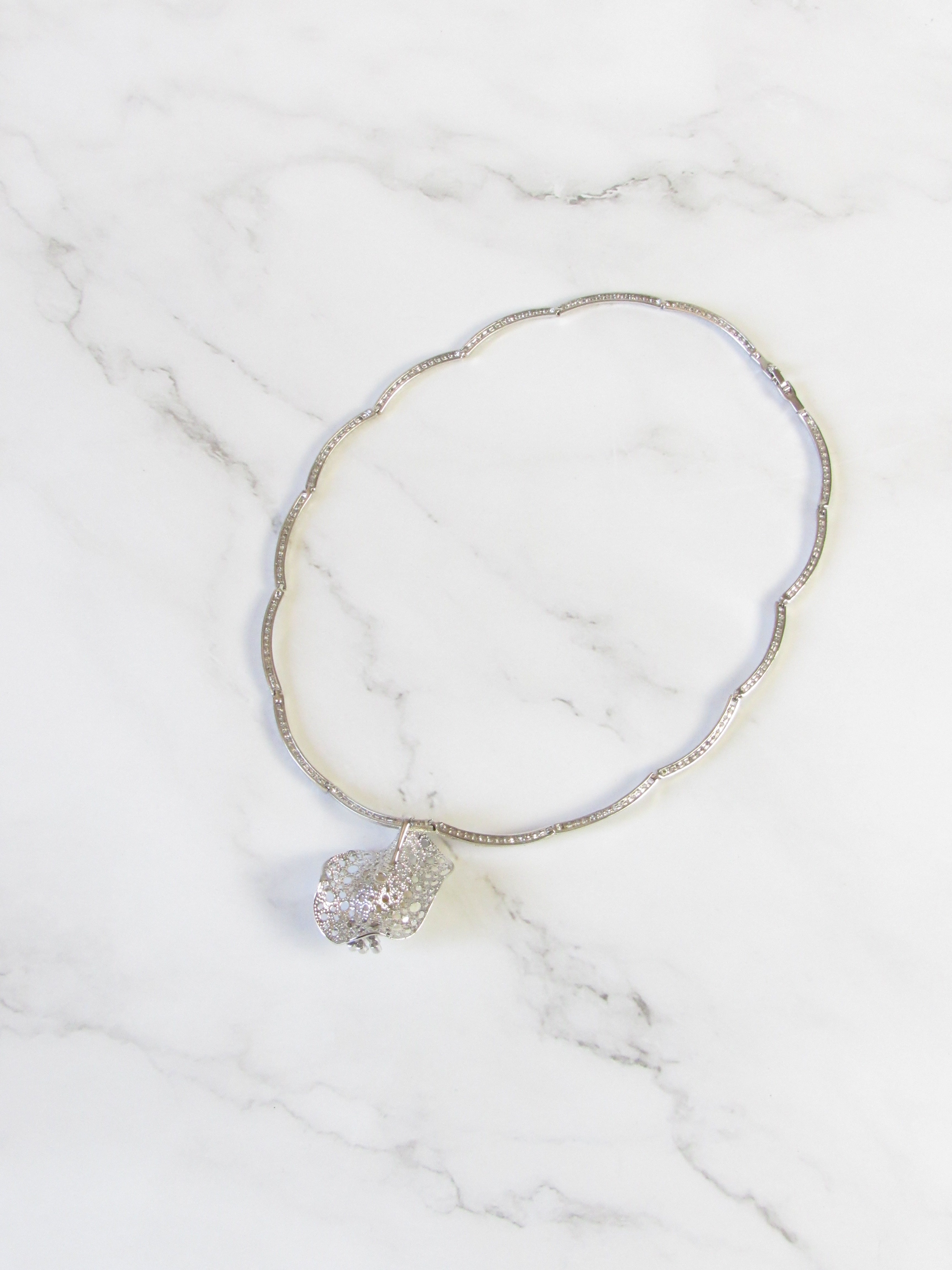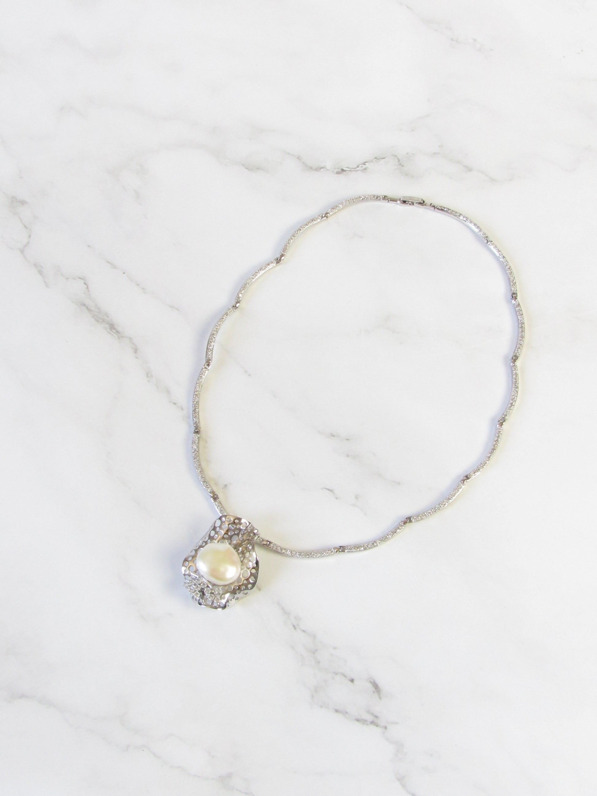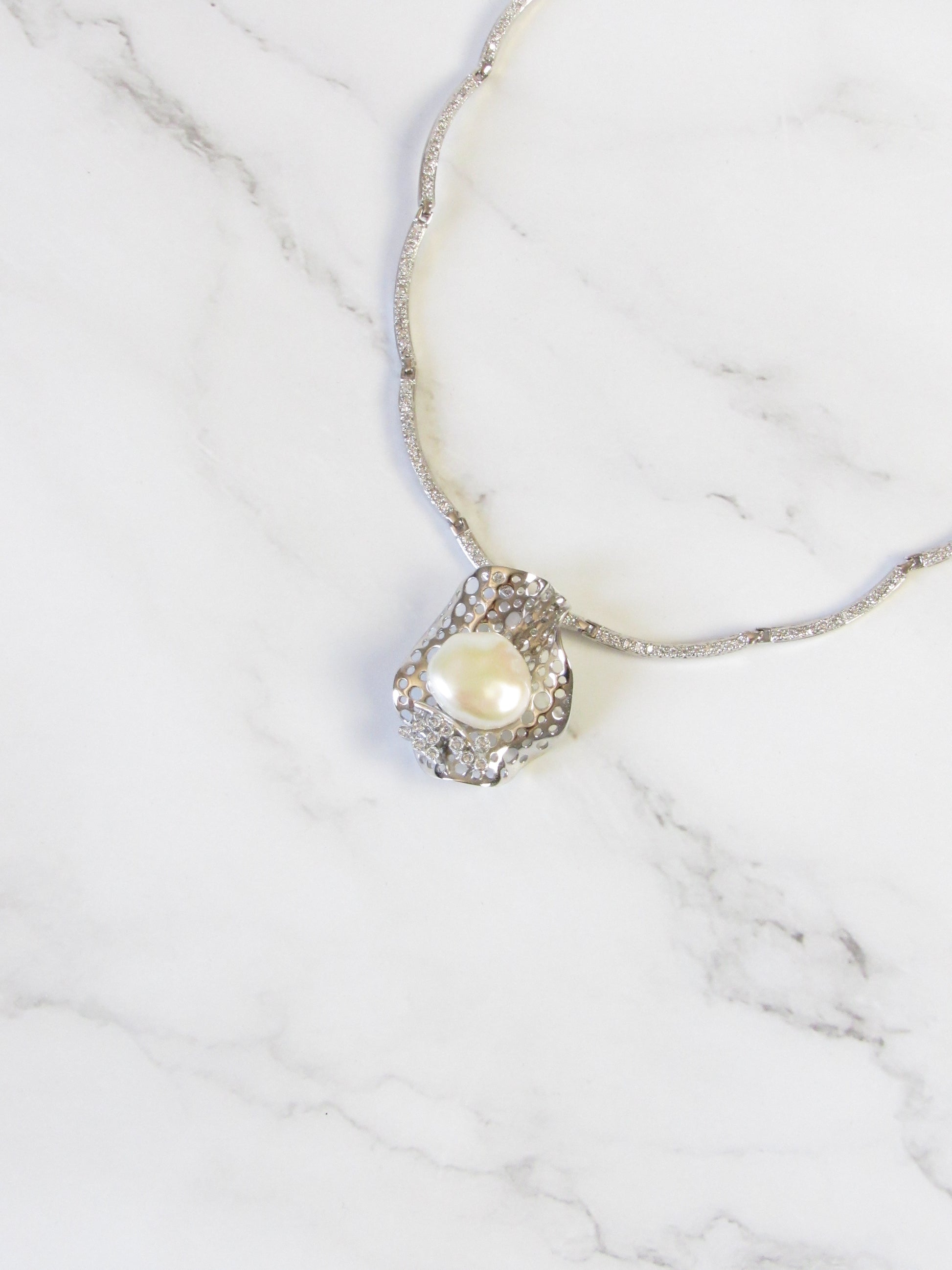 This unusual and delightful pendant features a very lustrous natural baroque pearl set on an 18k white gold organic shape inspired by sea foam, accented with 0.38ct diamonds resembling sea grass. Crafted in the 90s in Taipei, Taiwan, this piece was produced in collaboration with a local Taiwanese metalsmith using gems we meticulously sourced. The pendant also includes an elegant sparkling chain for added style.