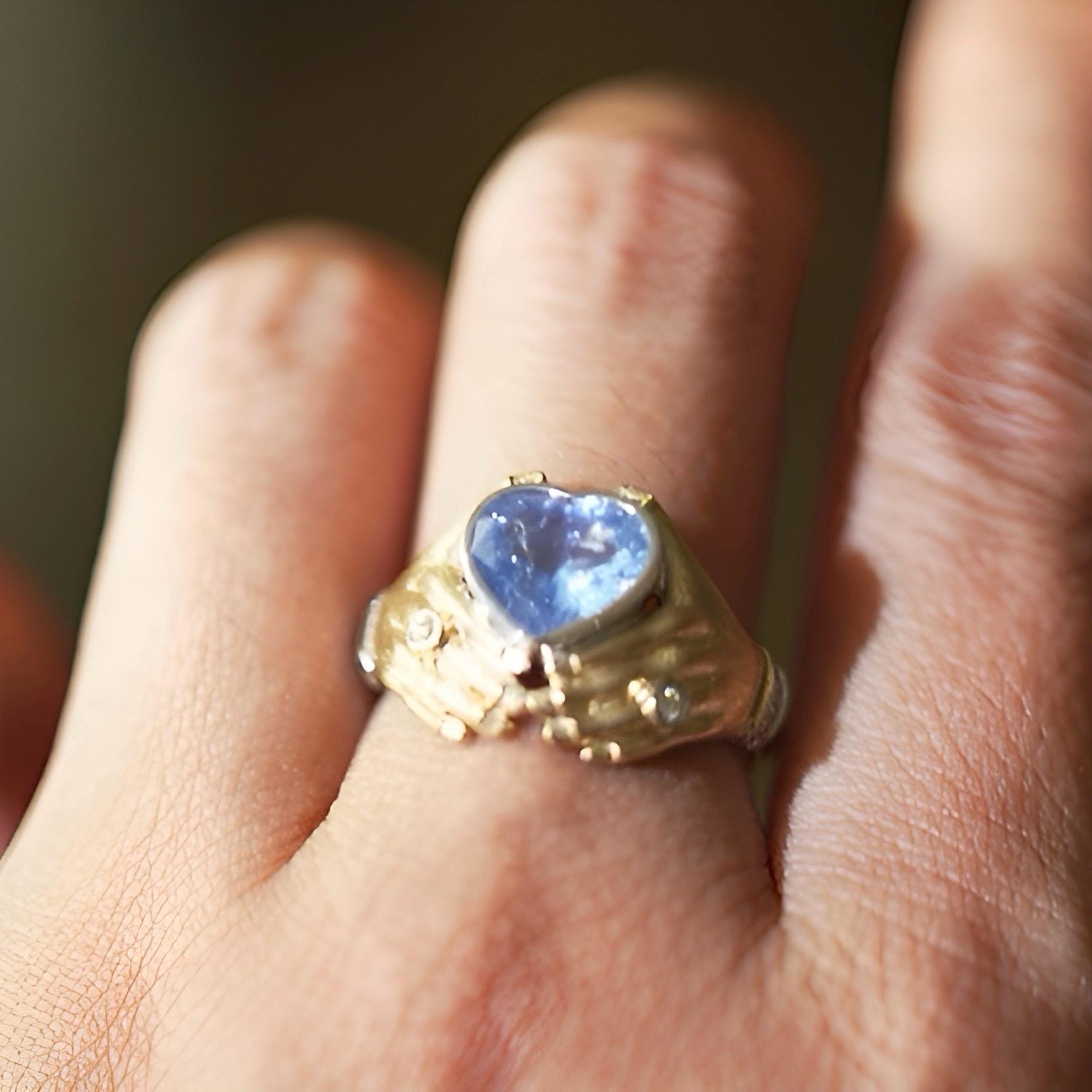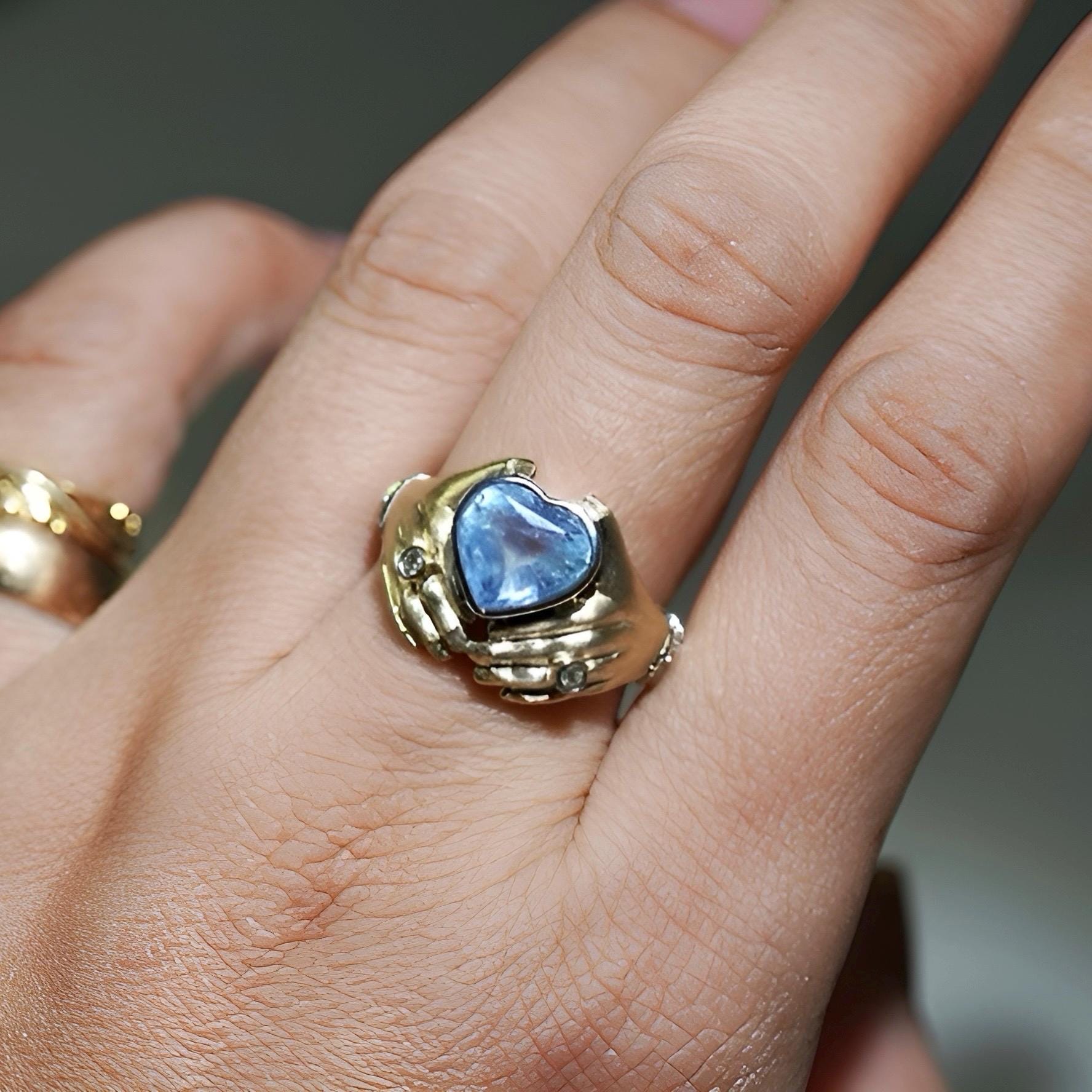This exquisite 14k gold sapphire heart ring reimagines the timeless Claddagh tradition, symbolizing love, loyalty, and friendship. A heart-shaped natural sapphire is embraced by delicately crafted hands and crowned with diamonds, evoking the meaningful sentiment: