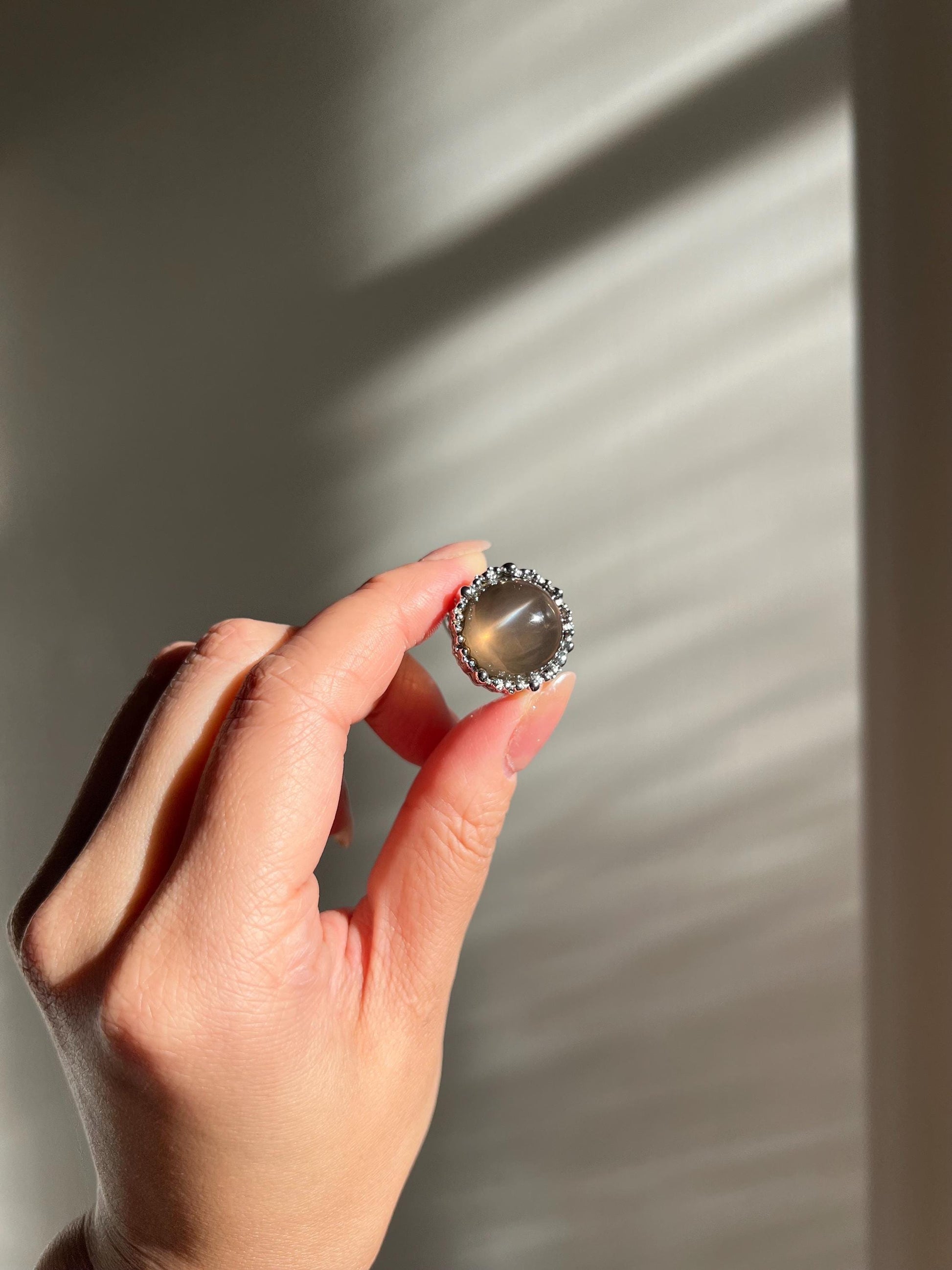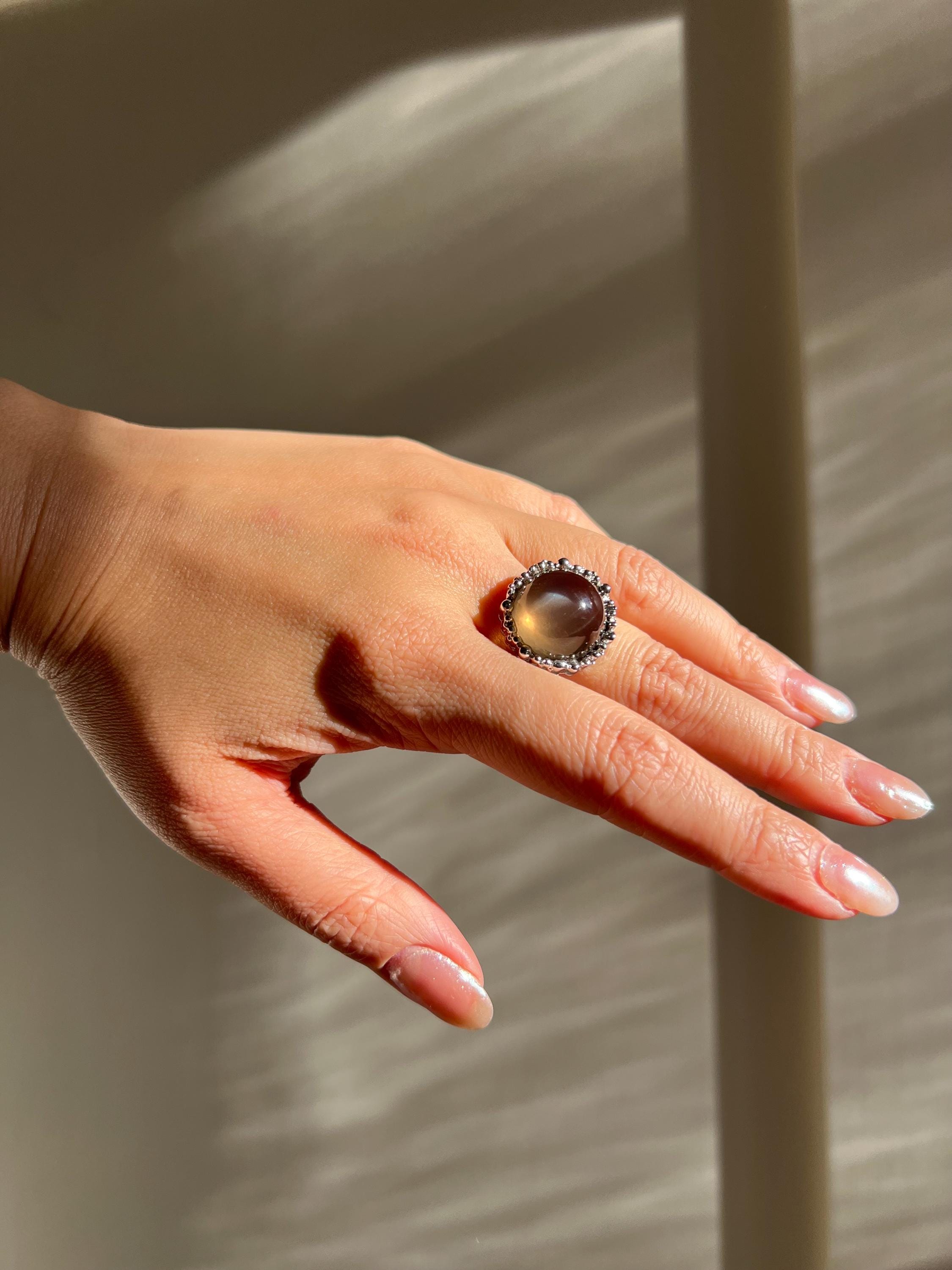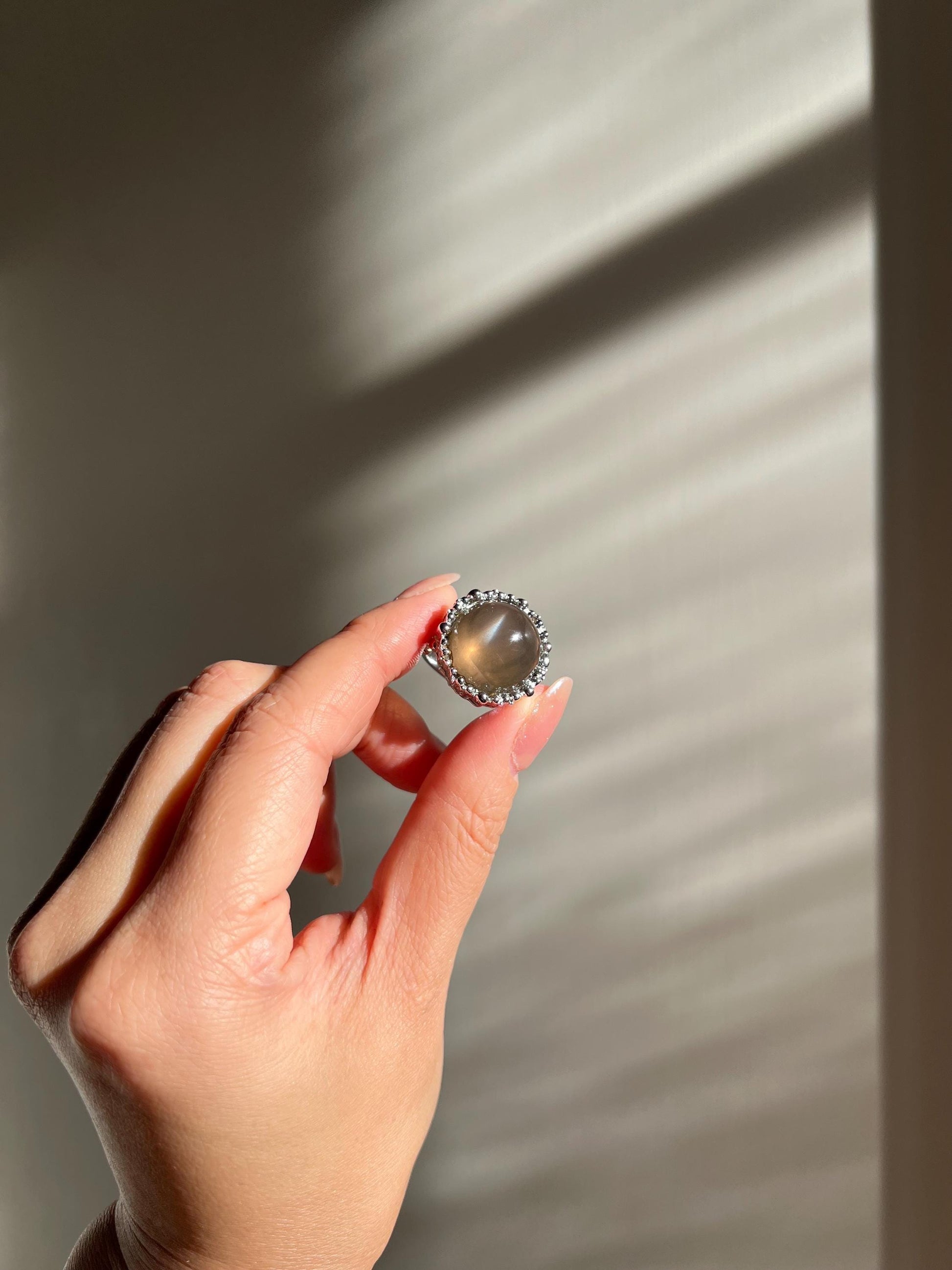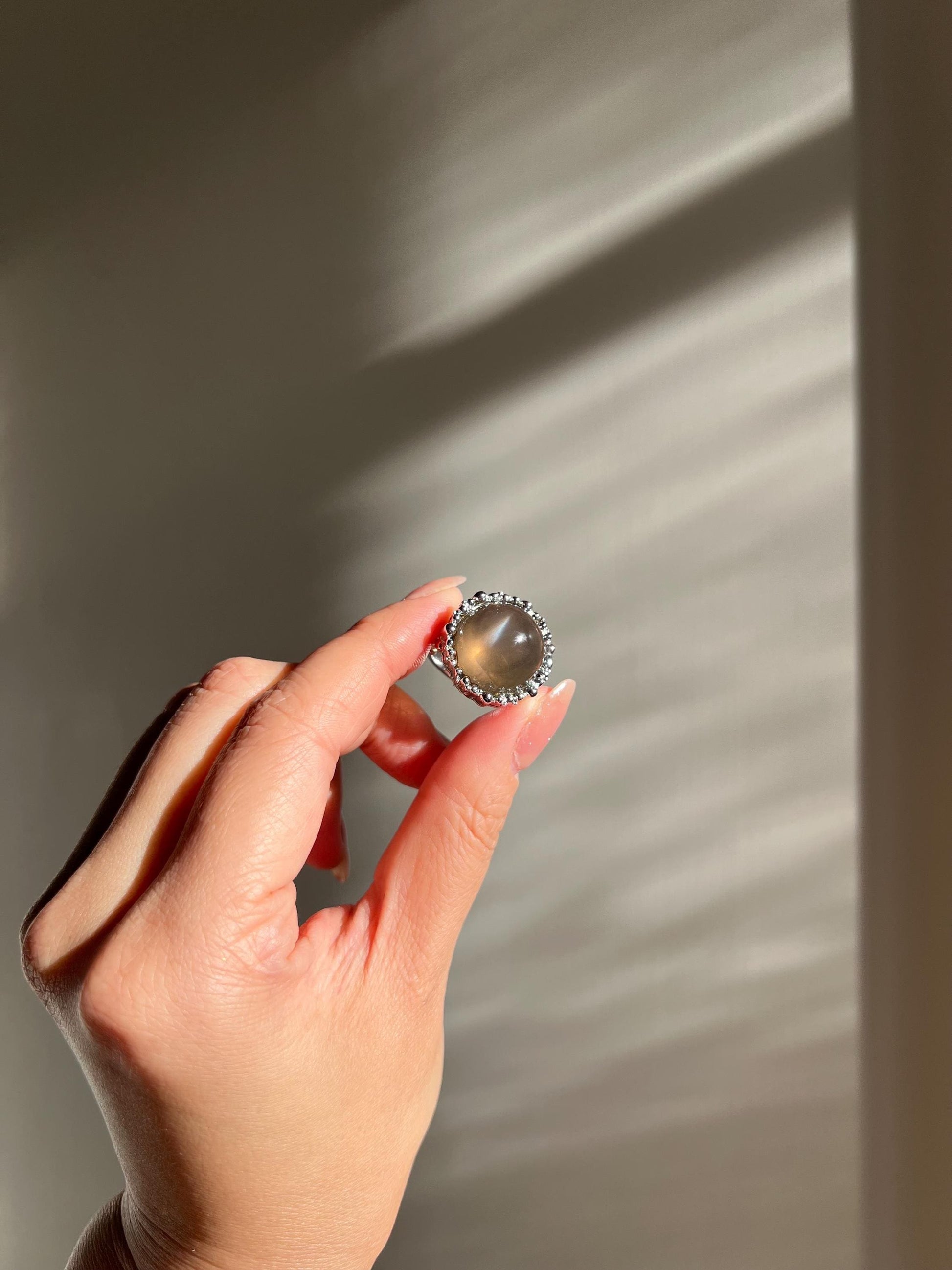 Handcrafted in sterling silver, the luminous cabochon catches sunlight with a fine silver band, symbolizing intuition, mystery, and inner balance.