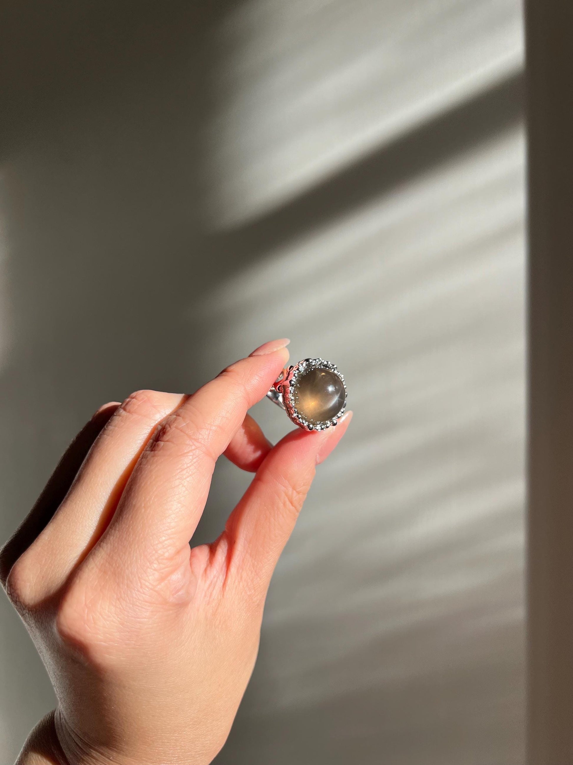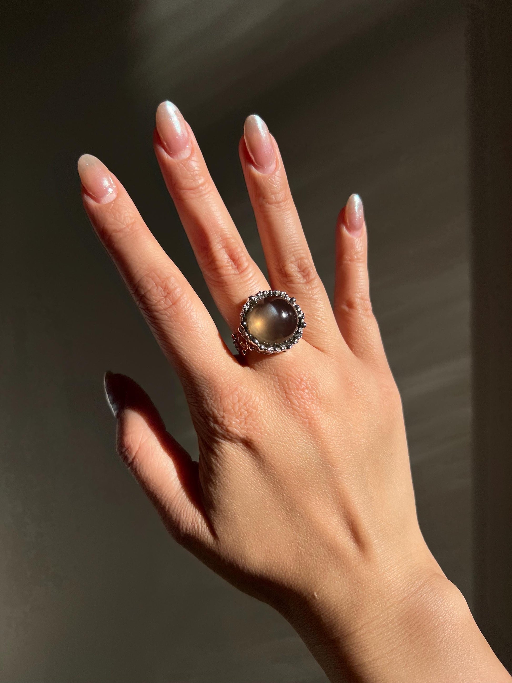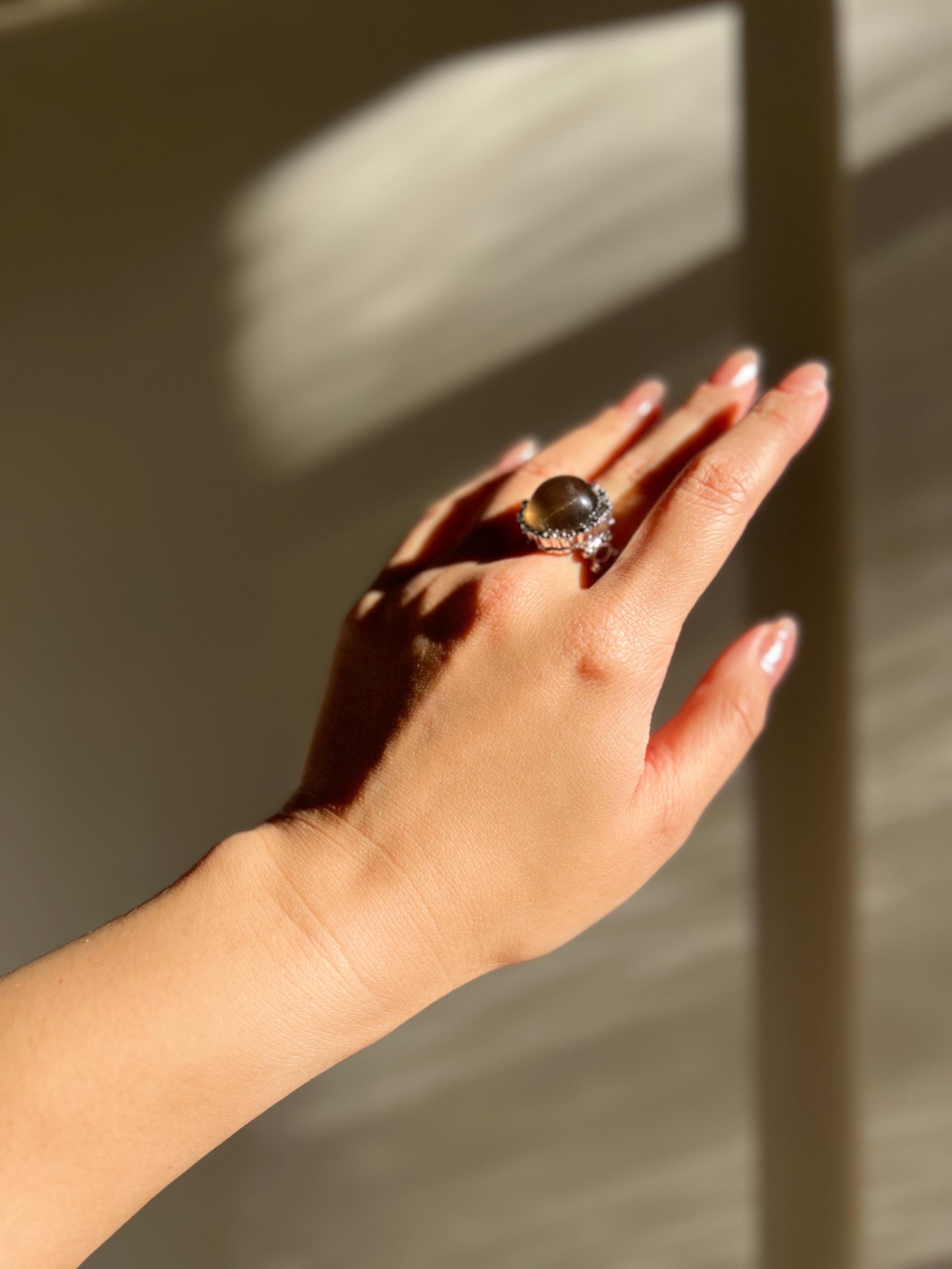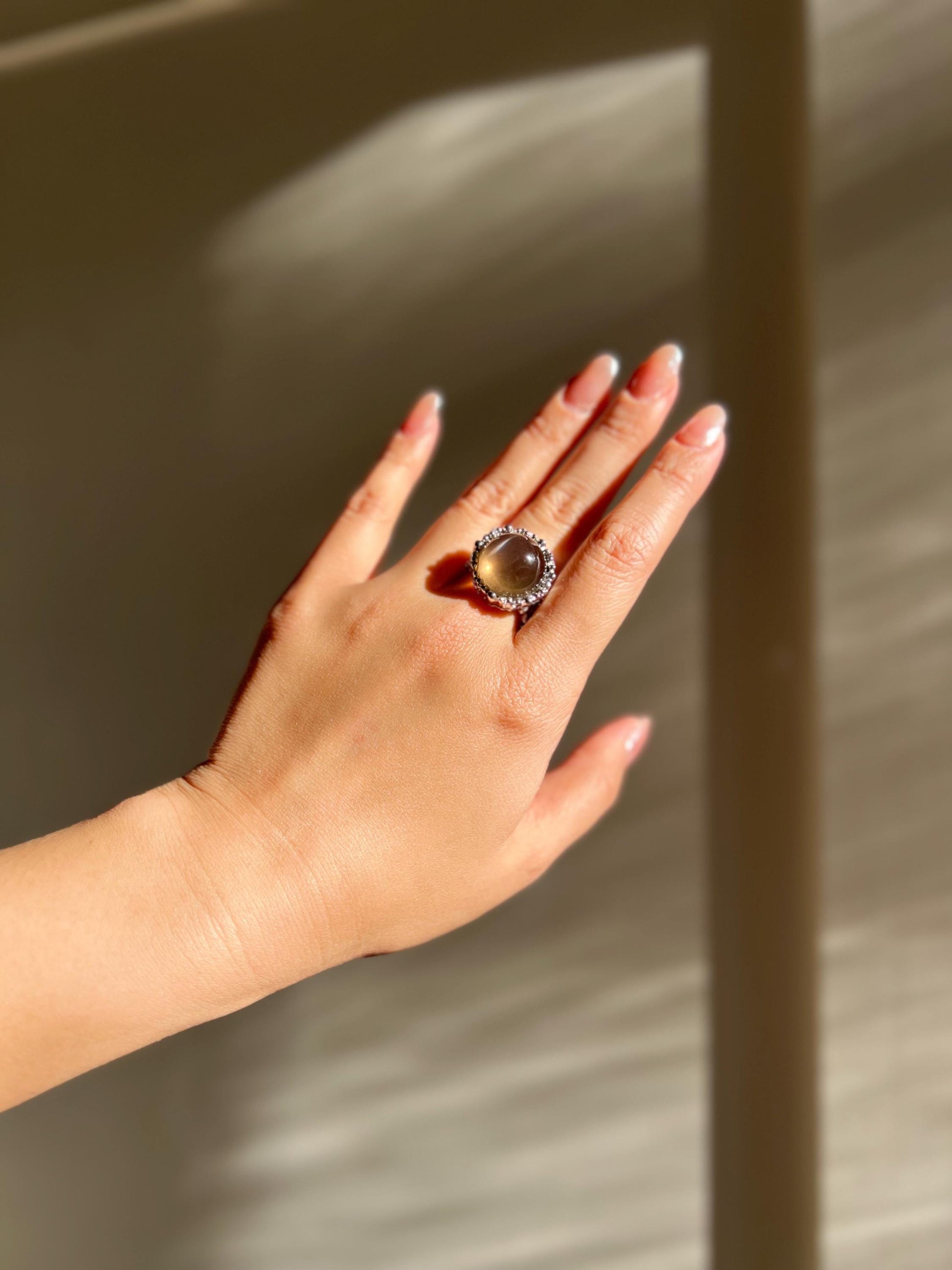 Handcrafted in sterling silver, the luminous cabochon catches sunlight with a fine silver band, symbolizing intuition, mystery, and inner balance.