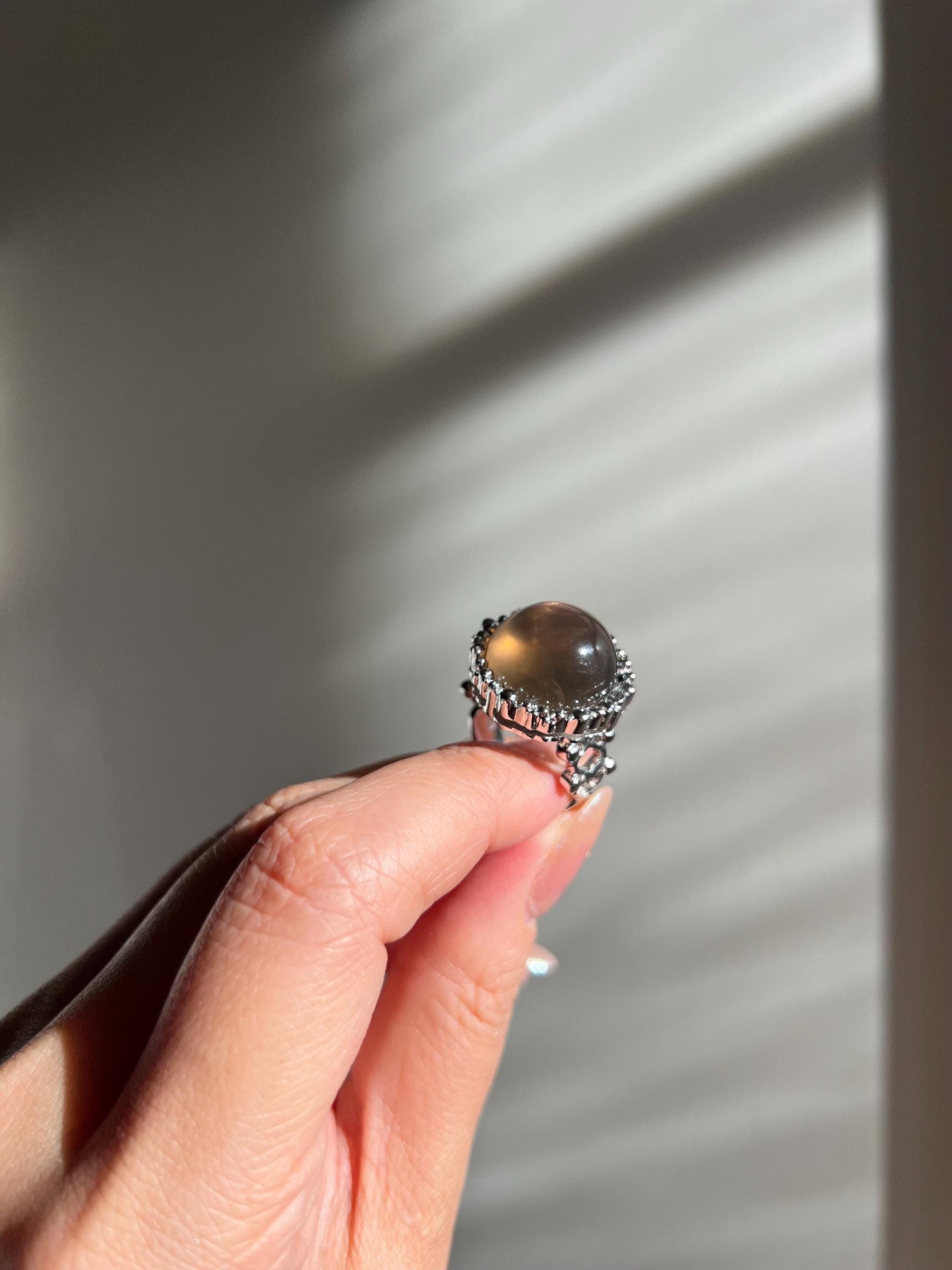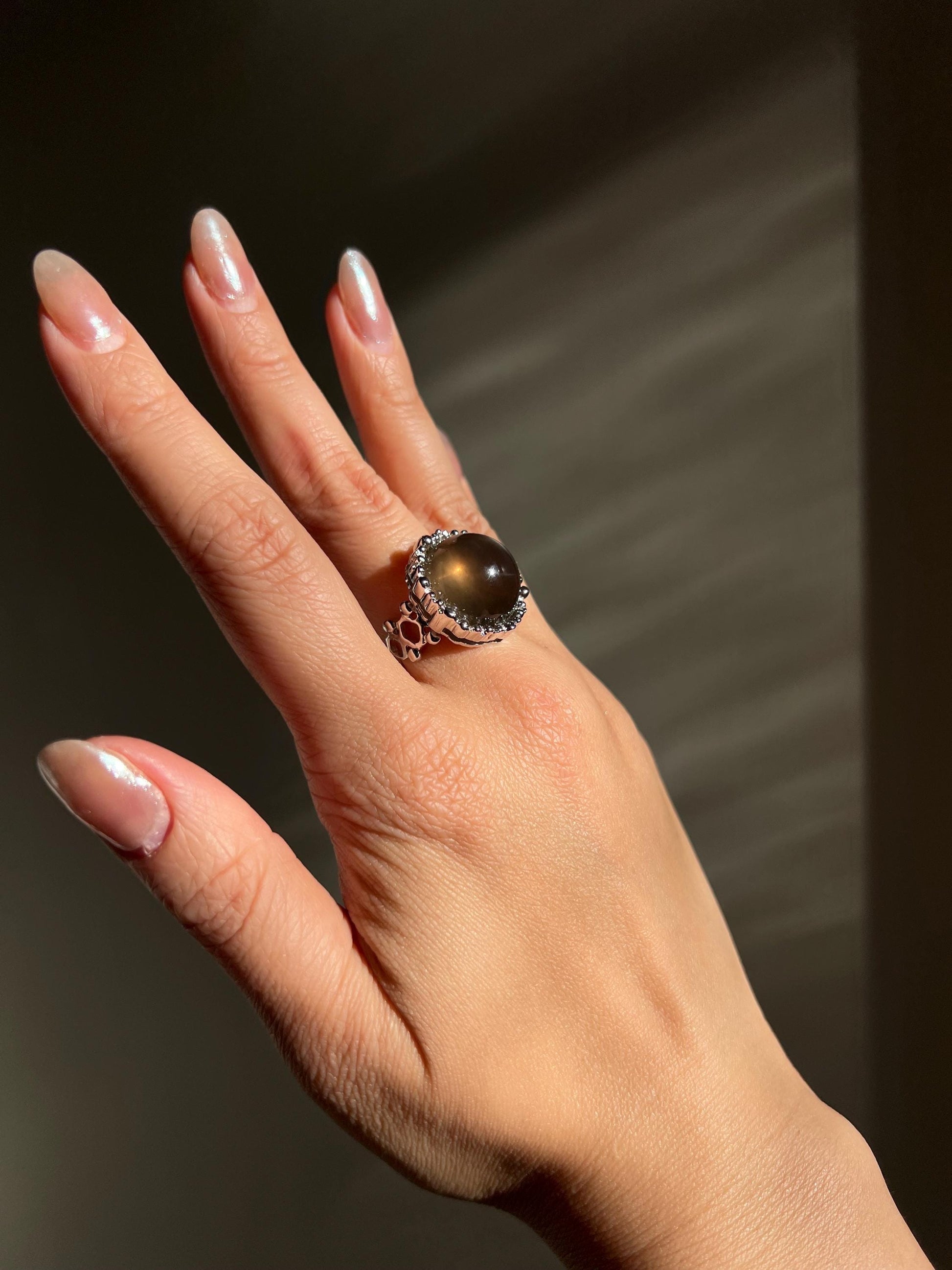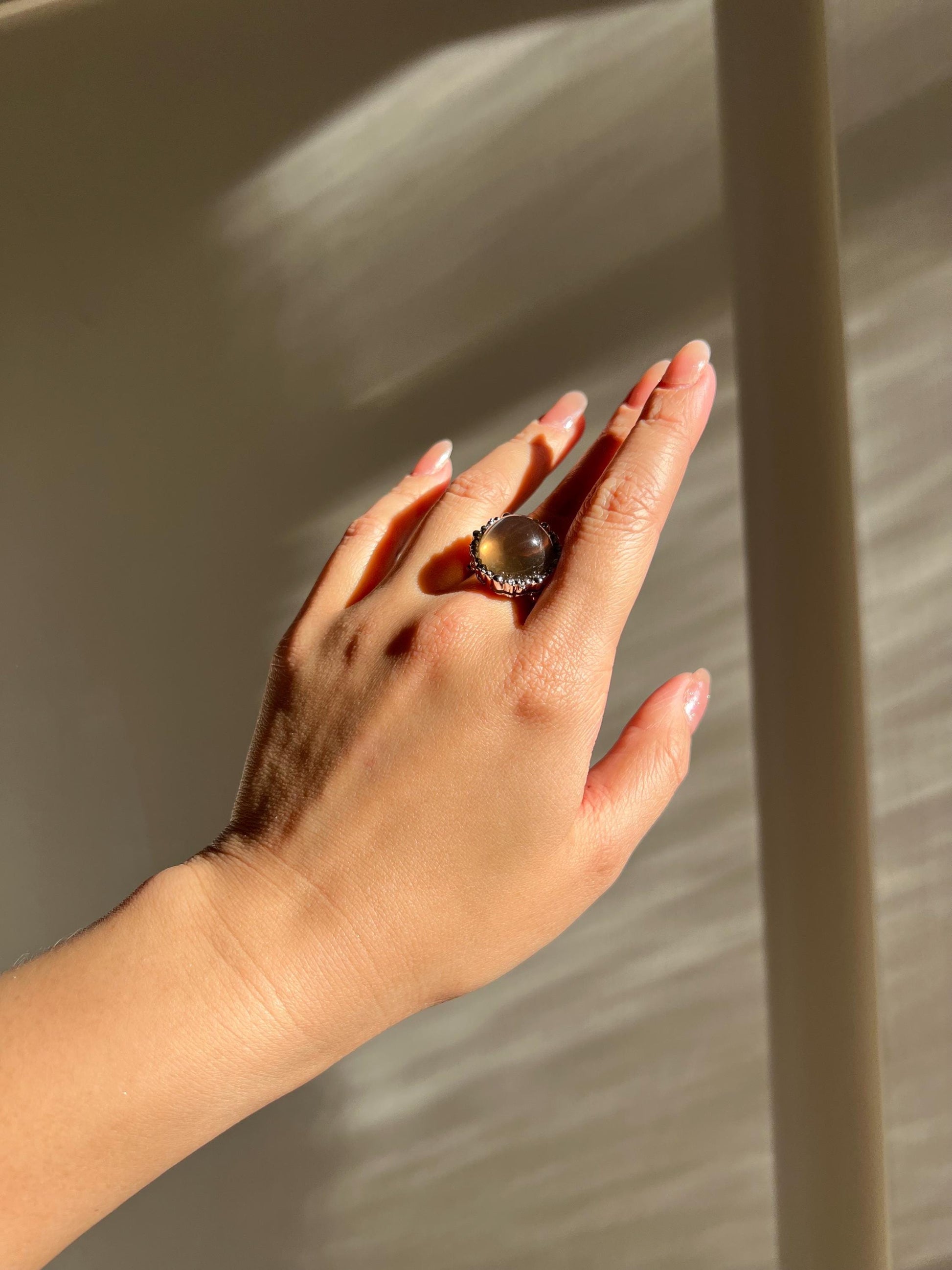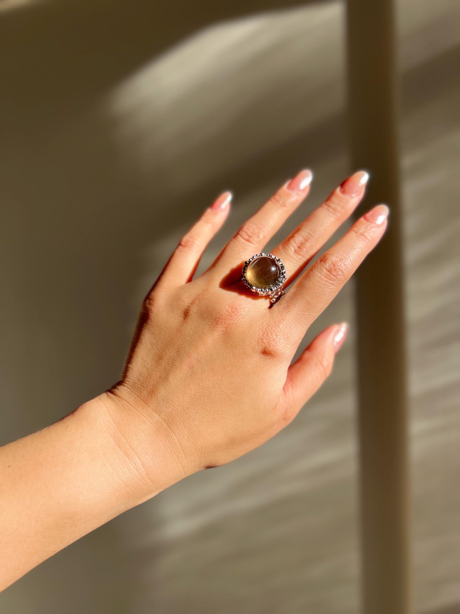 Handcrafted in sterling silver, the luminous cabochon catches sunlight with a fine silver band, symbolizing intuition, mystery, and inner balance.