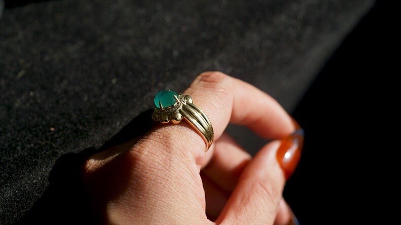 stunning natural Zambian emerald cabochon ring, set in 14k solid gold, embodying a sweet and elegant style. This refined piece blends feminine charm with sophisticated elegance. The emerald features a smooth surface with a subtle cat's eye effect that becomes quite noticeable in sunlight. Truly a one-of-a-kind clean cabochon with a remarkable cat's eye effect.