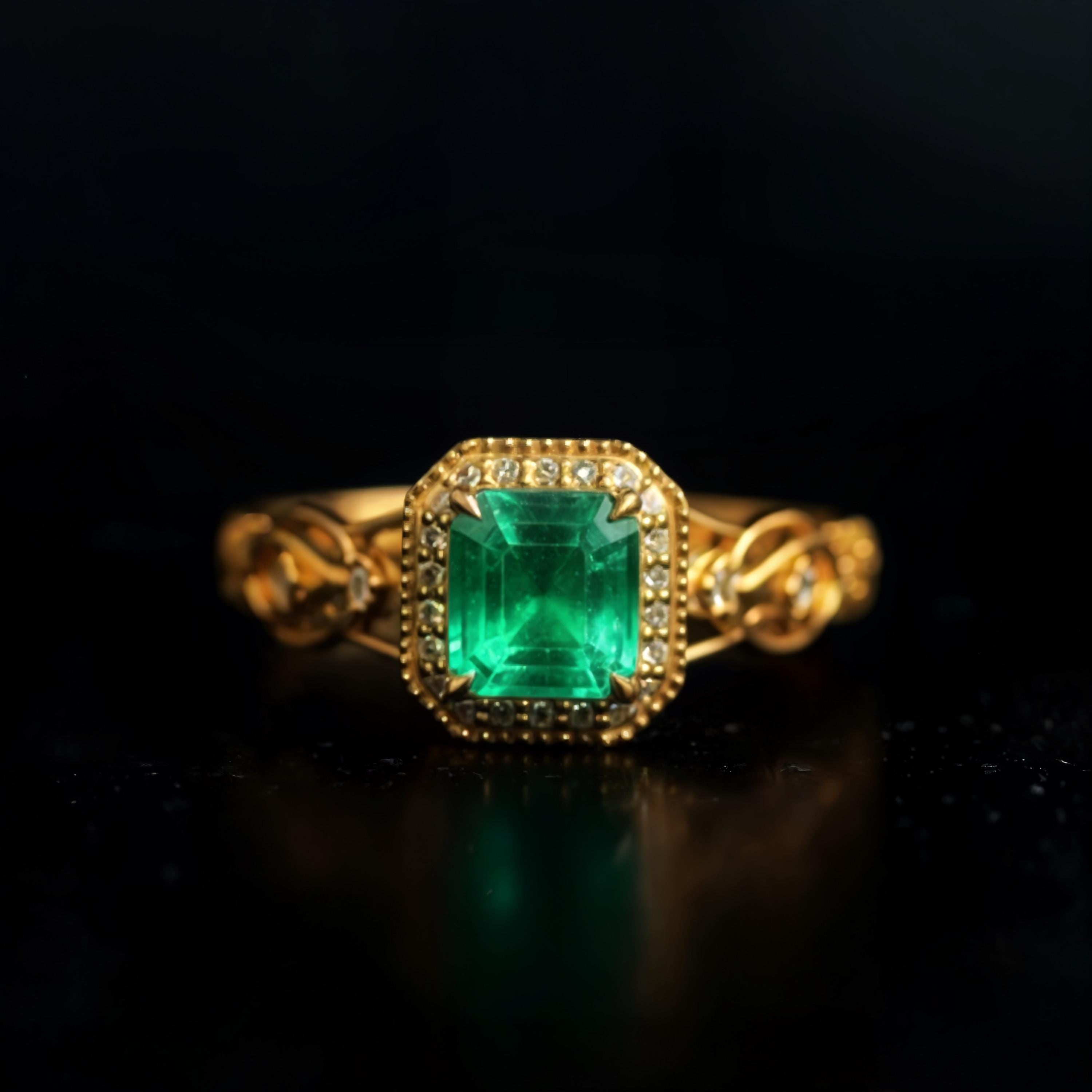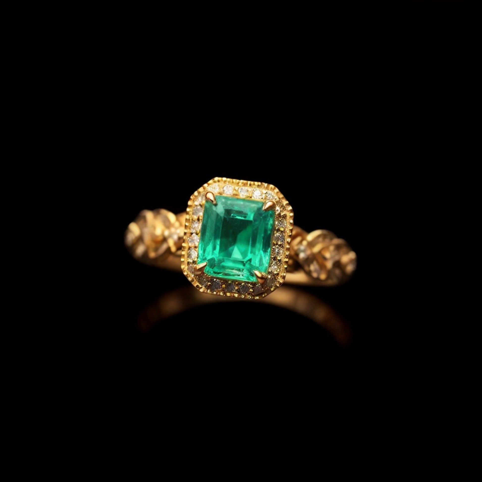 This ring showcases a vivid Muzo Green Colombian emerald (0.54 carat) in an elegant emerald-cut octagonal setting, framed by sparkling natural diamonds. Handcrafted in 18K solid gold, the band features intricate detailing, making it both romantic and enduring.