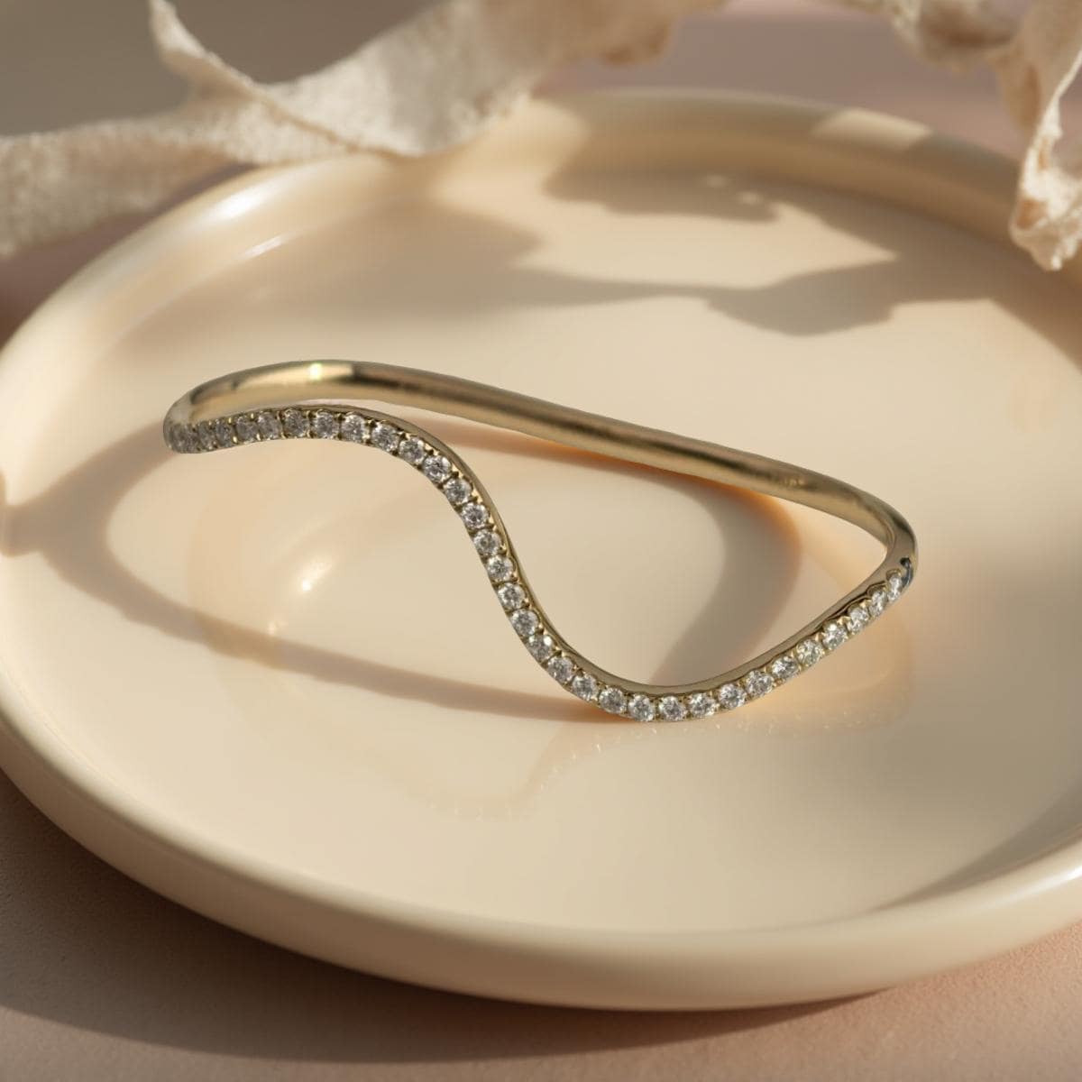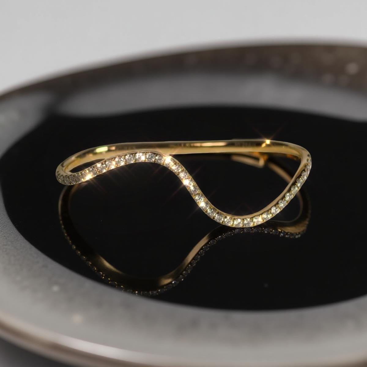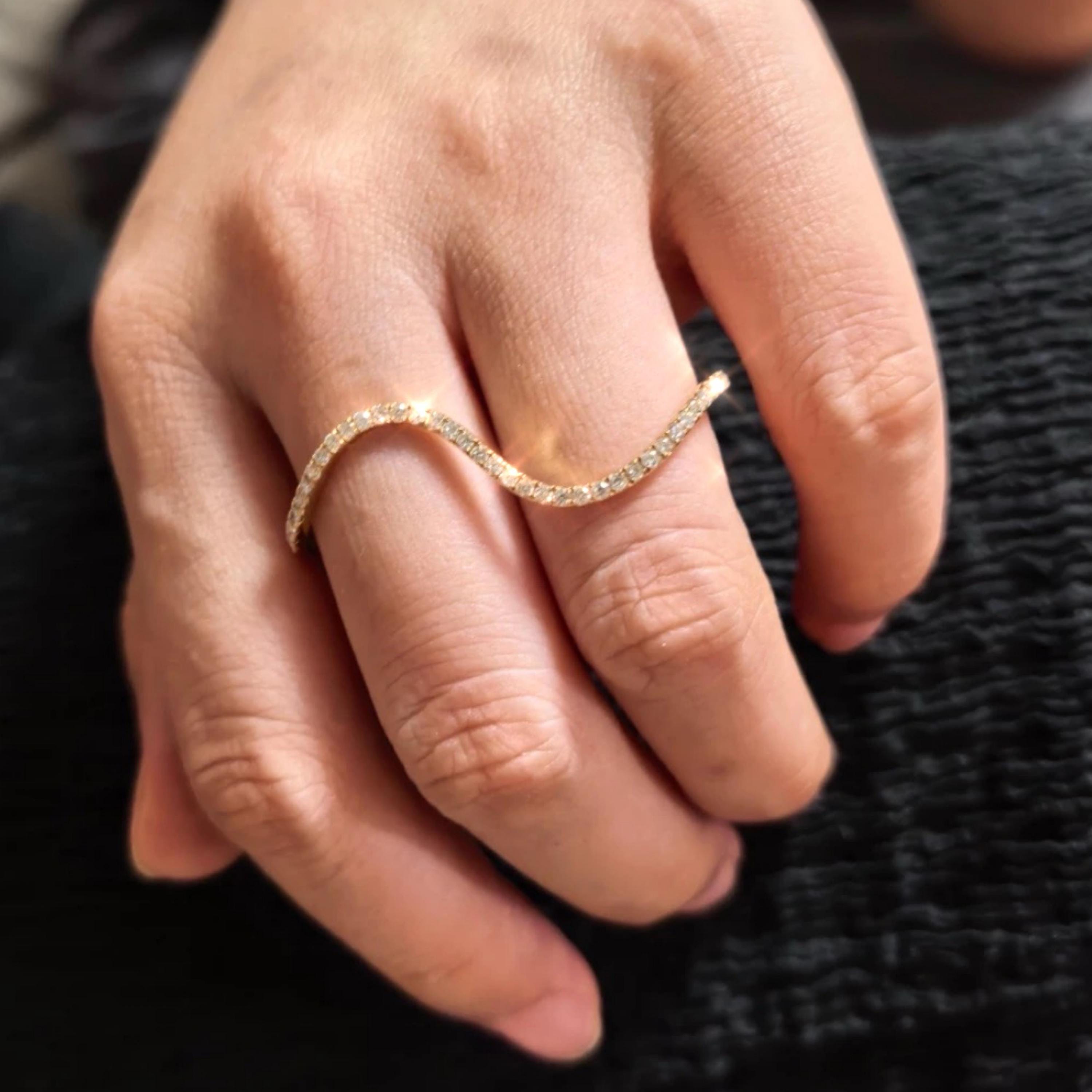 Handcrafted in 18K solid gold and set with natural earth-mined diamonds, this piece flows across your fingers like a ribbon of light. Every stone was carefully chosen for its brilliance (D–E color, VS clarity), ensuring that when the light touches it, it dances back with a quiet fire only natural diamonds can give.