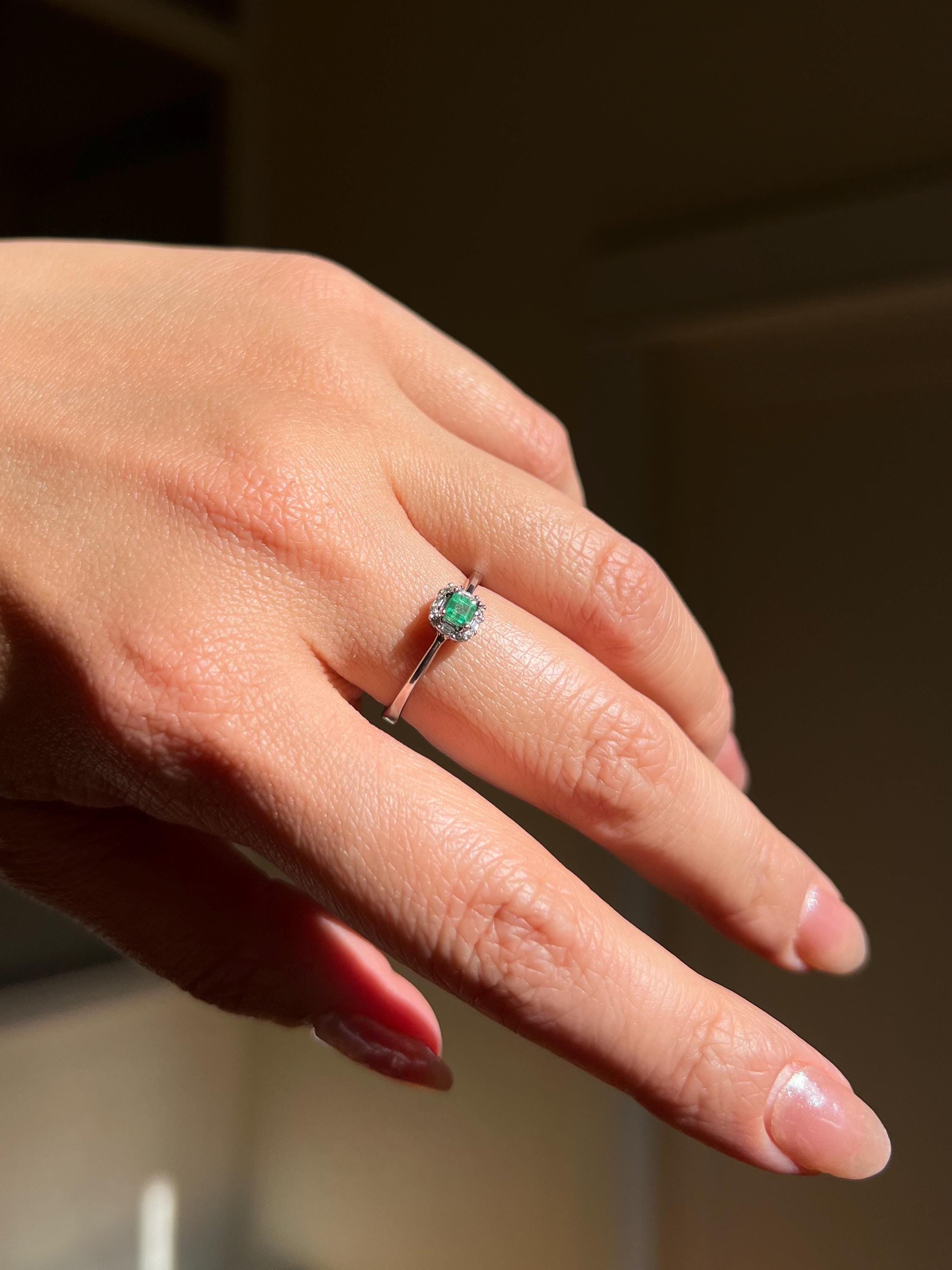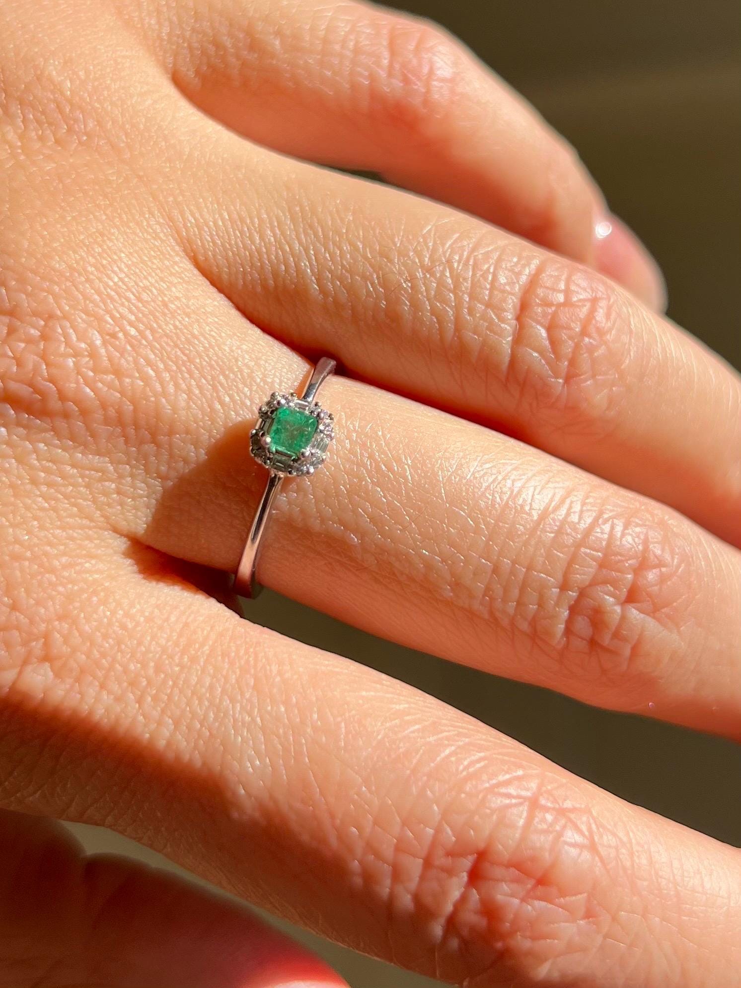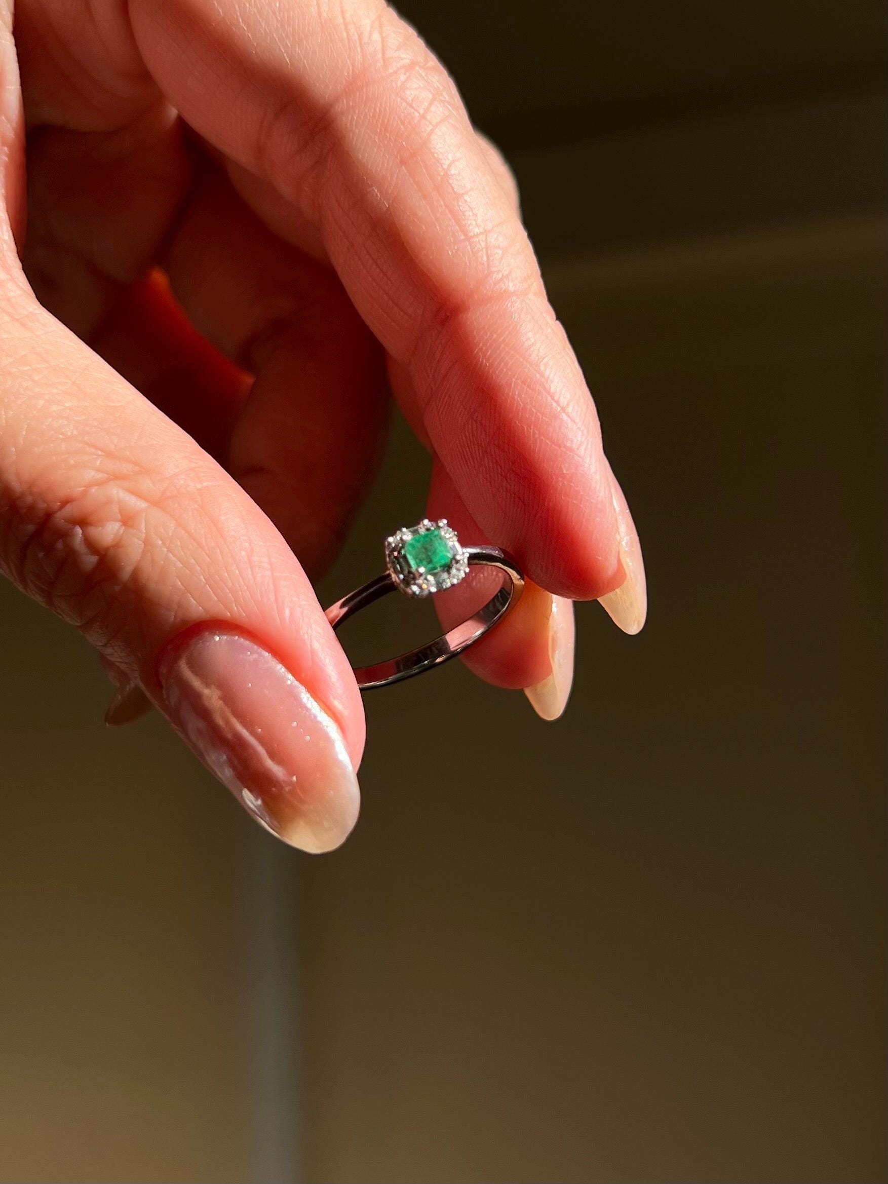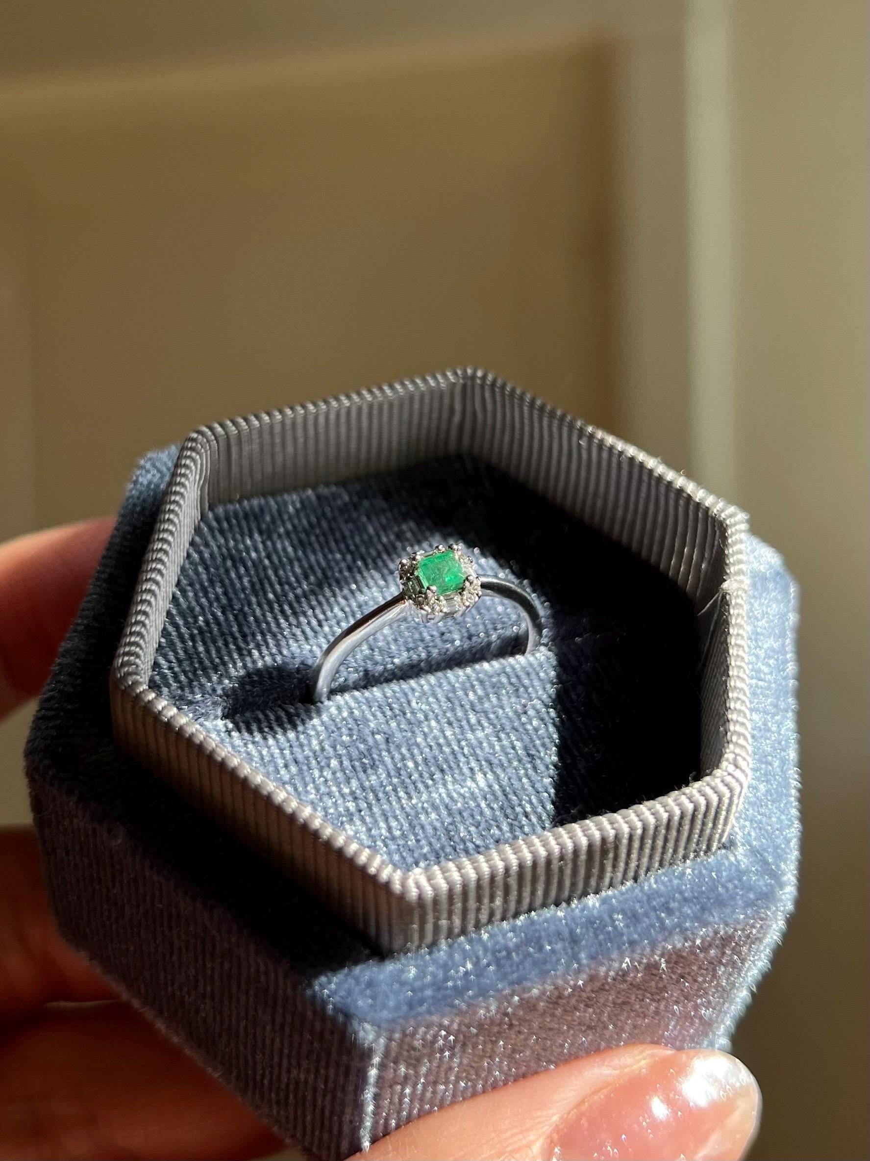 • Gemstone: Featuring a natural emerald, approx. 3 x 3 mm (estimated 0.16 carats), framed with a delicate halo of white sapphires