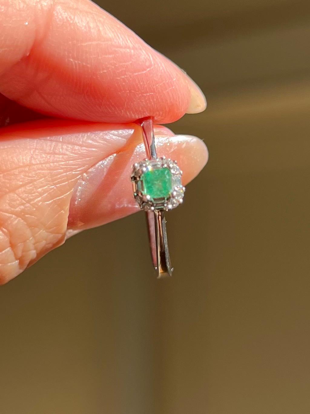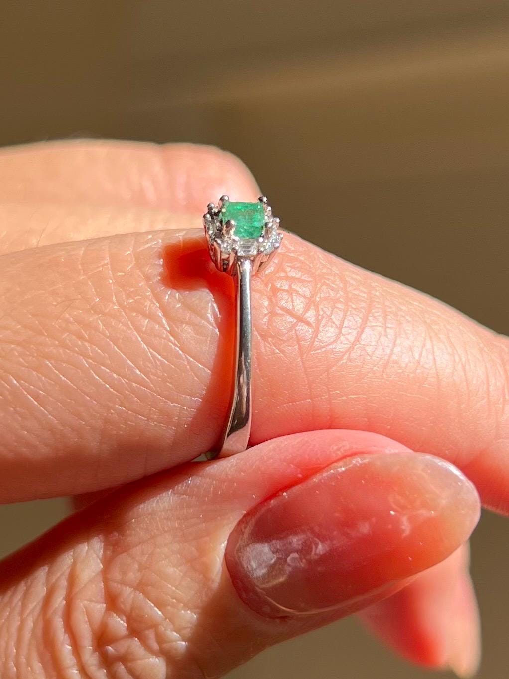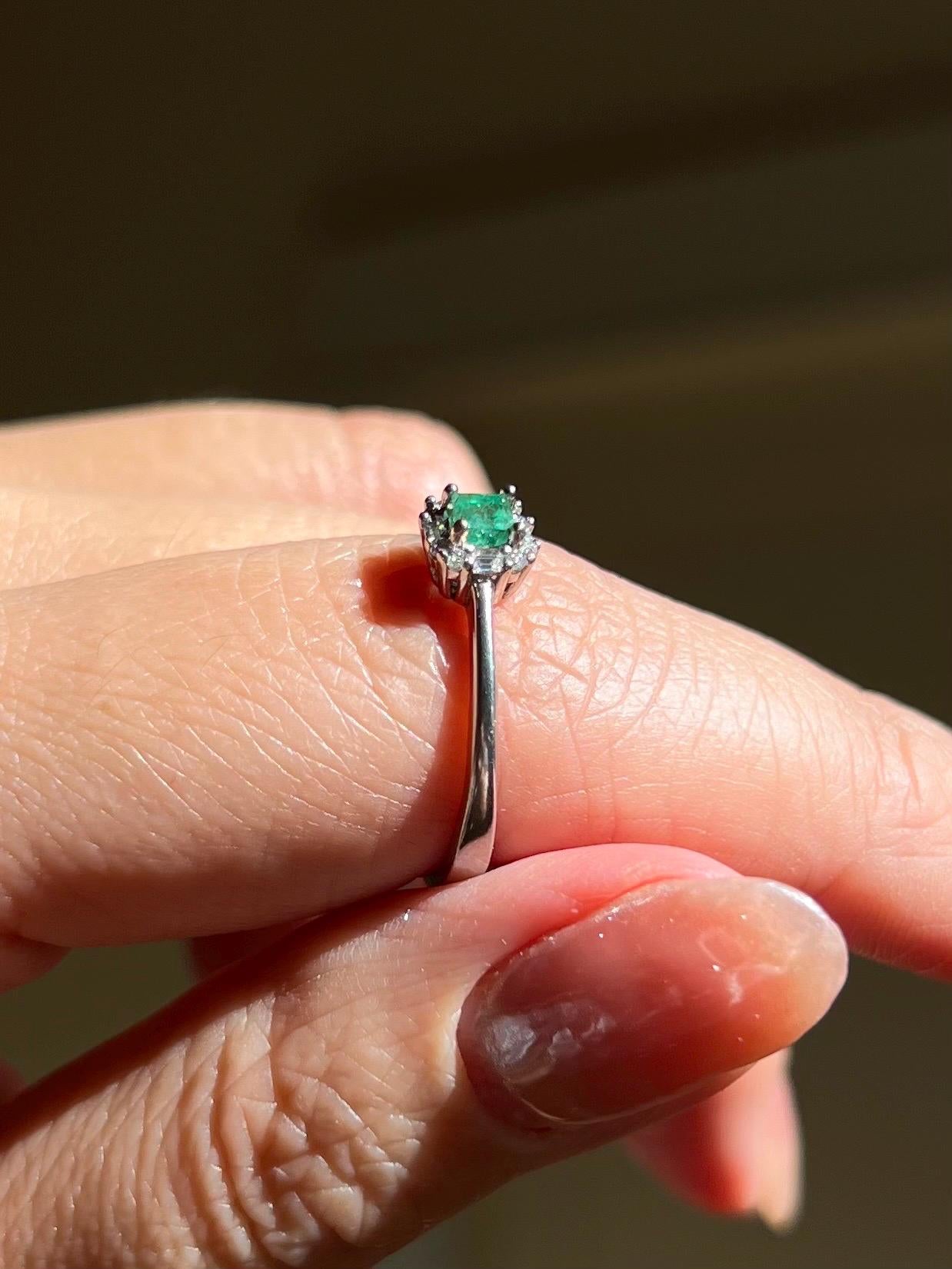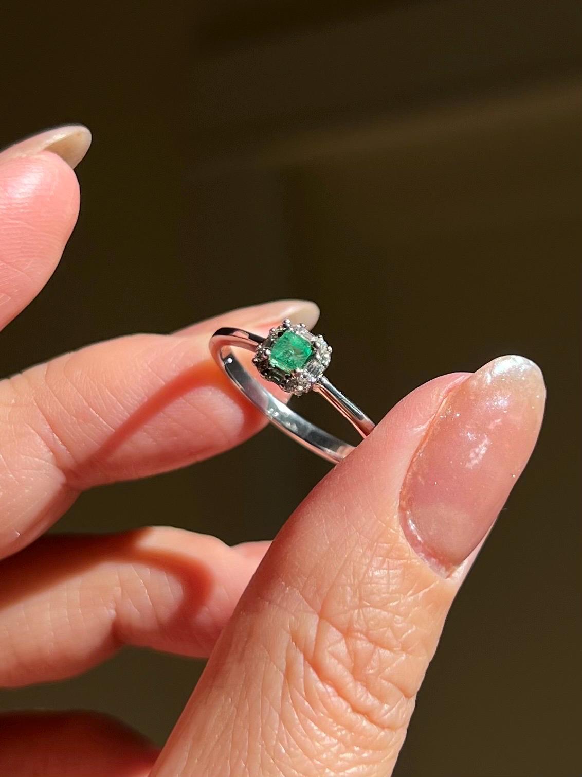 • Gemstone: Featuring a natural emerald, approx. 3 x 3 mm (estimated 0.16 carats), framed with a delicate halo of white sapphires