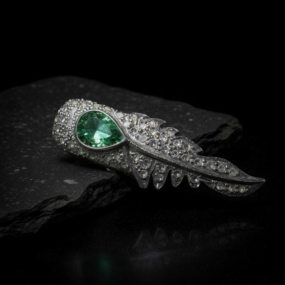 Each feather contour is hand-carved and pavé-set to shimmer from every angle. The Paraiba’s rare neon-green hue is a natural gemstone highlight — a center of luminous intensity.