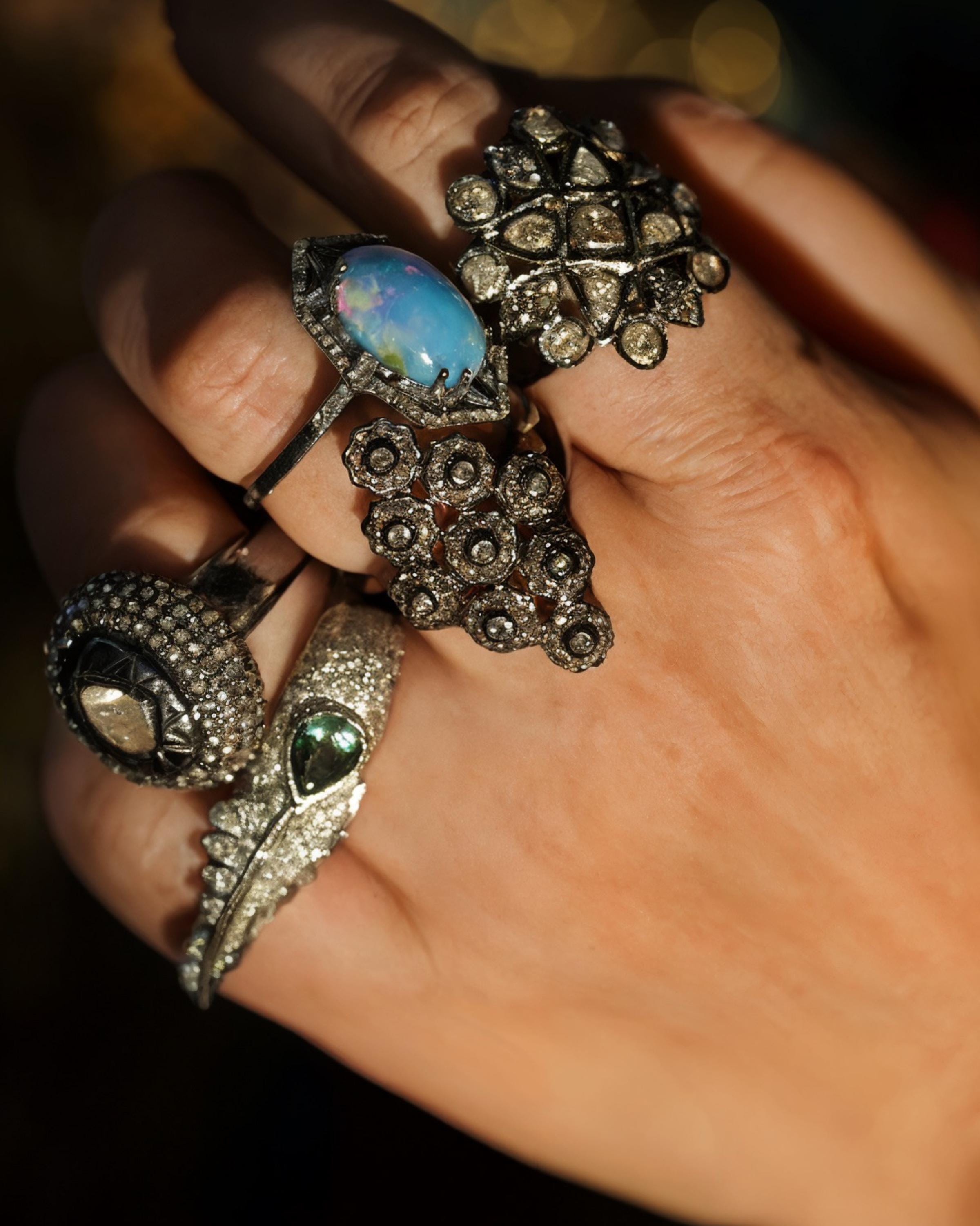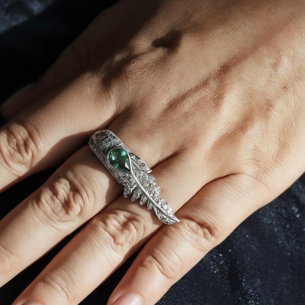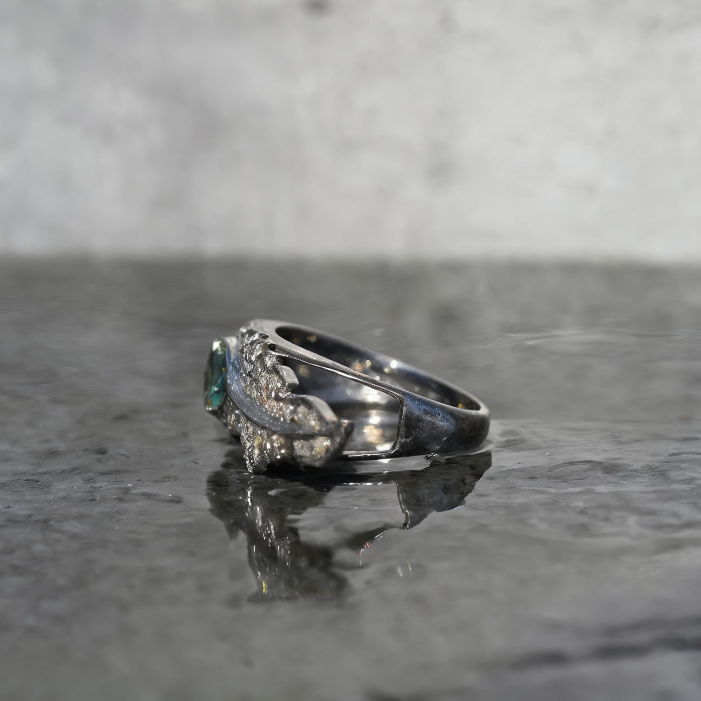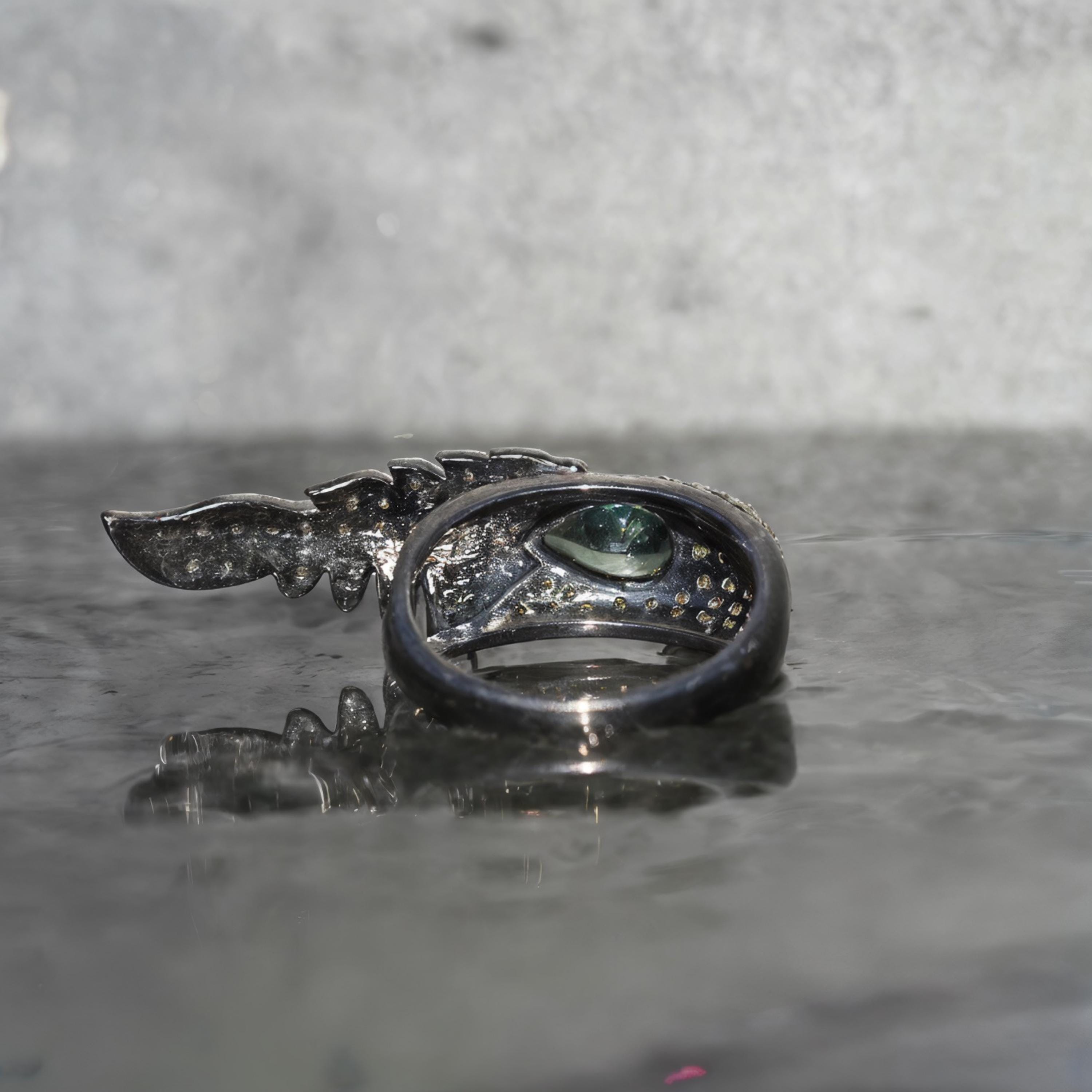 Natural Green Paraiba Tourmaline Feather Ring | Sterling Silver Statement Ring | Natural Champagne Diamond & Raw Diamond | gift for her